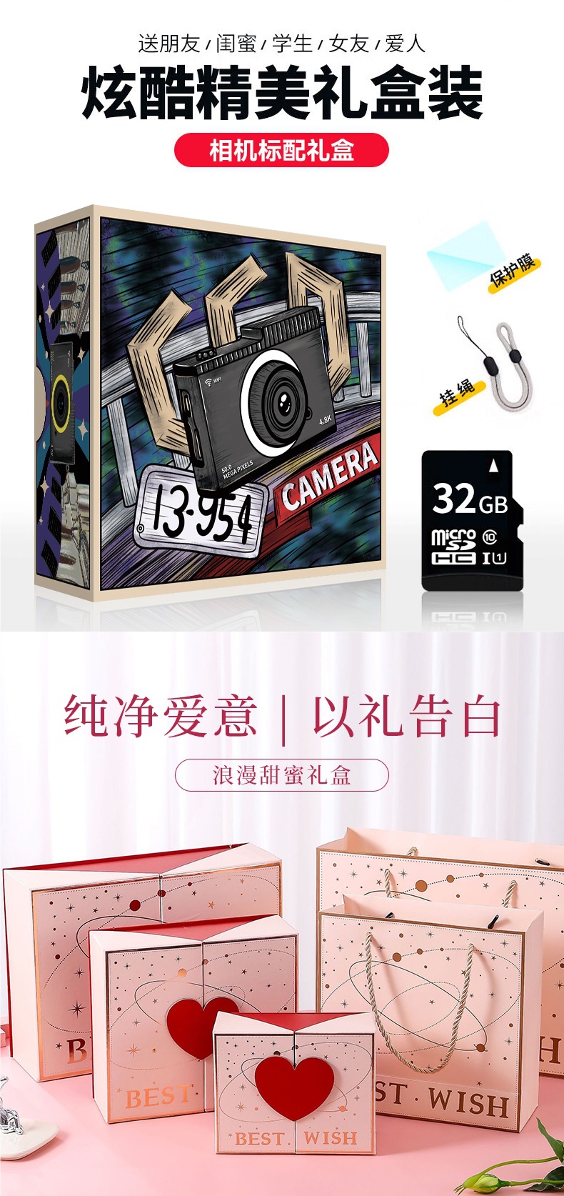 • 로맨틱하고 달콤한 선물 상자 [핑크] 전후 9600w 픽셀 2.4inch 고화질 화면 + 사진 및 비디오 + 만화 프레임 - [업그레이드 패키지 1] 32G 메모리 카드*