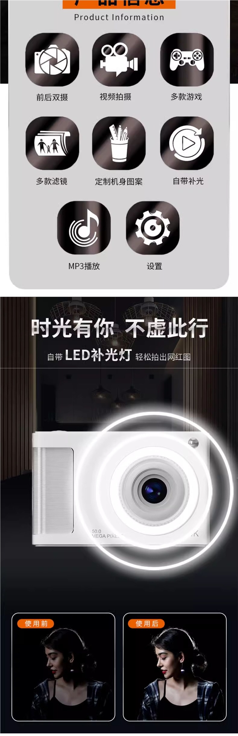 • Xingyao Black [4800W 고화질 픽셀 + 내장 필 라이트 + 다중 필터] - [패키지 2] 64G 메모리 카드 * Type-C 인터페이스