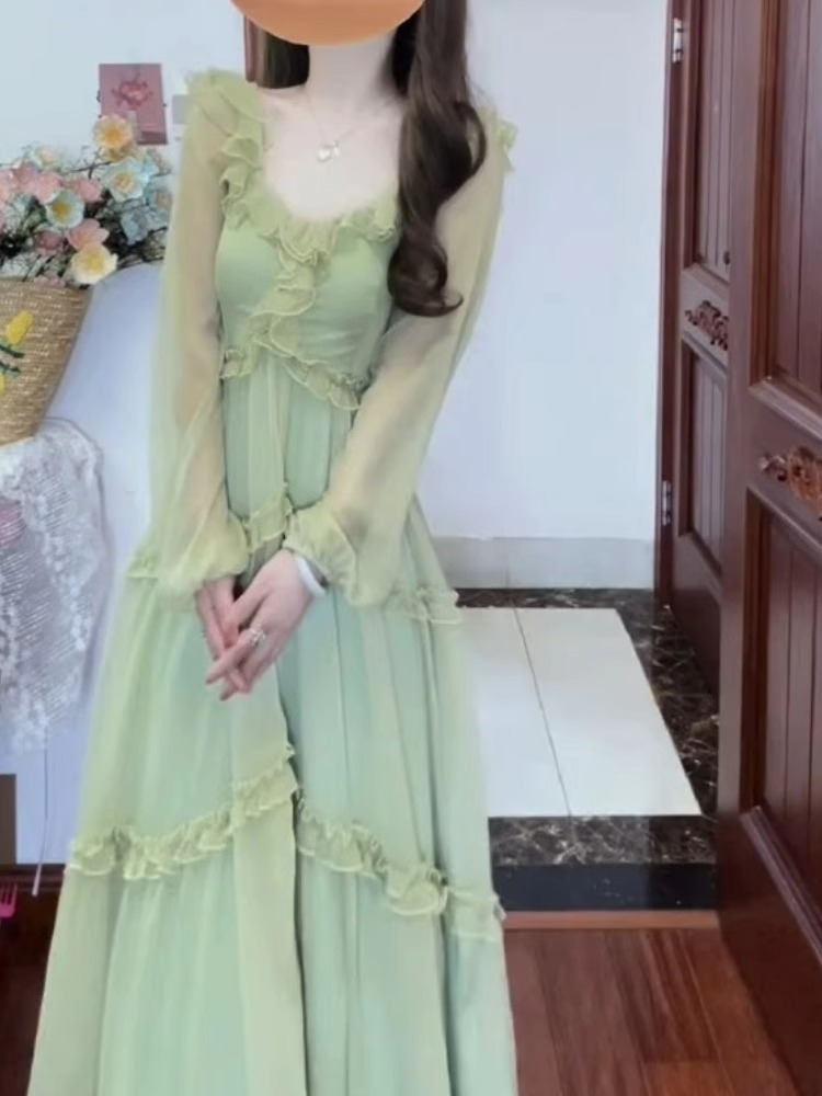 올해 인기있는 2025 봄 프랑스 휴가 원피스 아름다운 녹색 쉬폰/폴리 에스테르 (폴리 에스테르 섬유