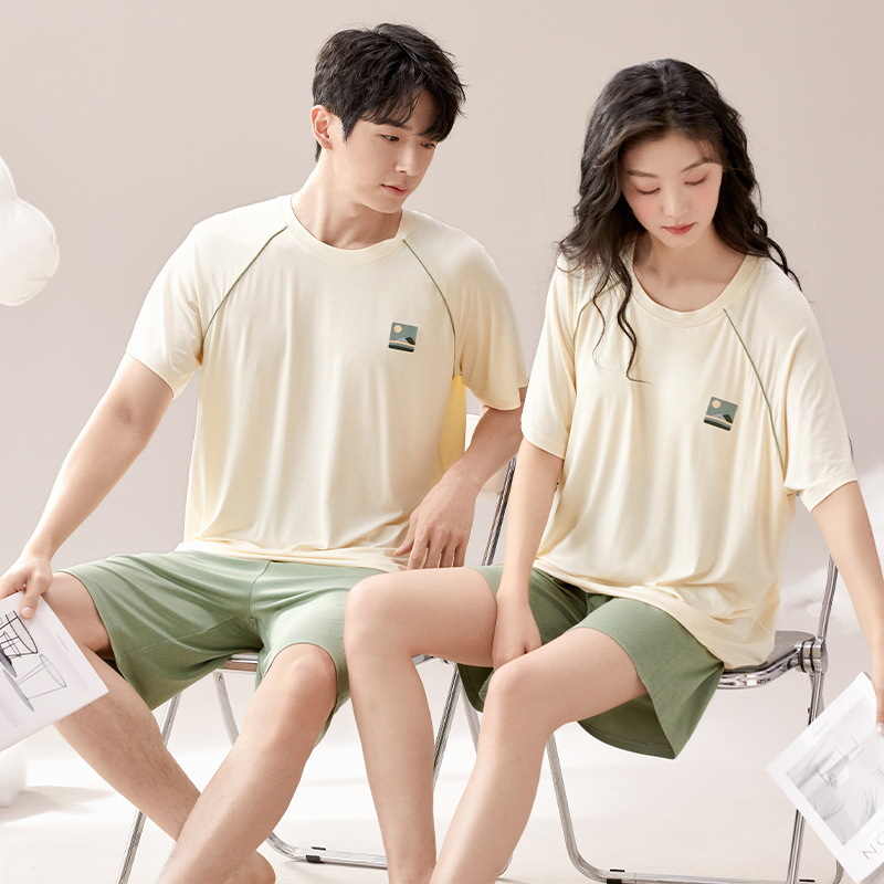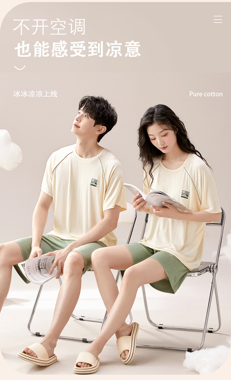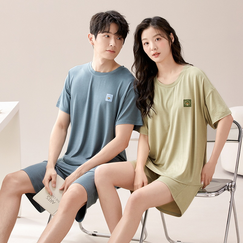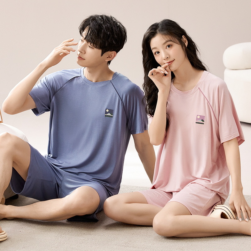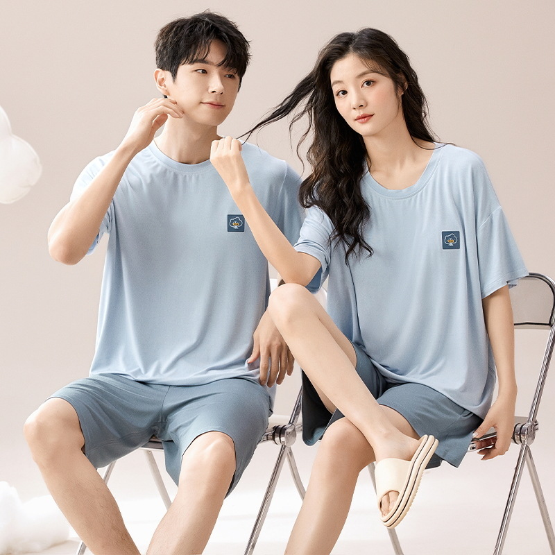 가슴 패드가 있는 모달 코튼 커플 잠옷, 아이스 실크 반팔 여름 잠옷, 반바지, 얇은 남성 및 여성 홈웨어스토어 가기