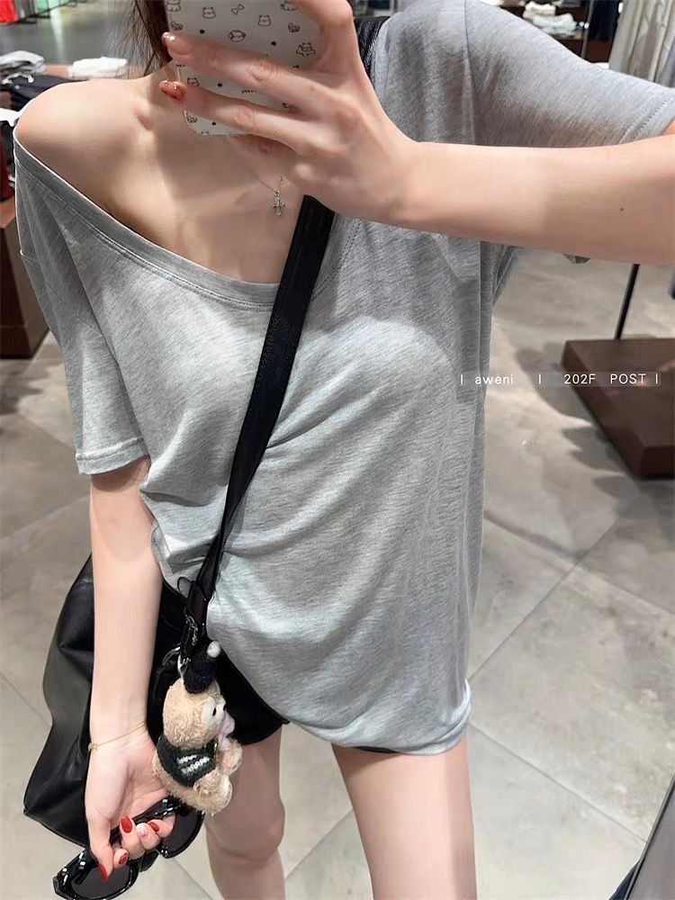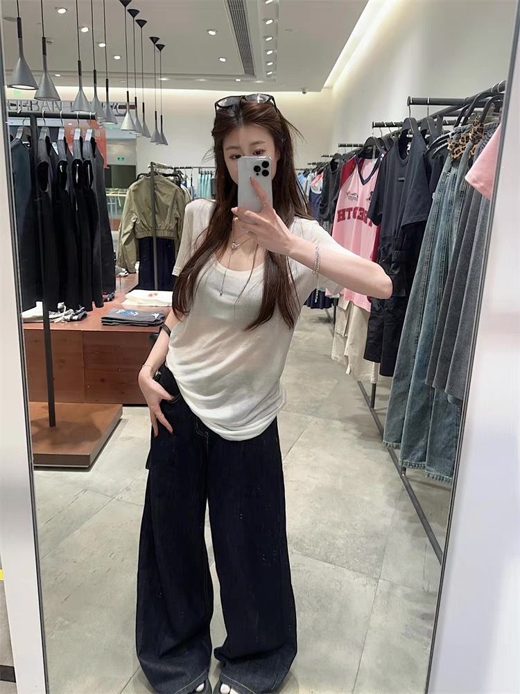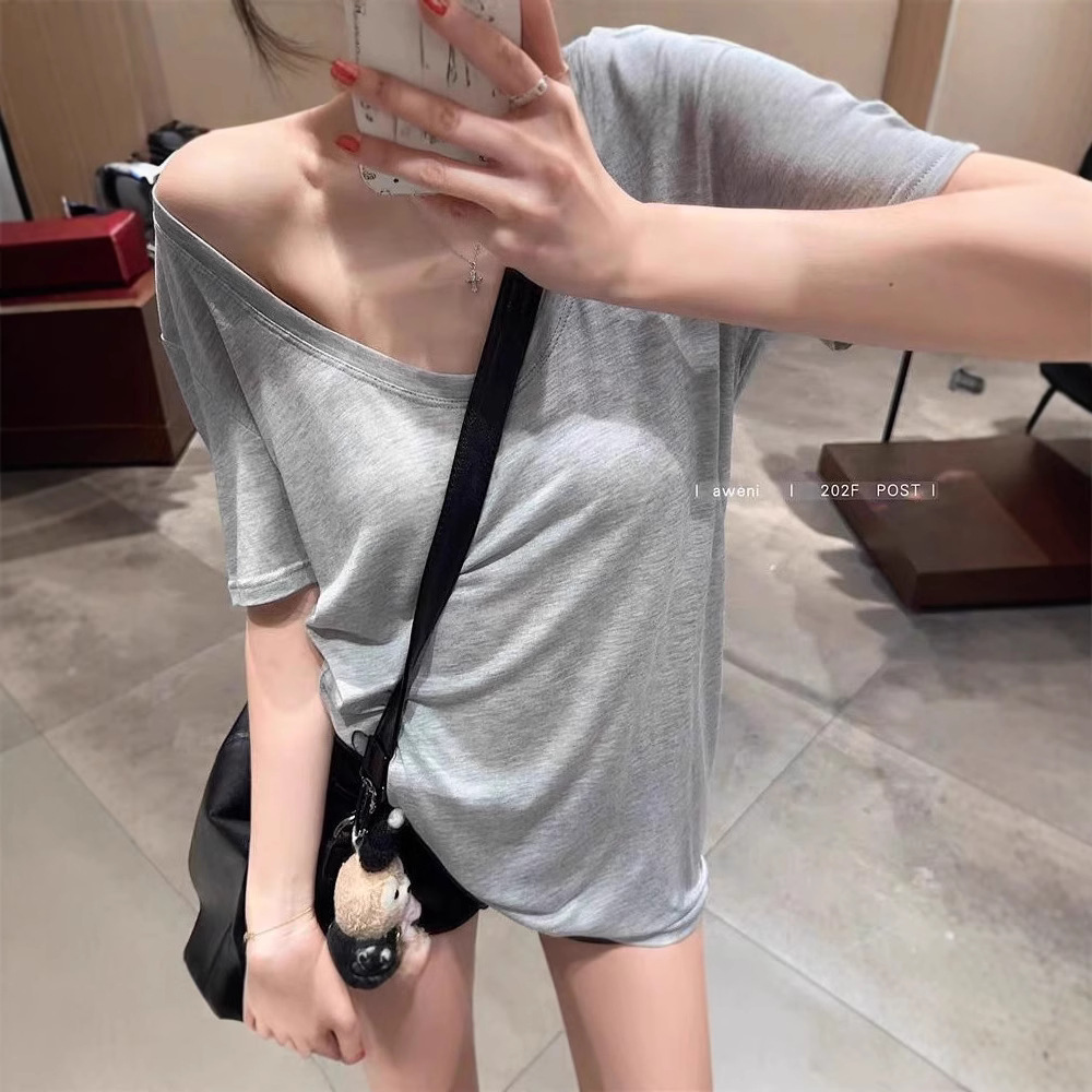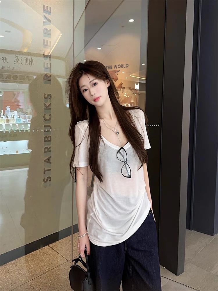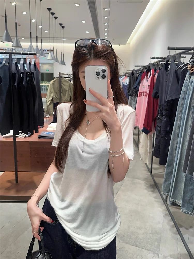 화이트 U 칼라 어깨 짧은 소매 마스크 티셔츠 여성 여름 2025 새로운 얇은 마이크로 투명 루즈 스타일 올매치 탑스토어 가기