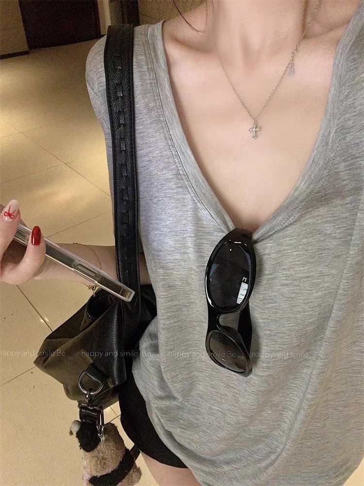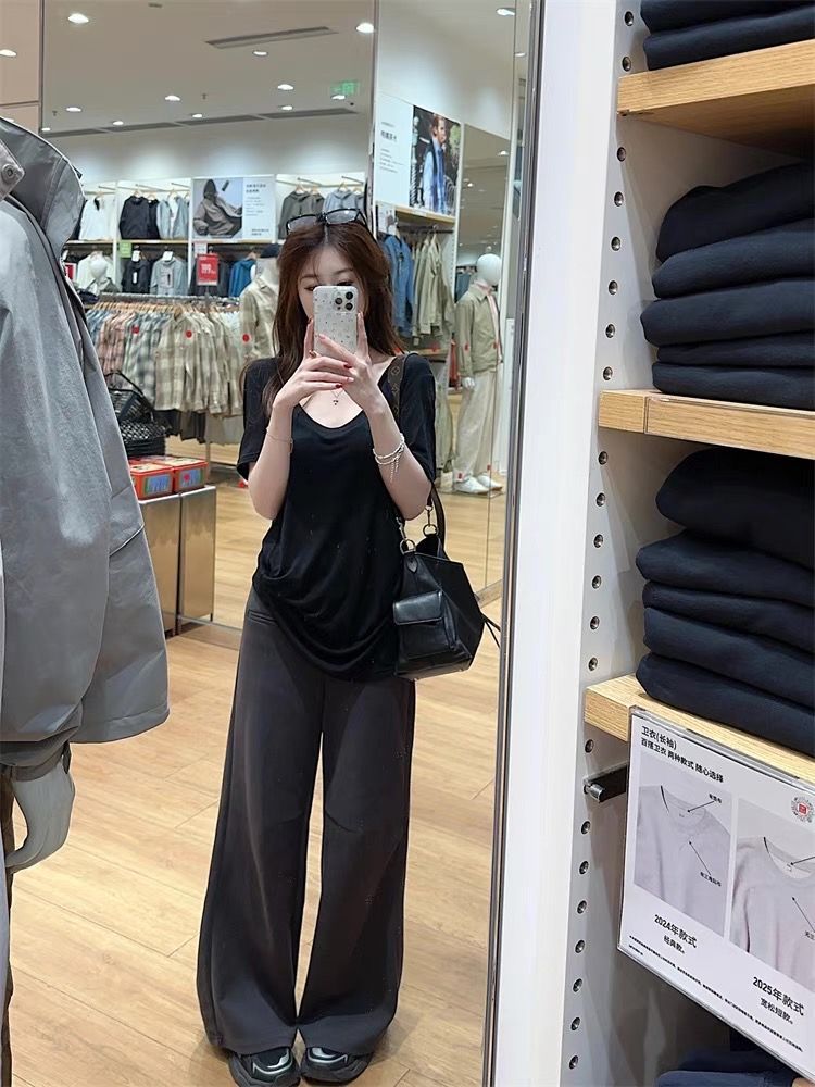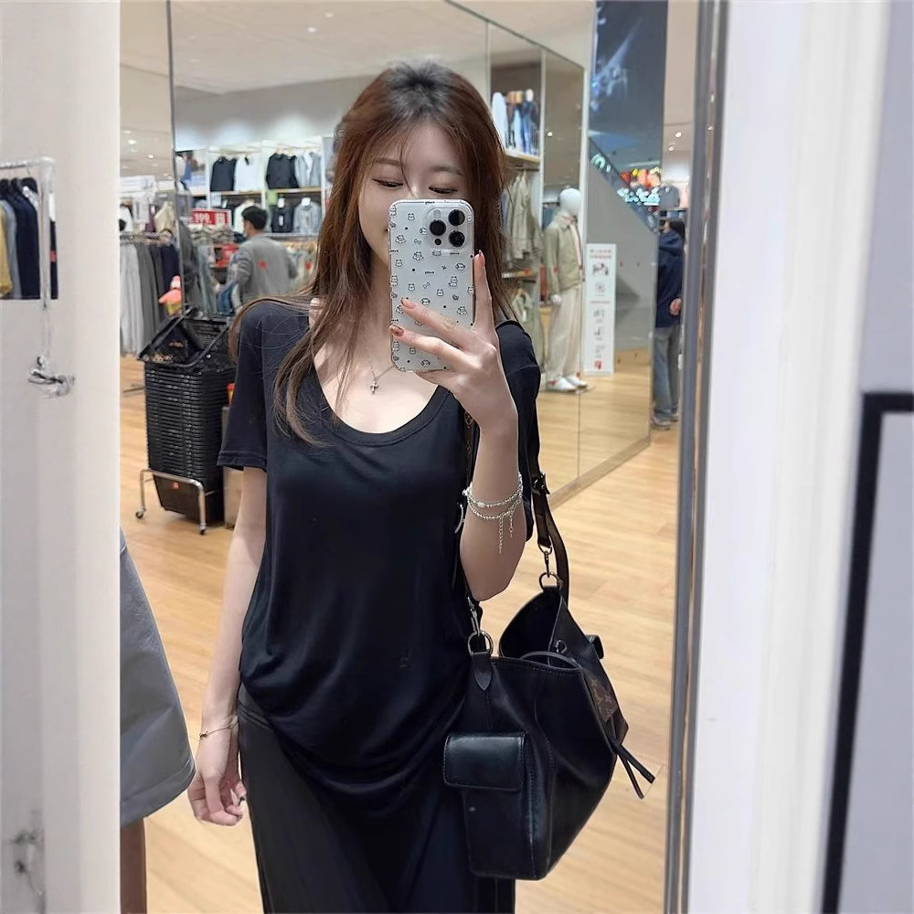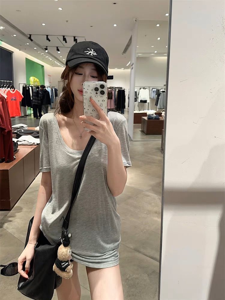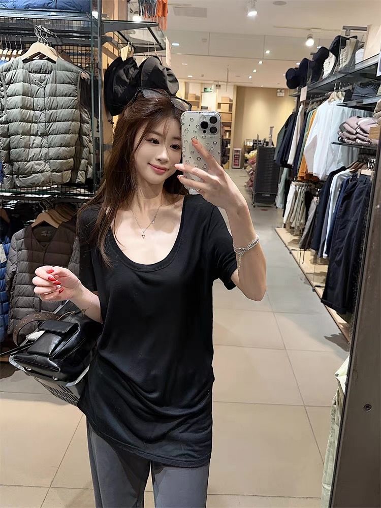 화이트 U 칼라 어깨 짧은 소매 마스크 티셔츠 여성 여름 2025 새로운 얇은 마이크로 투명 루즈 스타일 올매치 탑스토어 가기