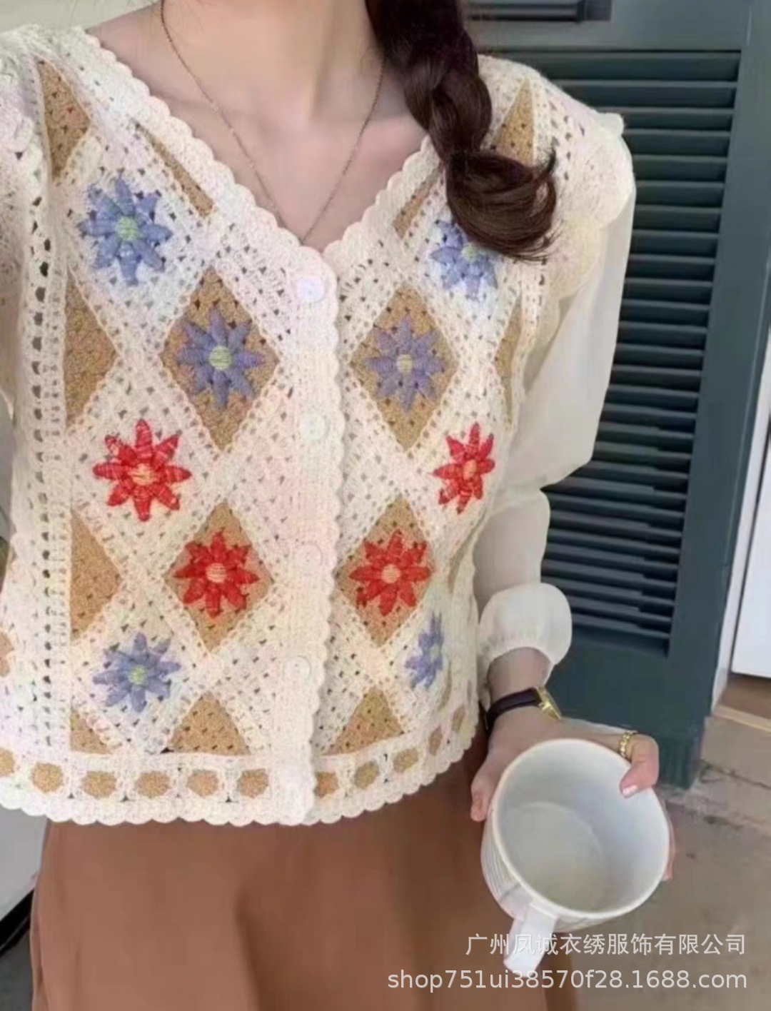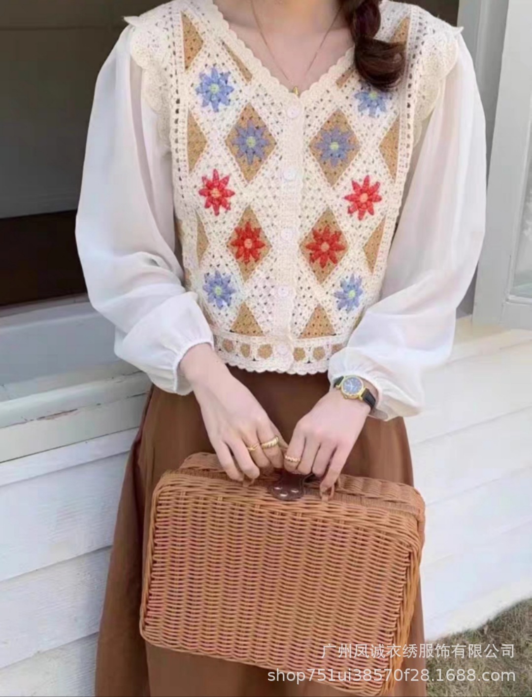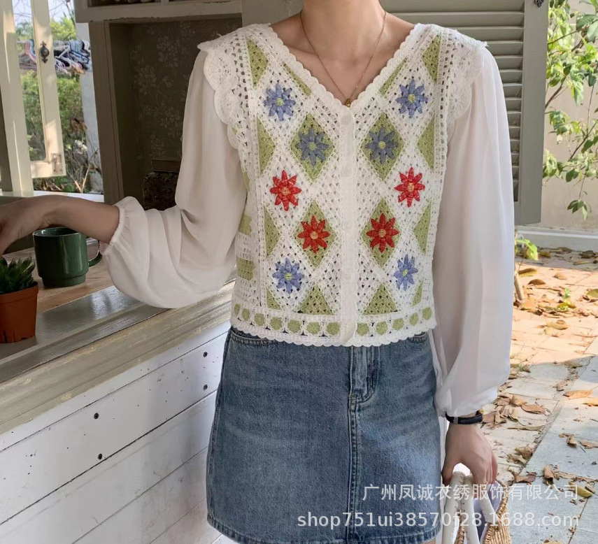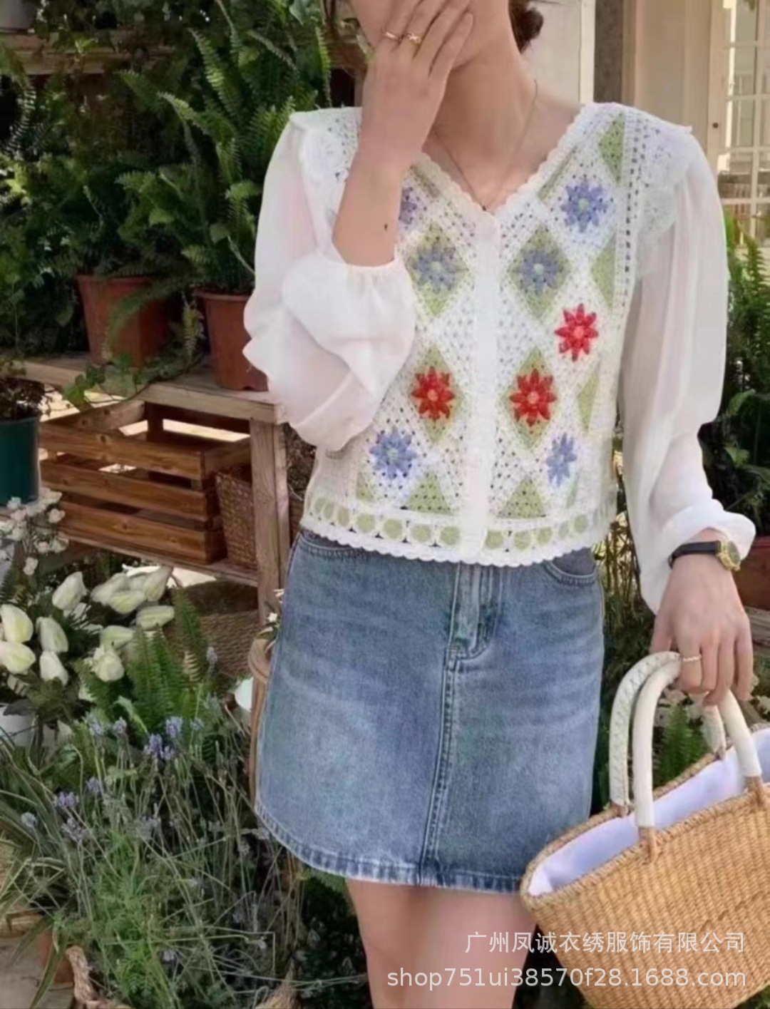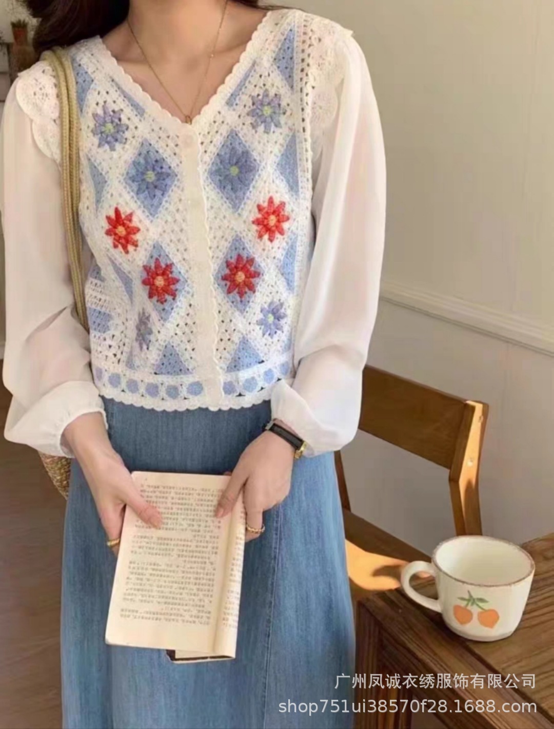 디자인된 틈새 크로셰 중공 자수 스플라이스 쉬폰 긴팔 셔츠 여성용 쇼트 탑스토어 가기