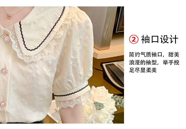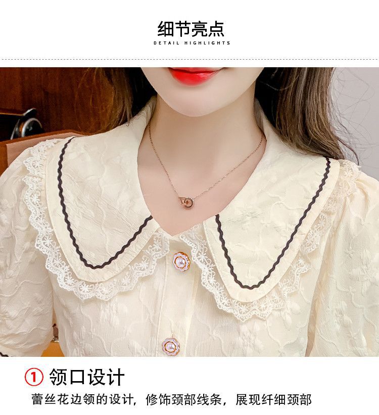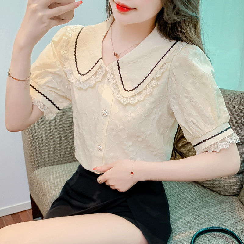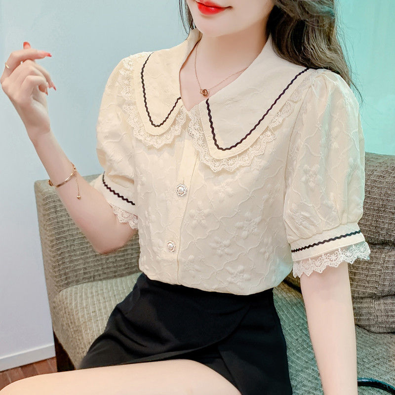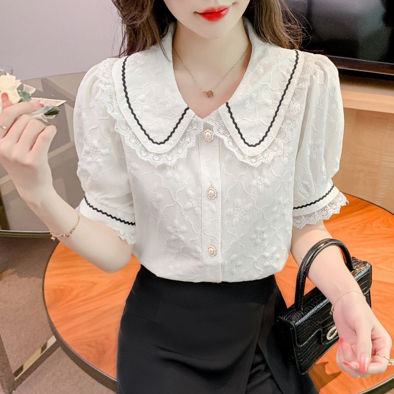프렌치 하이엔드 스위트 인형 칼라 꽃무늬 퍼프 슬리브 쉬폰 레이스 탑 슬리밍 짧은 소매 탑스토어 가기