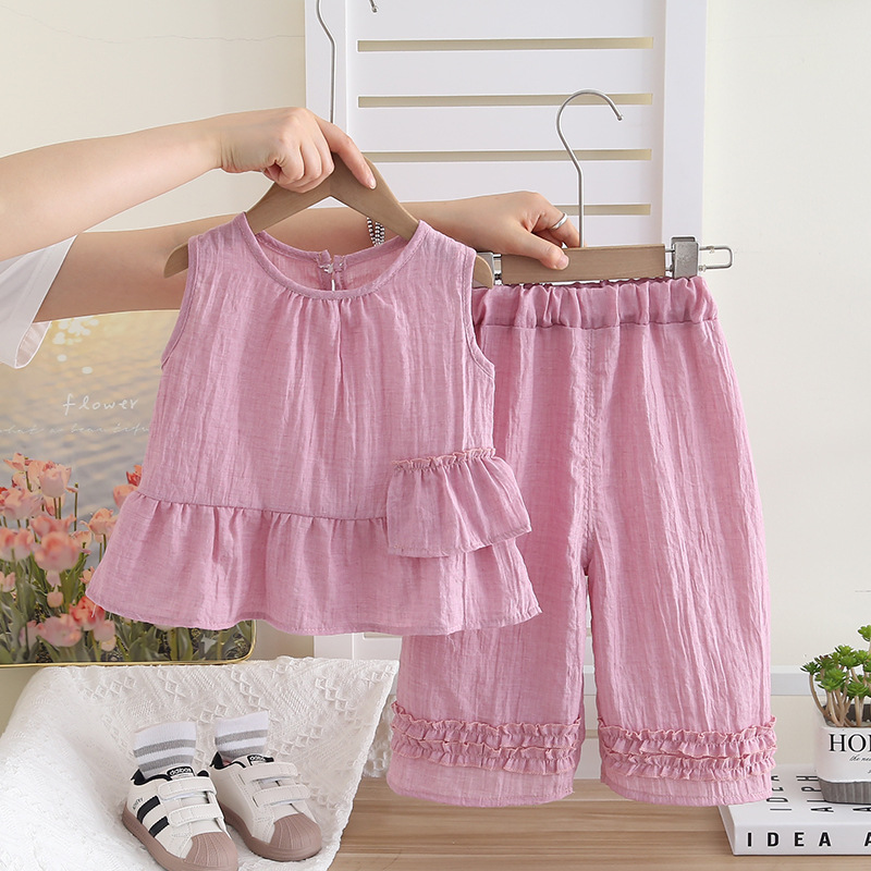 2025 신간 걸스 여름 민소매 여름 원피스 0-5 년 된 조끼 세트 바지 투피스 아동복 유행 머리