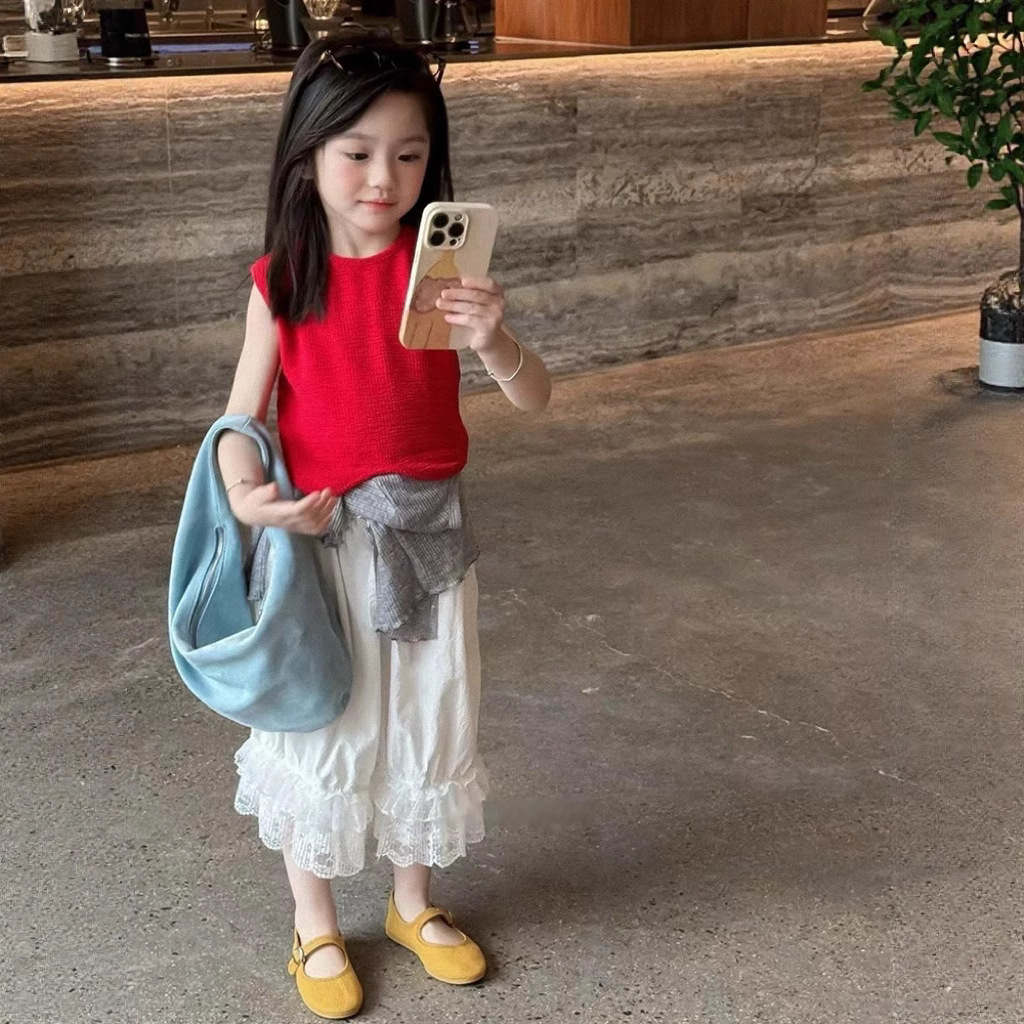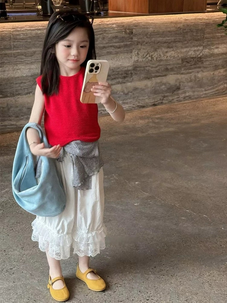 아동복 소녀 서양식 세트 여름 빨간 조끼 반팔 레이스 바지 어린이 아기의 여름 패션