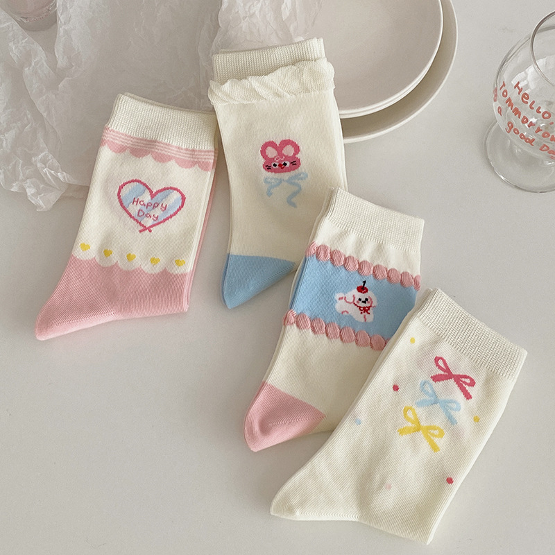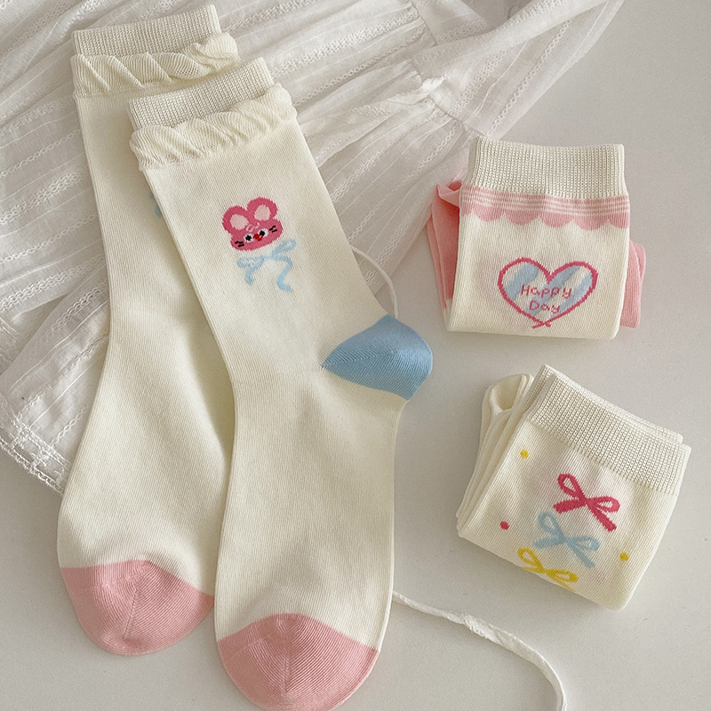 여성용 흰색 양말 봄, 가을 귀여운 만화 핑크 나비 양말 일본 여름 얇은 양말스토어 가기
