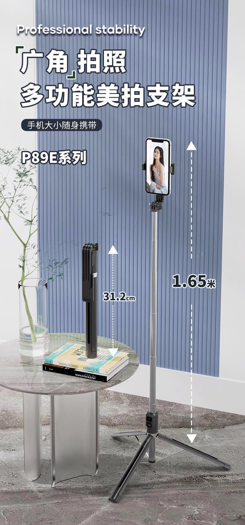 P89E 스테인레스 스틸 휴대 전화 셀카 스틱 블루투스 사진 및 비디오 촬영 기능이있는 텔레스코픽 바닥 라이브 방송 삼각대 스탠드스토어 가기