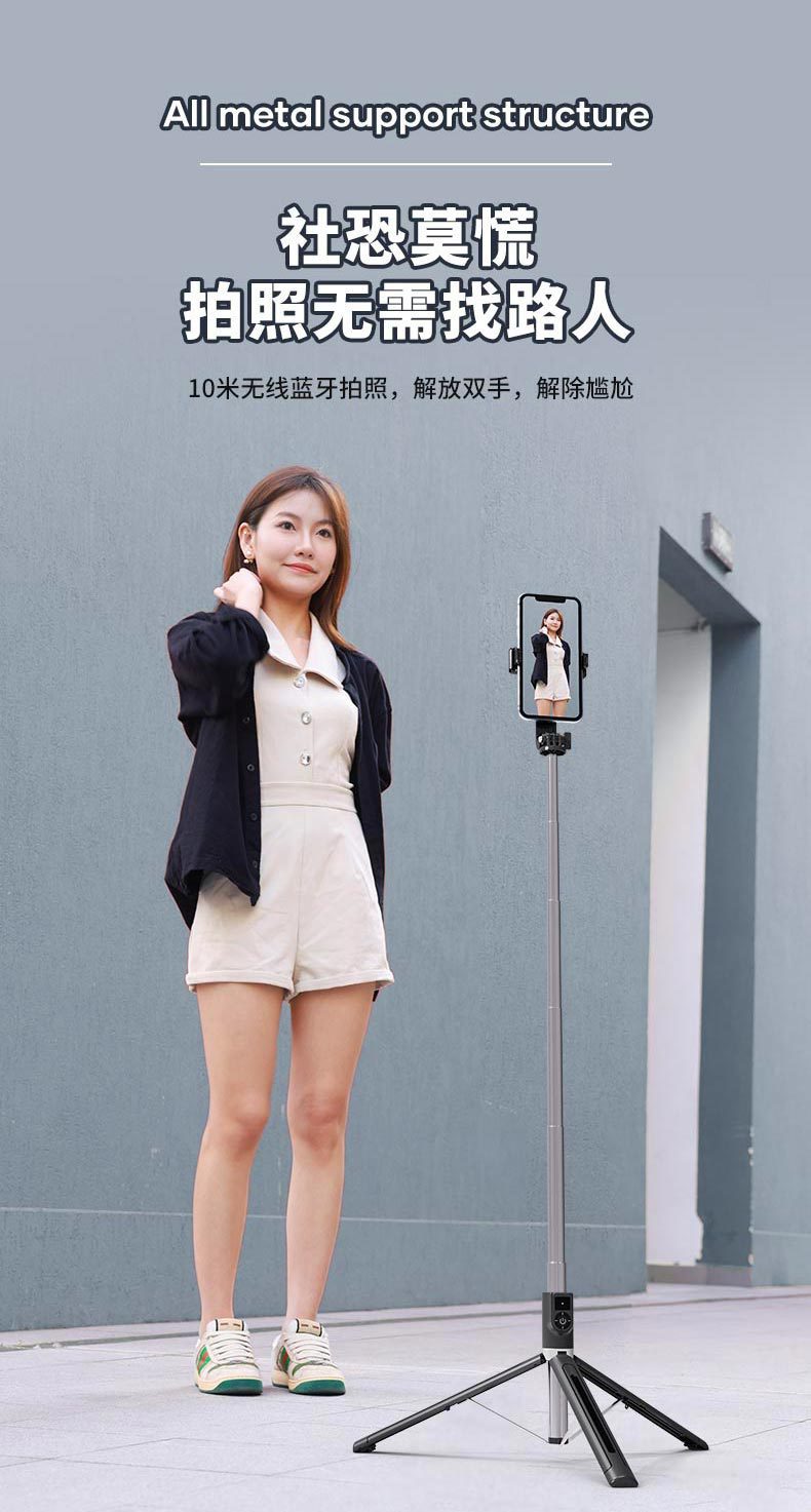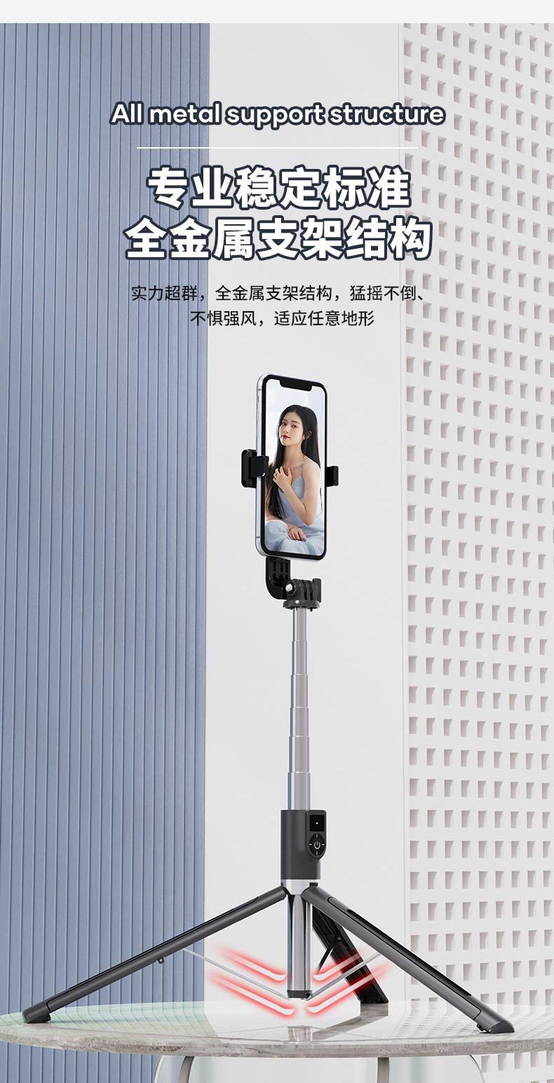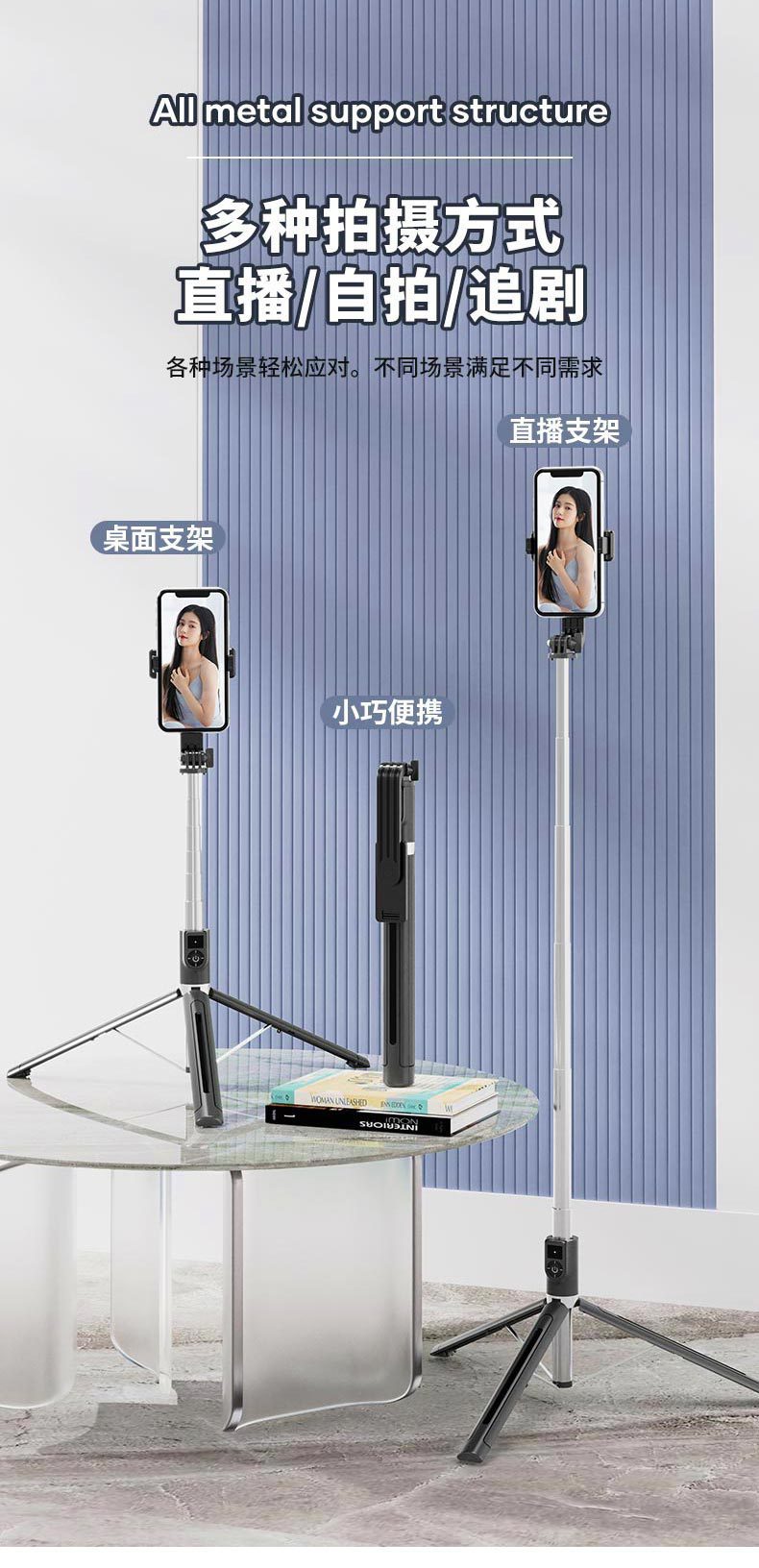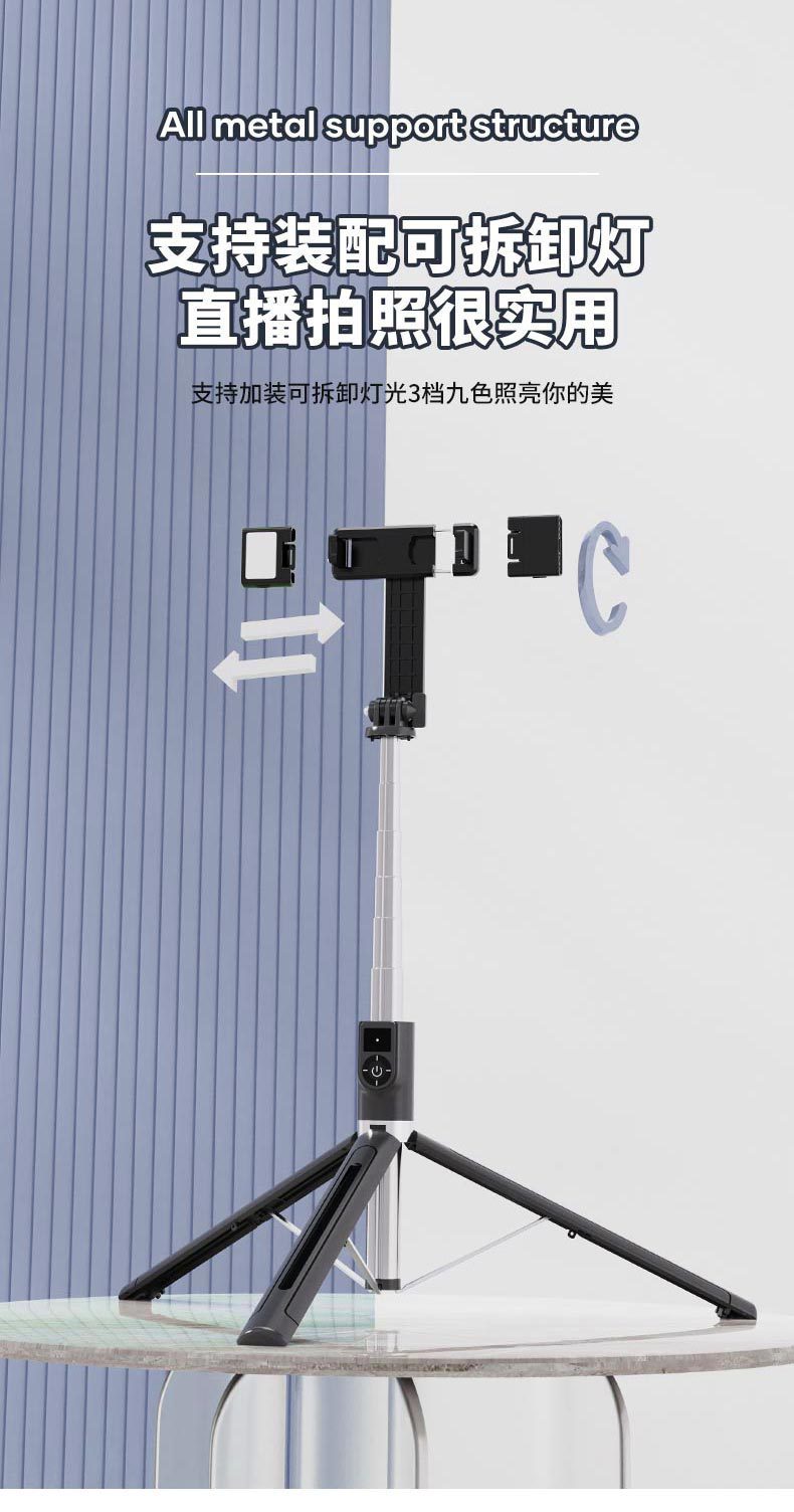P89E 스테인레스 스틸 휴대 전화 셀카 스틱 블루투스 사진 및 비디오 촬영 기능이있는 텔레스코픽 바닥 라이브 방송 삼각대 스탠드