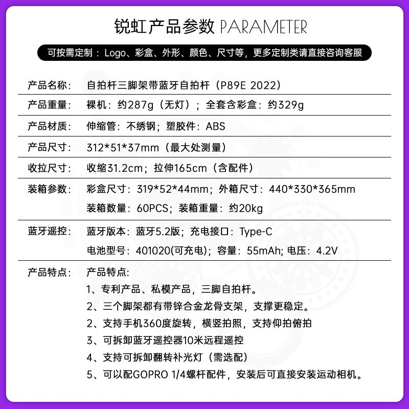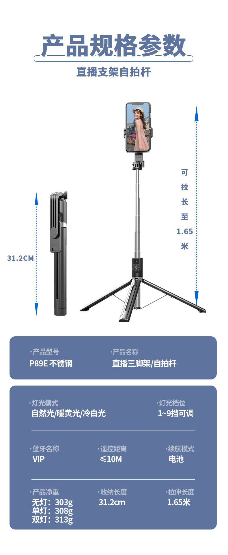 • P89E 스테인리스 셀카봉 [소형 사각 조명 1.65m쌍]