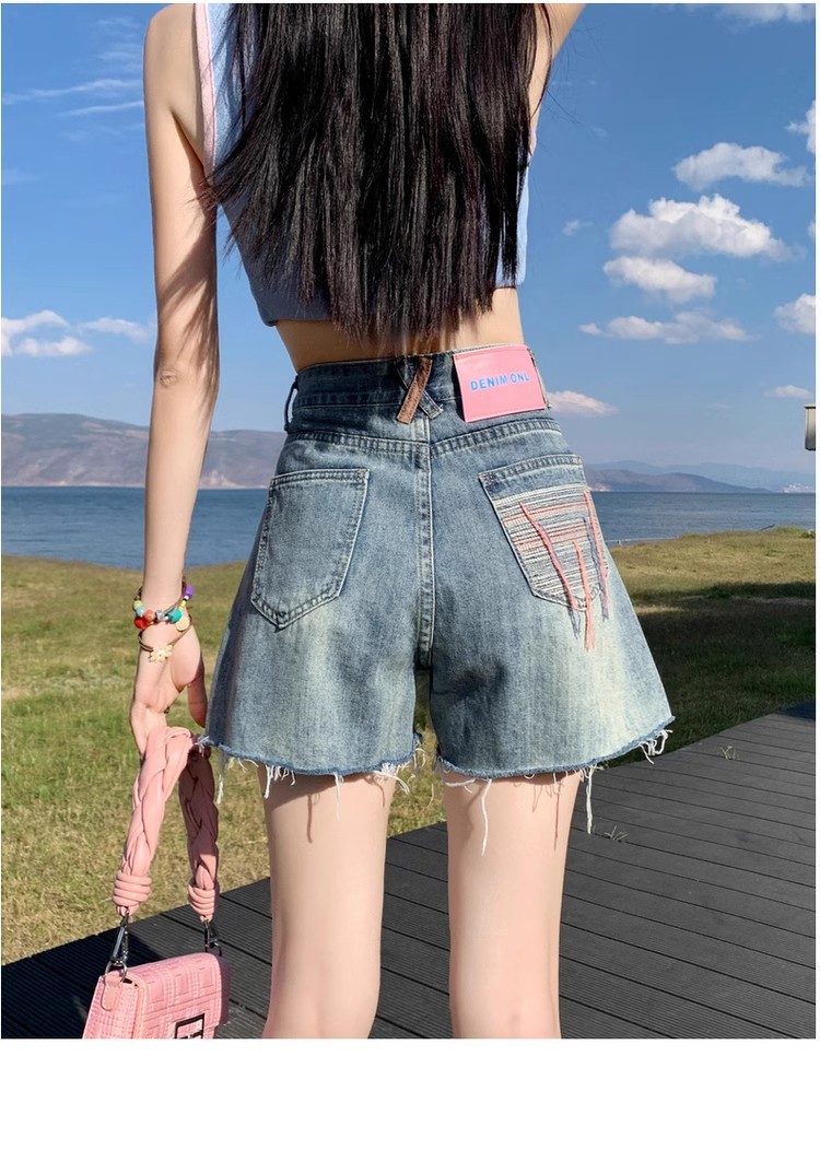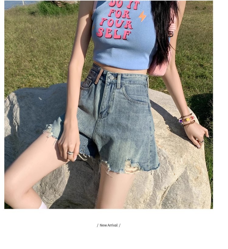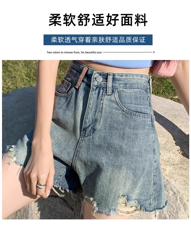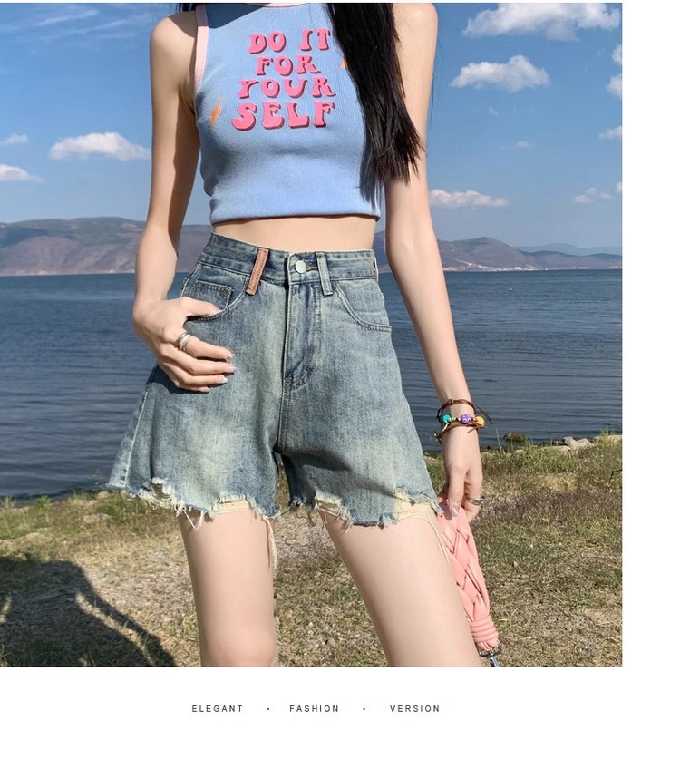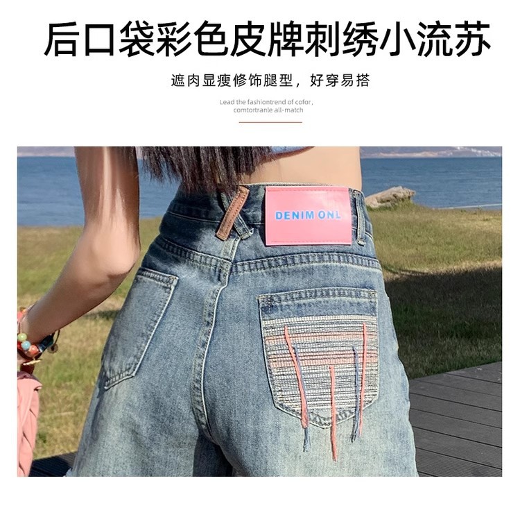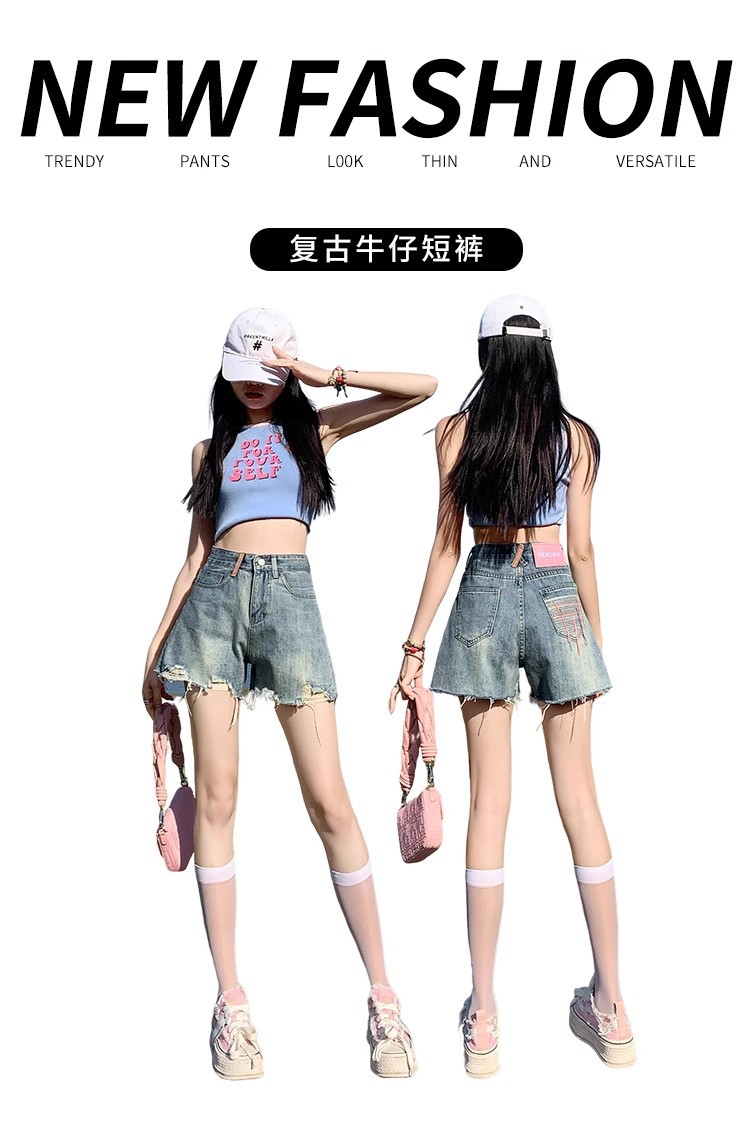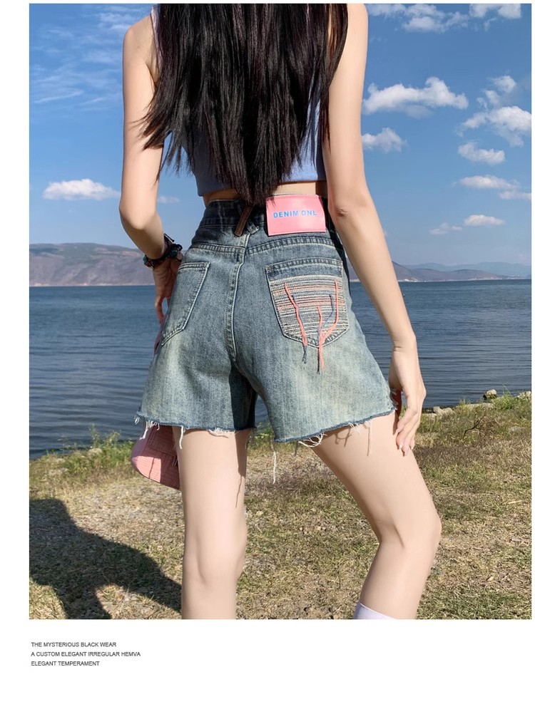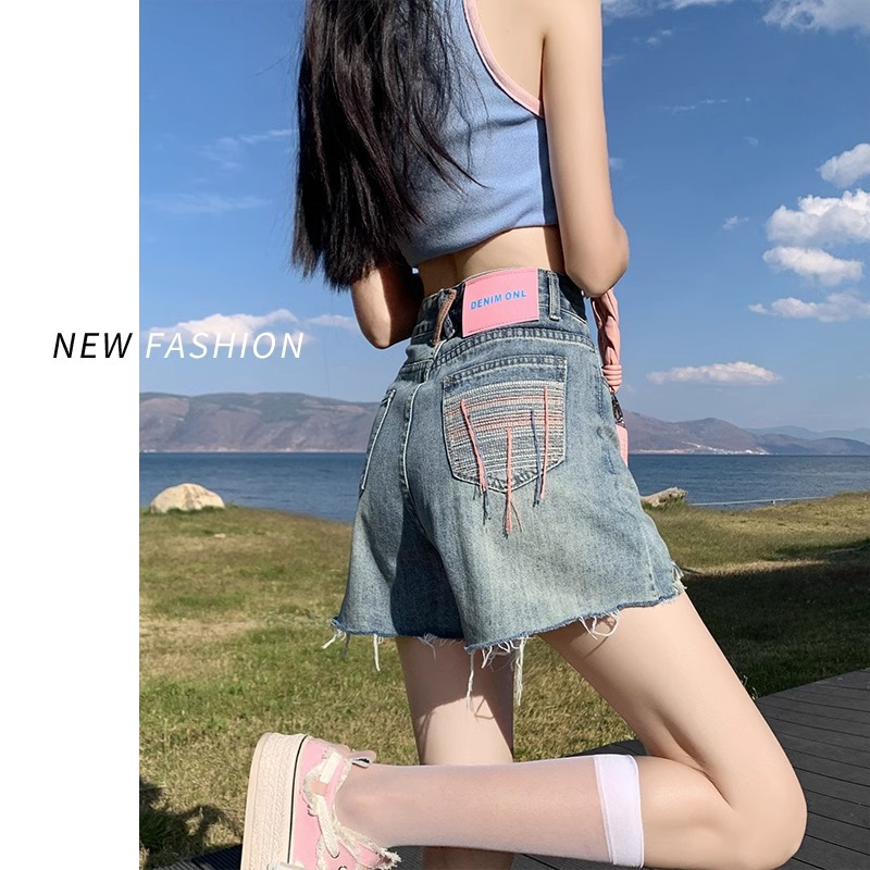 여름 새로운 폭발 블루 데님 반바지 여성 플러스 사이즈 슬리밍 하이 웨이스트 버 에지 디자인 핫 소녀 와이드 다리 바지스토어 가기