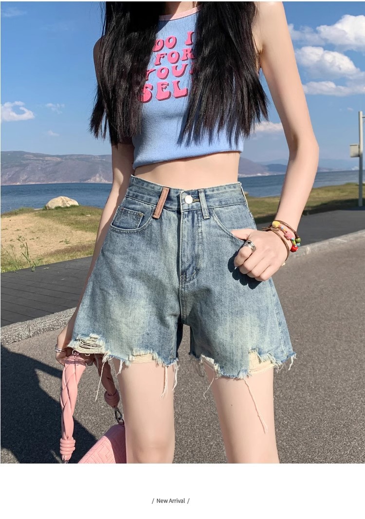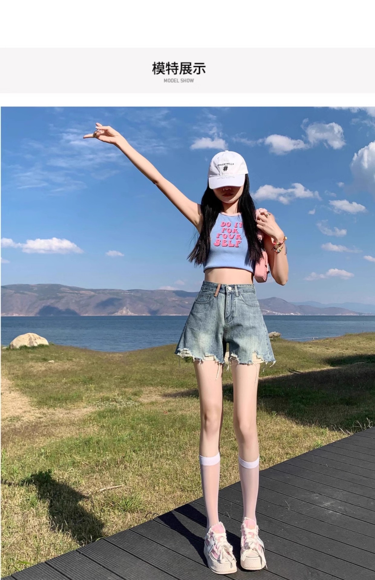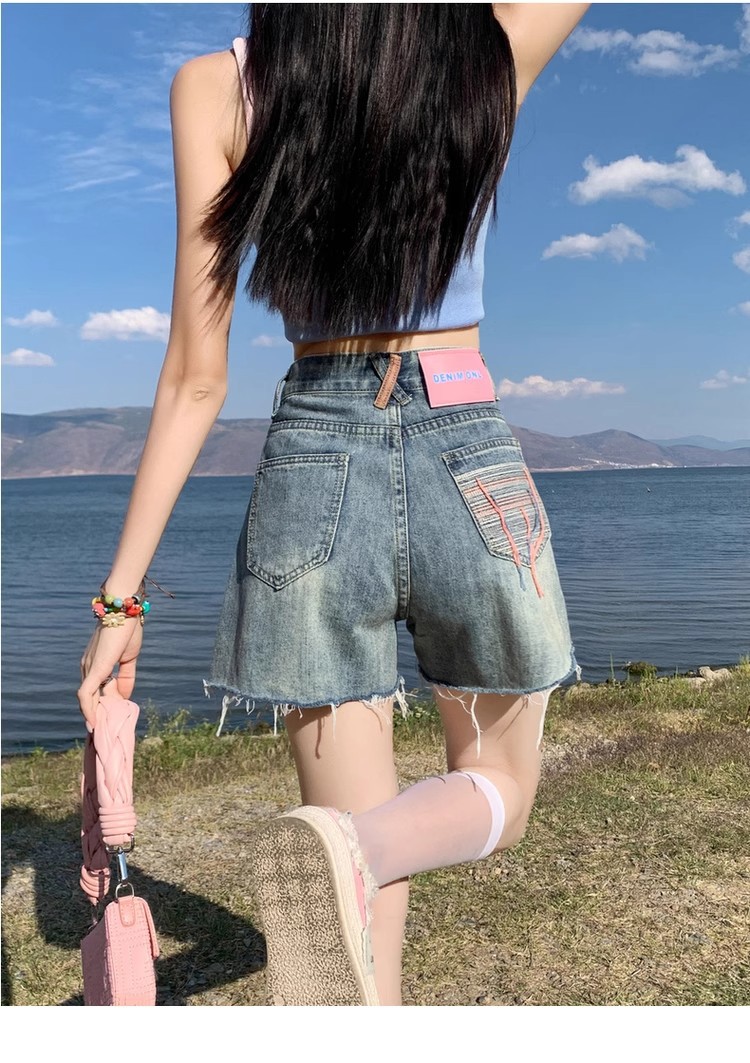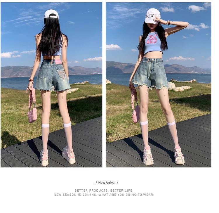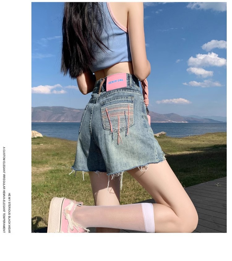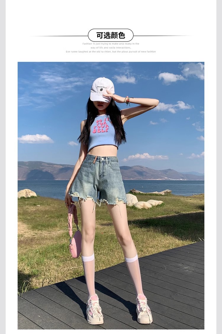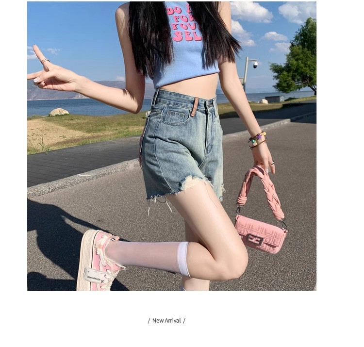 여름 새로운 폭발 블루 데님 반바지 여성 플러스 사이즈 슬리밍 하이 웨이스트 버 에지 디자인 핫 소녀 와이드 다리 바지스토어 가기