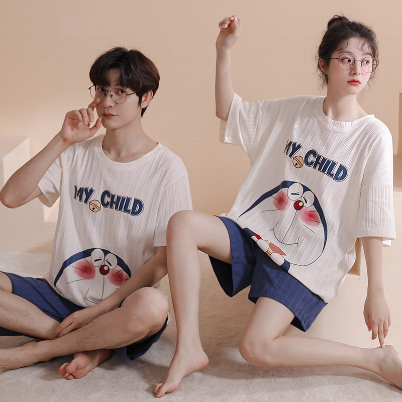 여름 커플 잠옷 여성 여름 학생 면화 여름 반팔 반바지 남성 만화 새로운 홈웨어 세트 여성