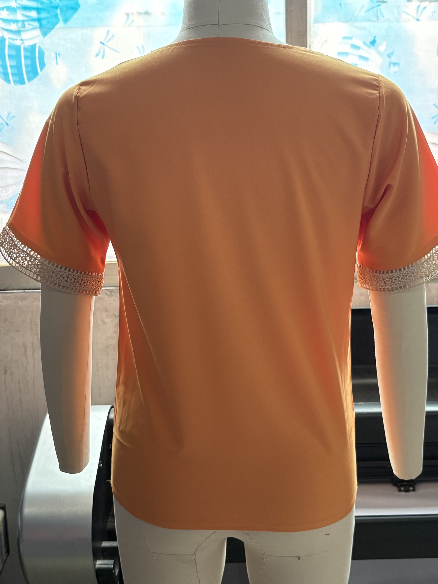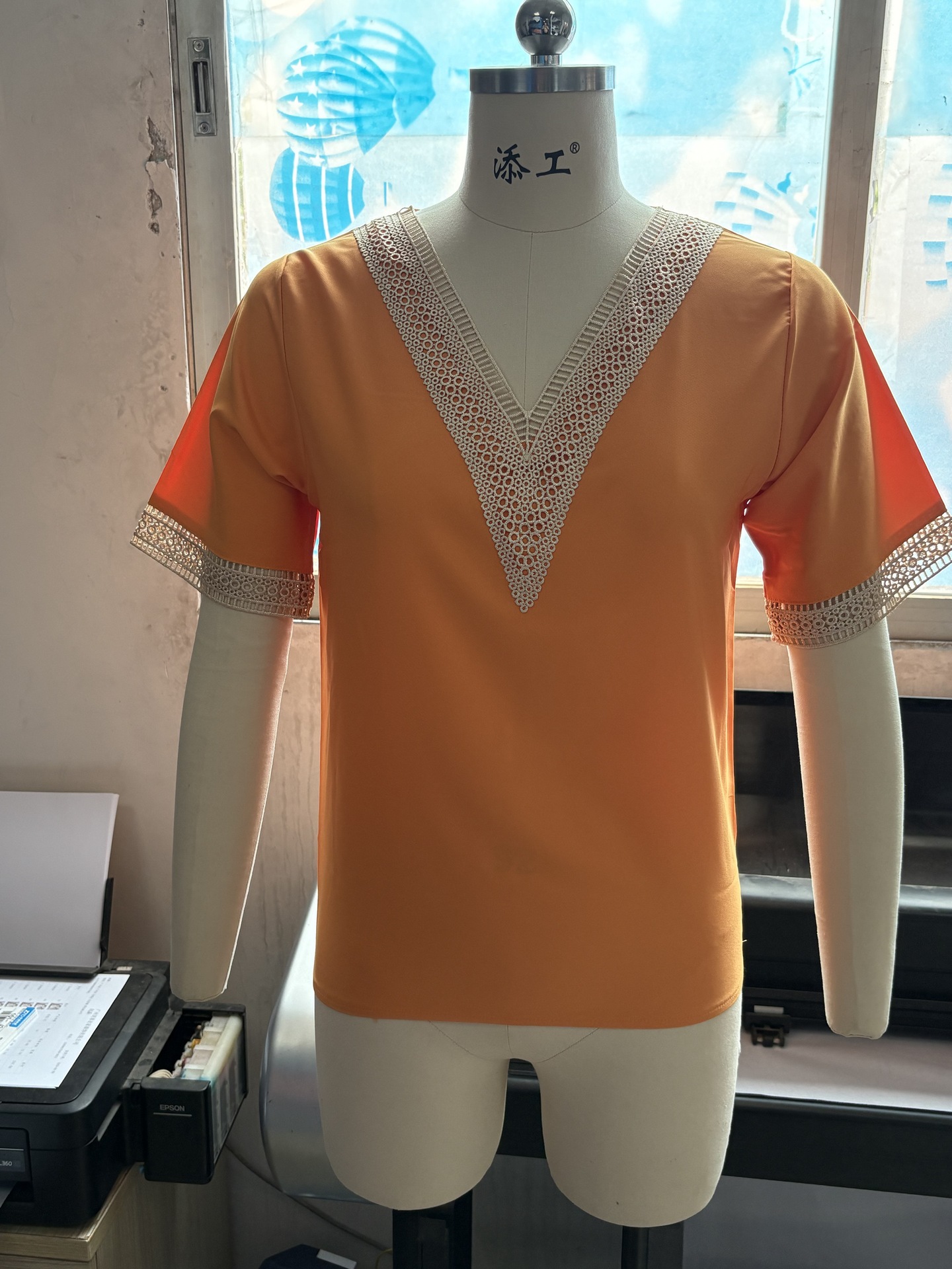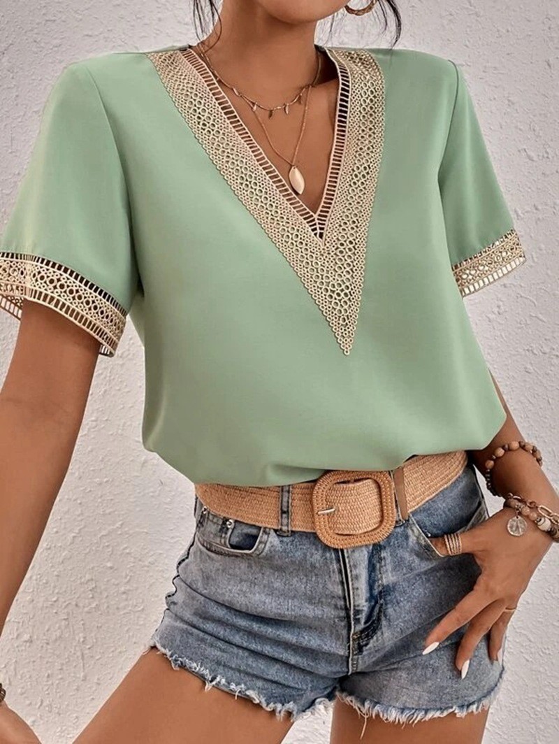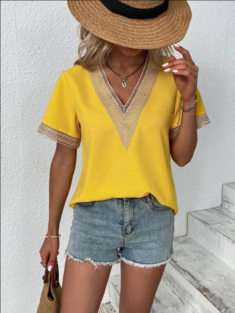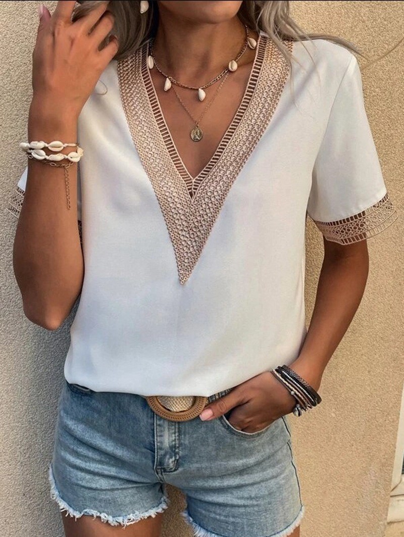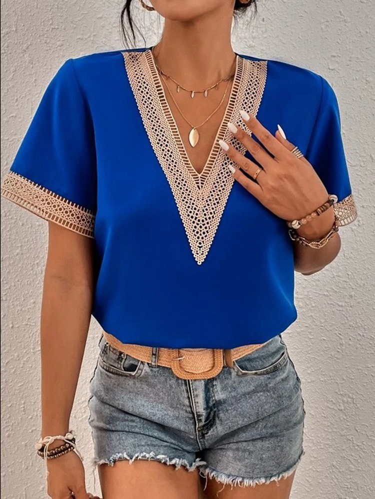 여름 신작 Amazon wish 유럽 및 미국 국경 간 여성 v 넥 레이스 캐주얼 솔리드 컬러 셔츠 국경 간 재고 있음