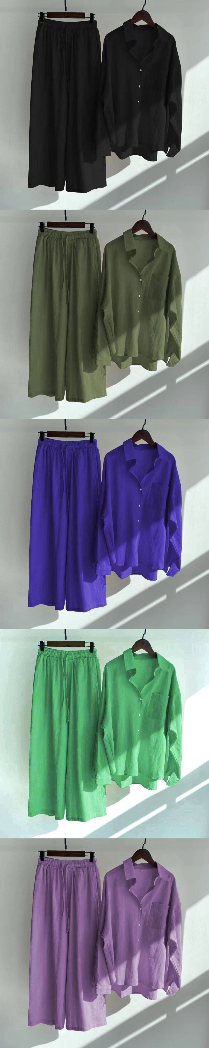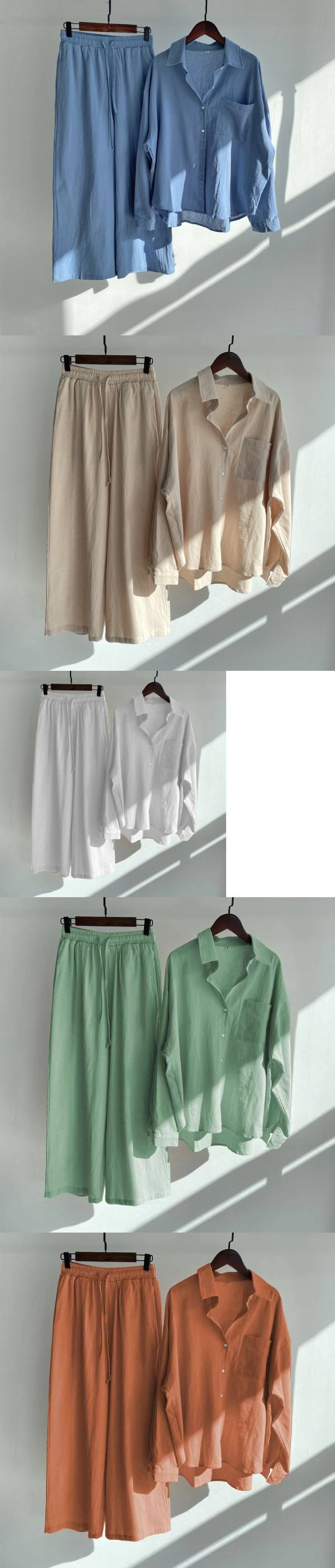 여성용 2 피스 빈티지 플러스 사이즈 2025 면 및 리넨 셔츠 세트 높은 허리 느슨한 바지스토어 가기