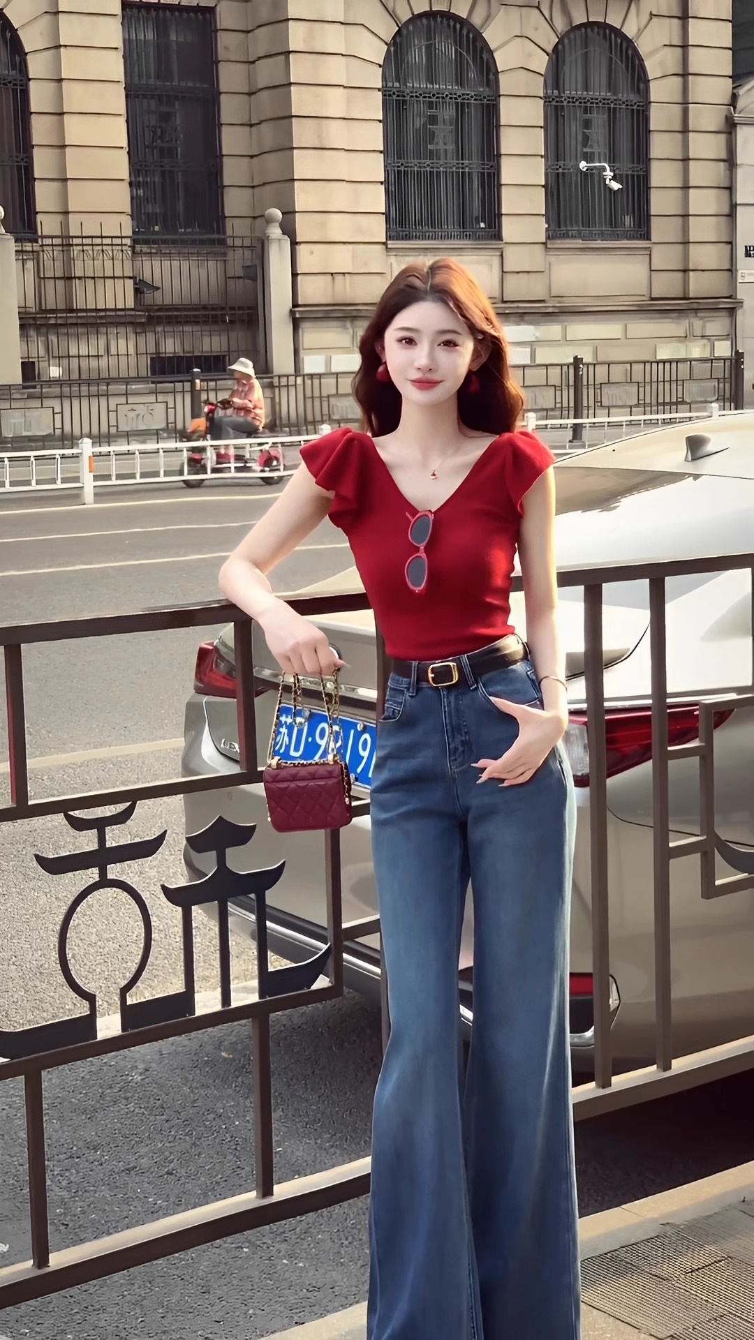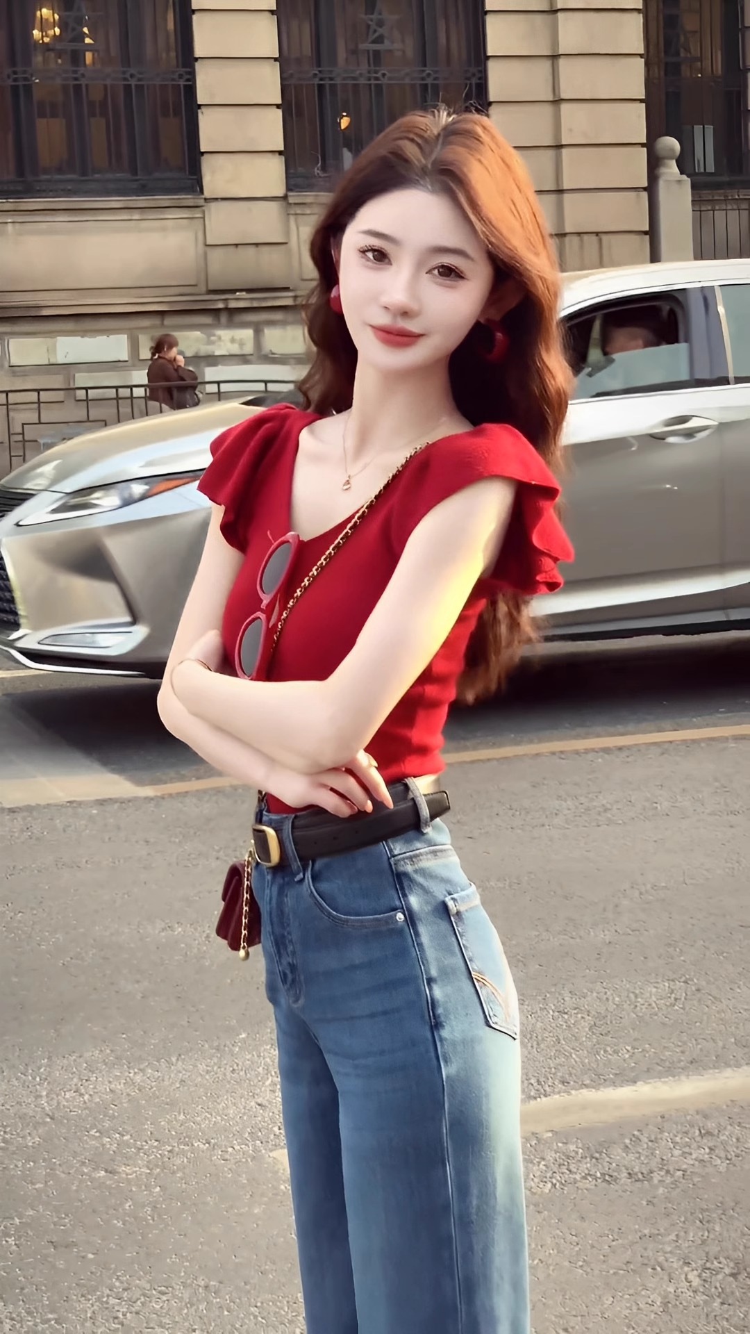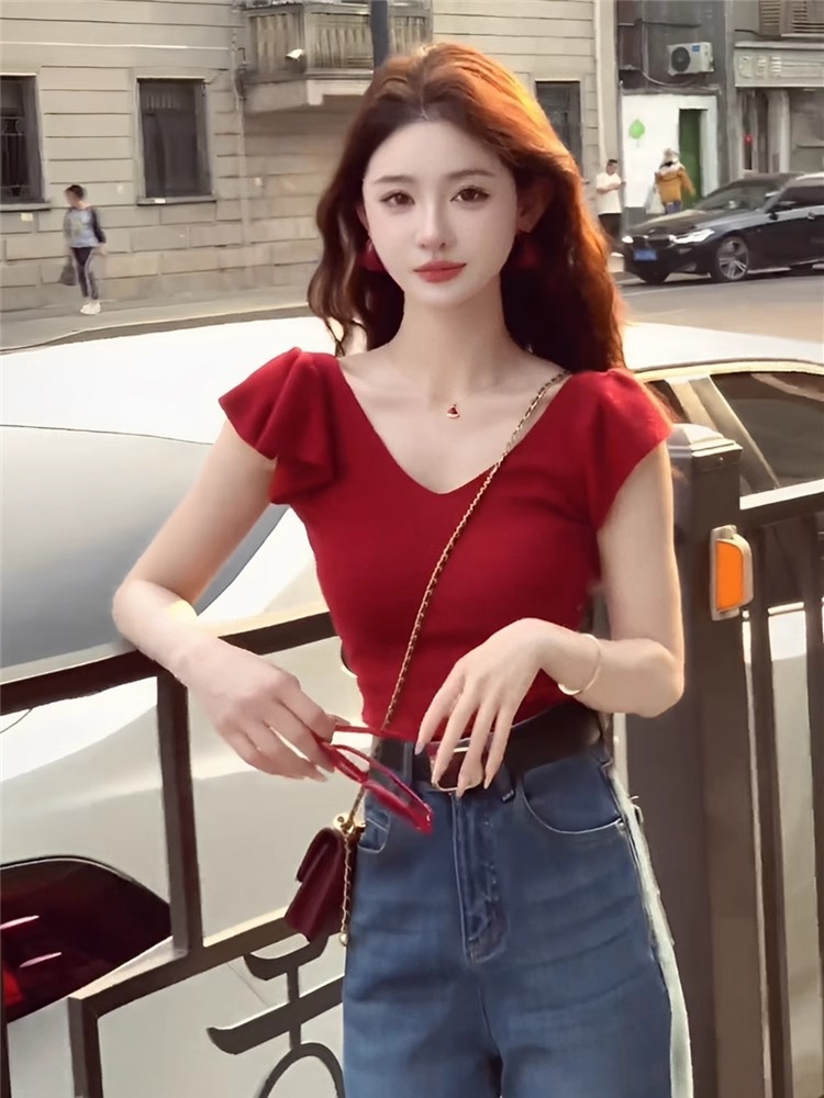 프랑스 하이 엔드 센스 레드 플라잉 슬리브 탑 여성의 2025 년 여름 새로운 아이스 실크 니트 짧은 소매 디자인 센스 틈새스토어 가기