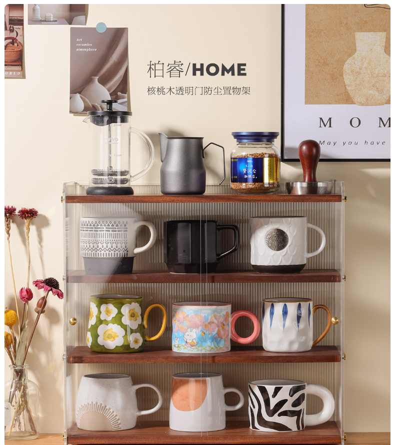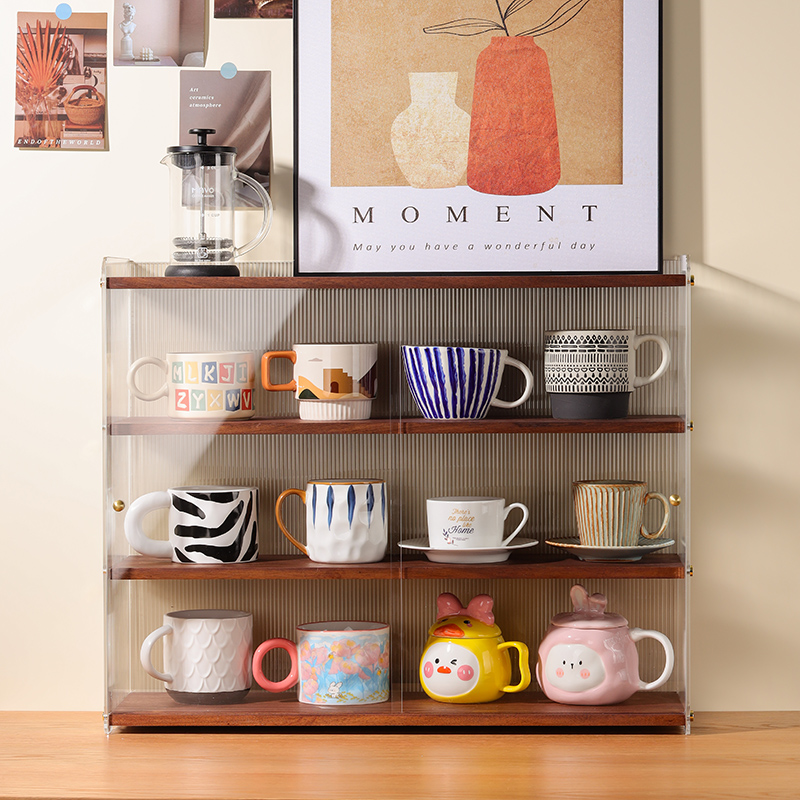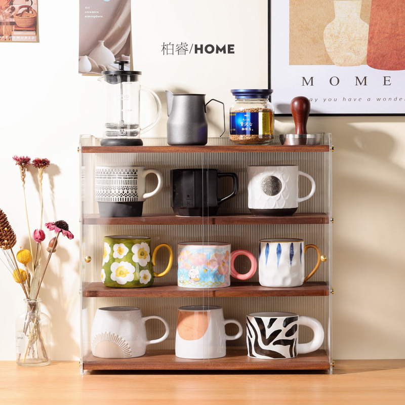 데스크탑 컵 보관함 단단한 나무 슬라이딩 도어 커피 차 세트 보관 캐비닛 식탁 아크릴 방진 컵 홀더스토어 가기