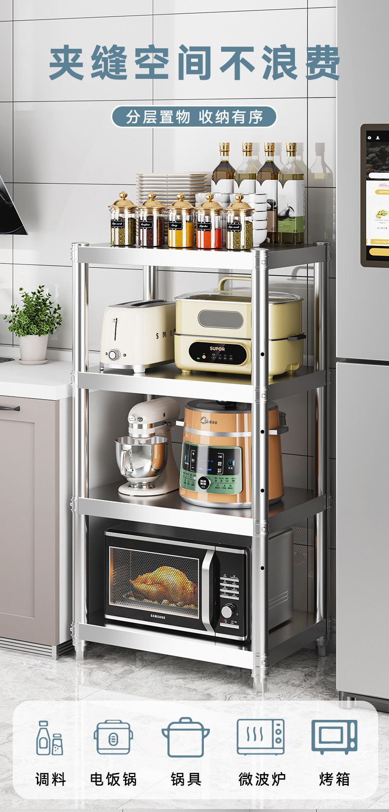 스테인레스 스틸 틈새 수납 선반 주방 수납 선반 전자 레인지 수납 선반 가정용 수납 냄비 선반