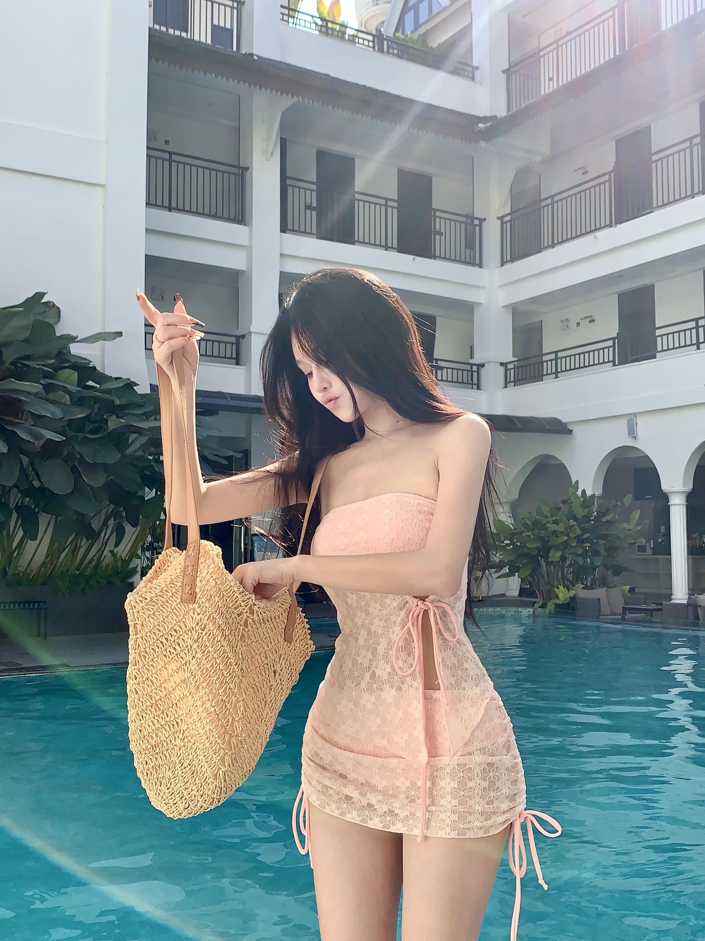 새 스타일 순수한 욕망 소녀 핑크 섹시한 레이스 튜브 탑 스플릿 비키니 수영복 스파 비치스토어 가기