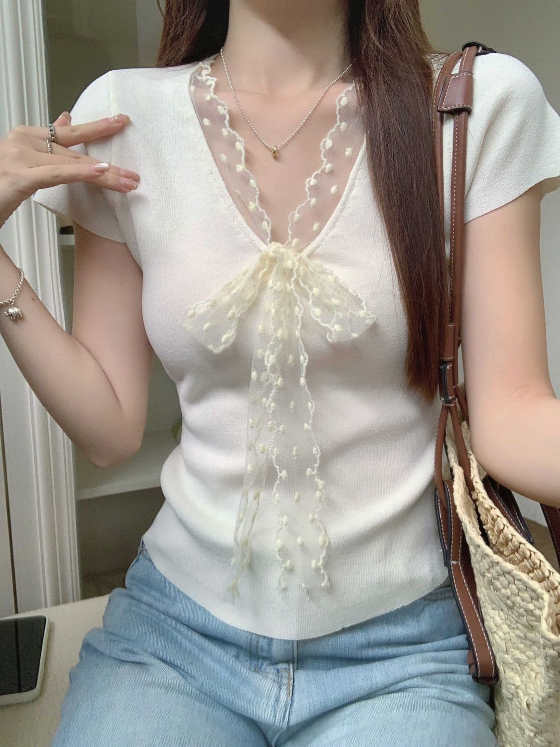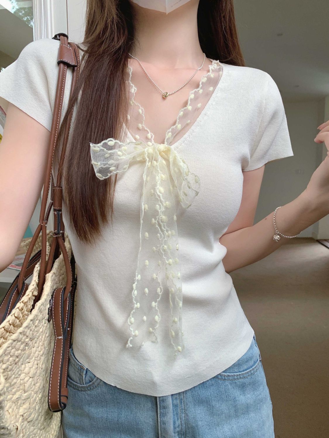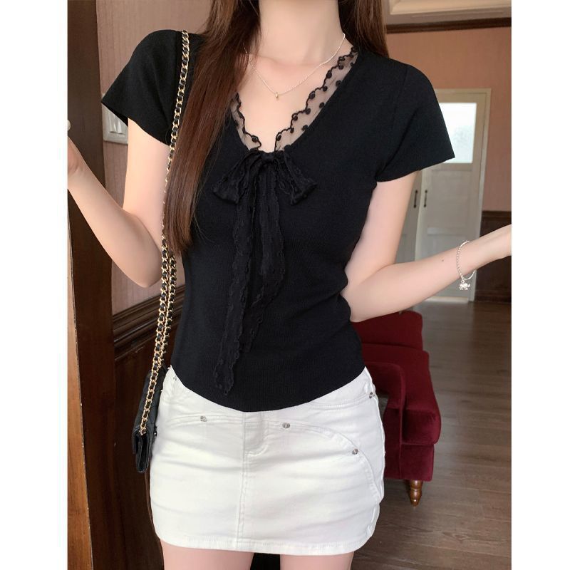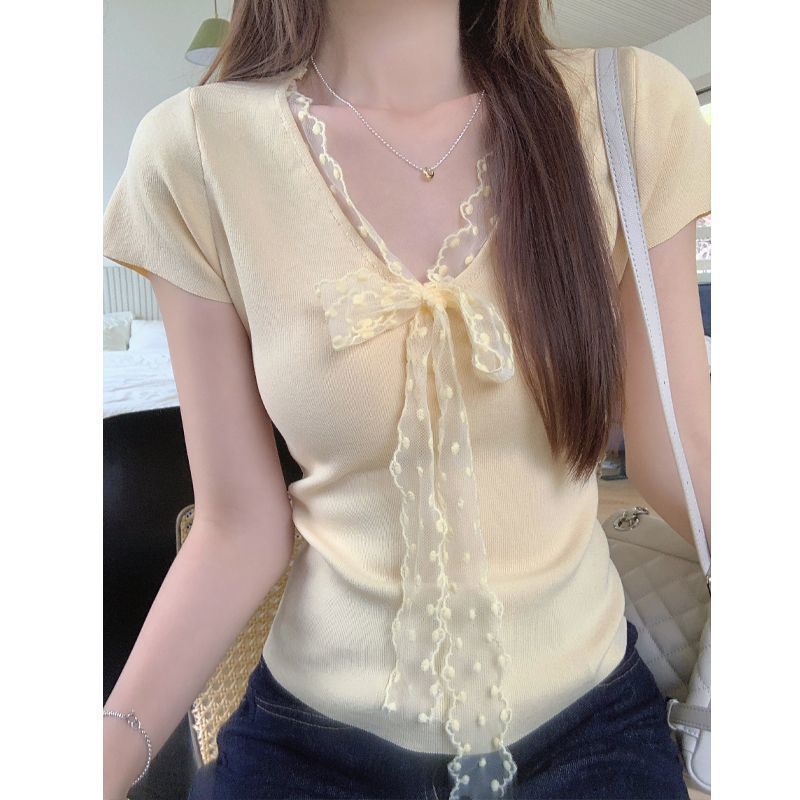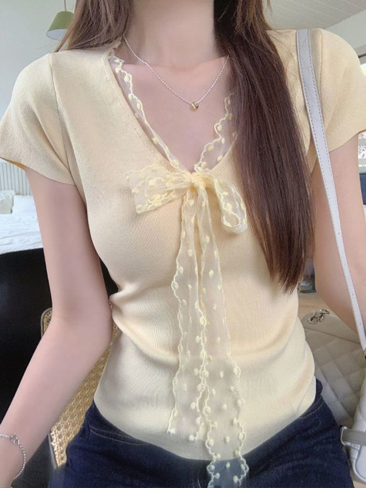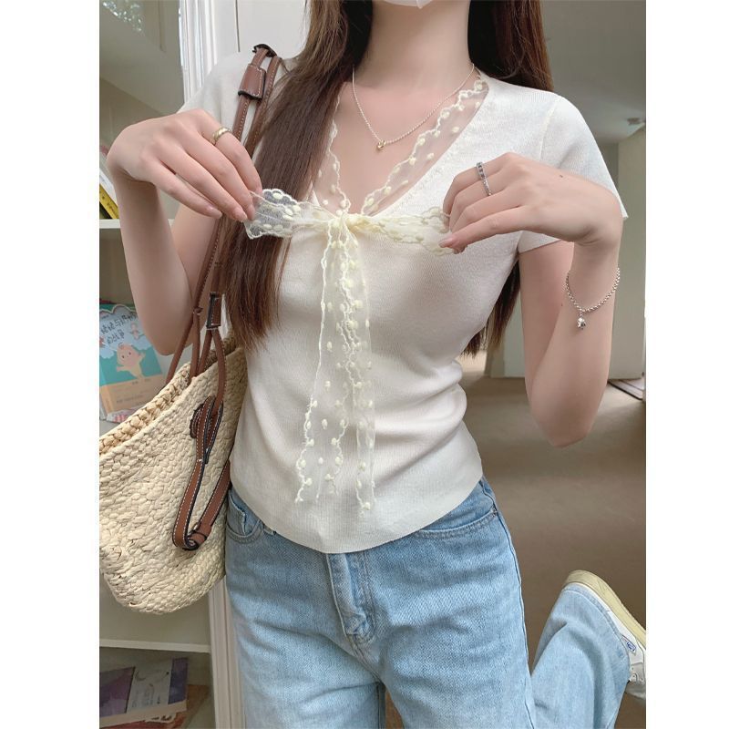 레이스 V 넥 아이스 실크 니트 셔츠 반팔 여성 티셔츠 여성 여름 새로운 도착 나비 넥업 슬림 핏 쇼트 탑스토어 가기