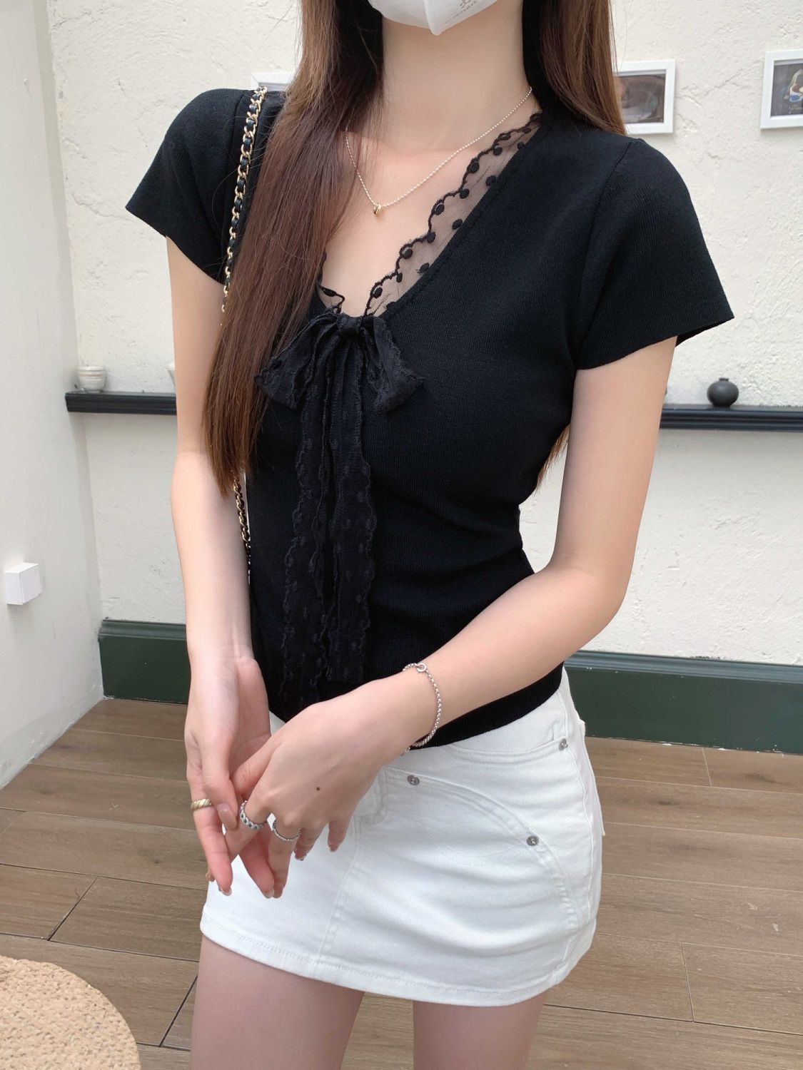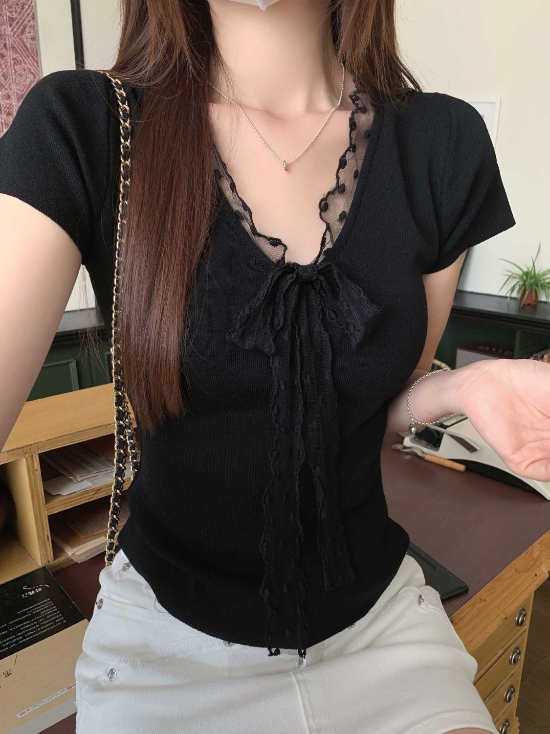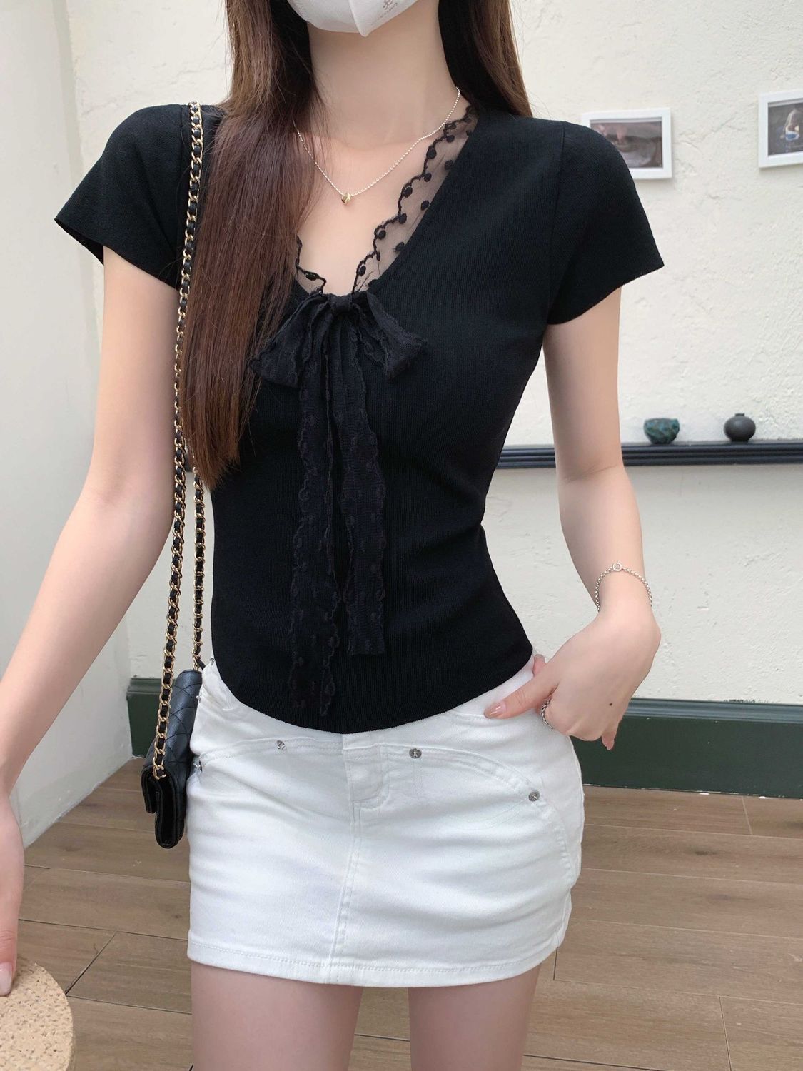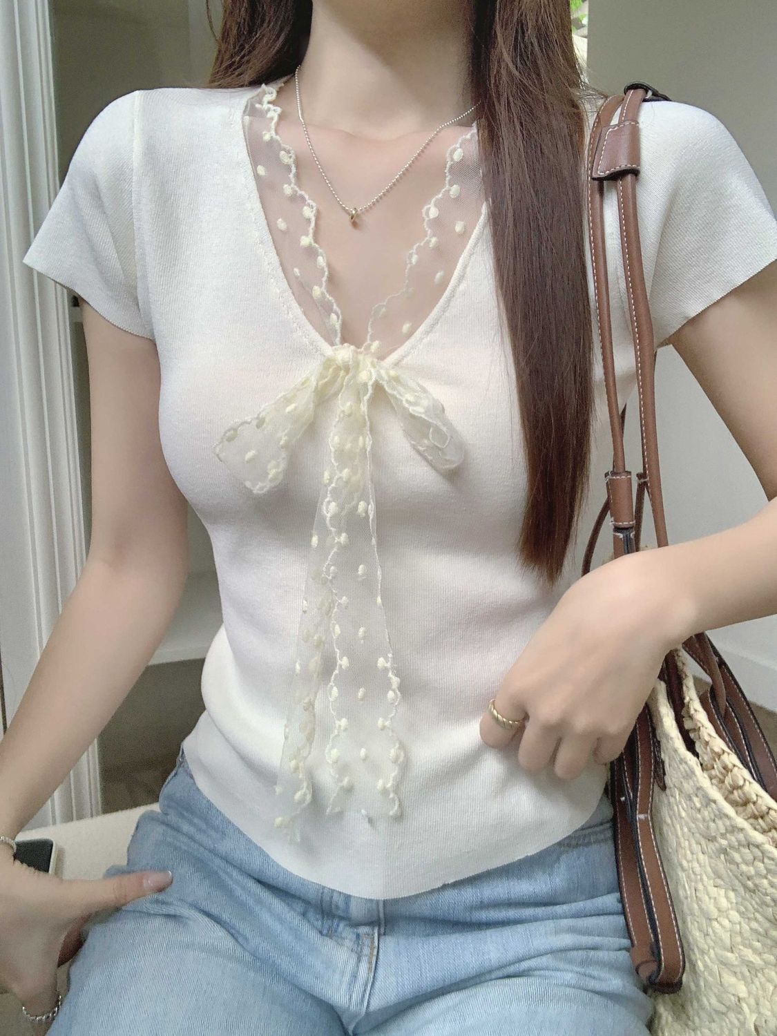 레이스 V 넥 아이스 실크 니트 셔츠 반팔 여성 티셔츠 여성 여름 새로운 도착 나비 넥업 슬림 핏 쇼트 탑스토어 가기