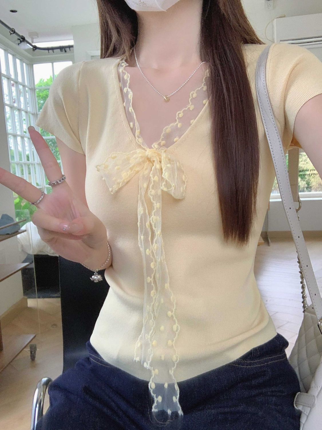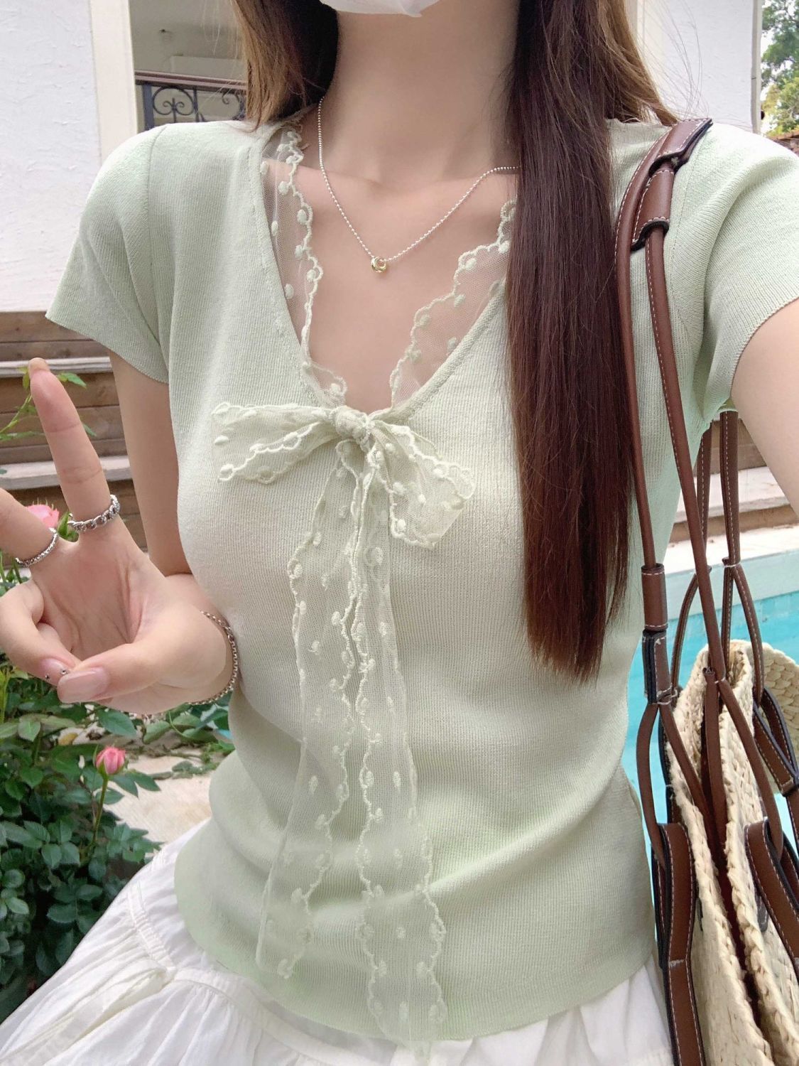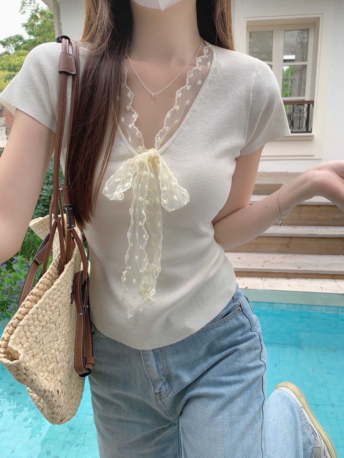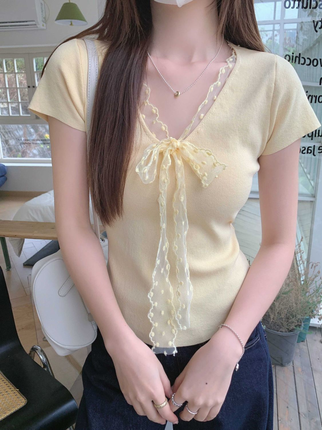 레이스 V 넥 아이스 실크 니트 셔츠 반팔 여성 티셔츠 여성 여름 새로운 도착 나비 넥업 슬림 핏 쇼트 탑스토어 가기