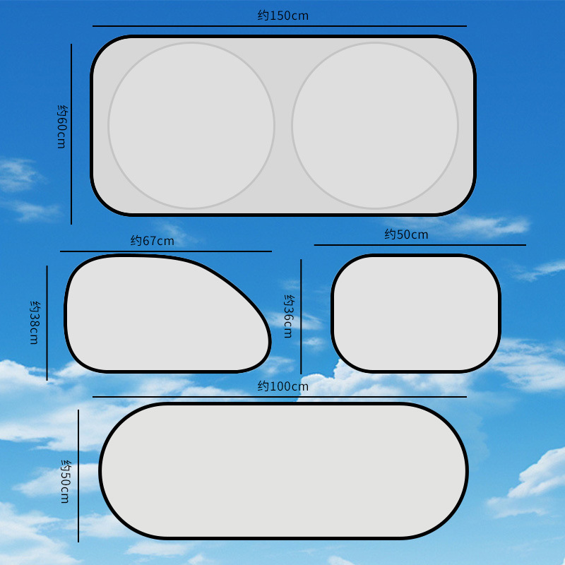 本产品材质为涂银布,能有效的反射太阳光线,更有效的对车内进行隔热。