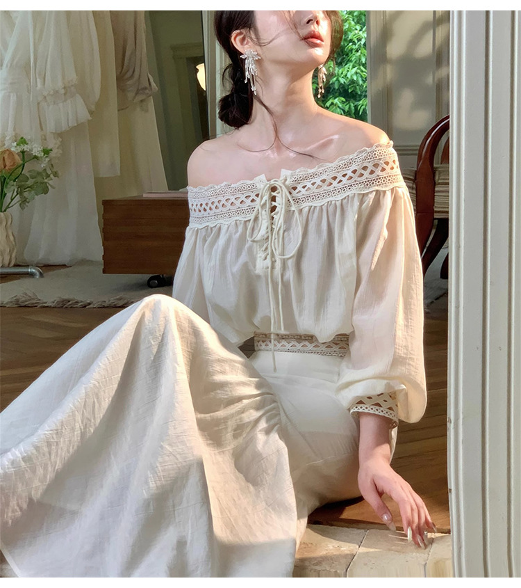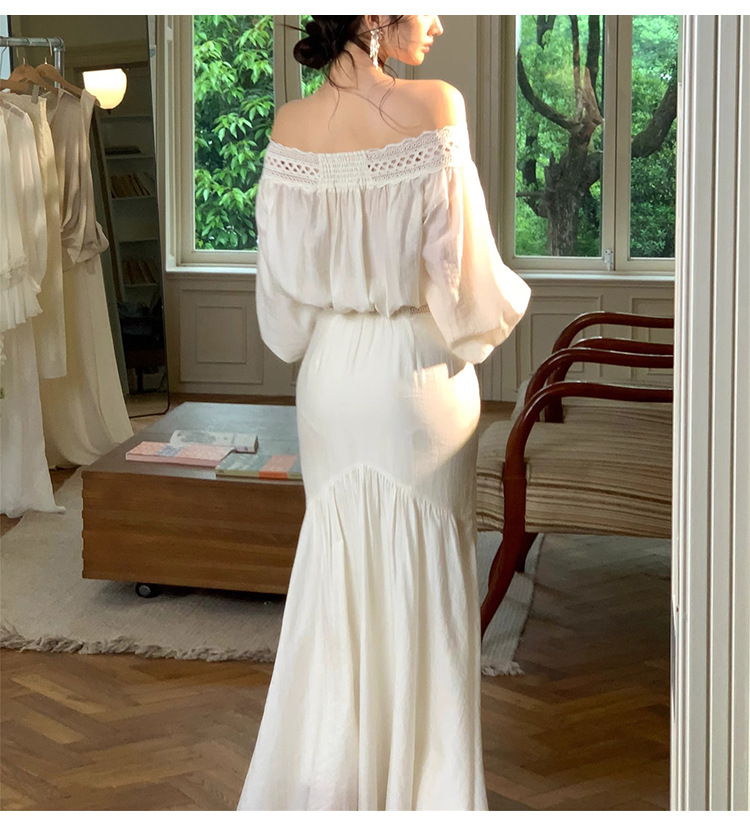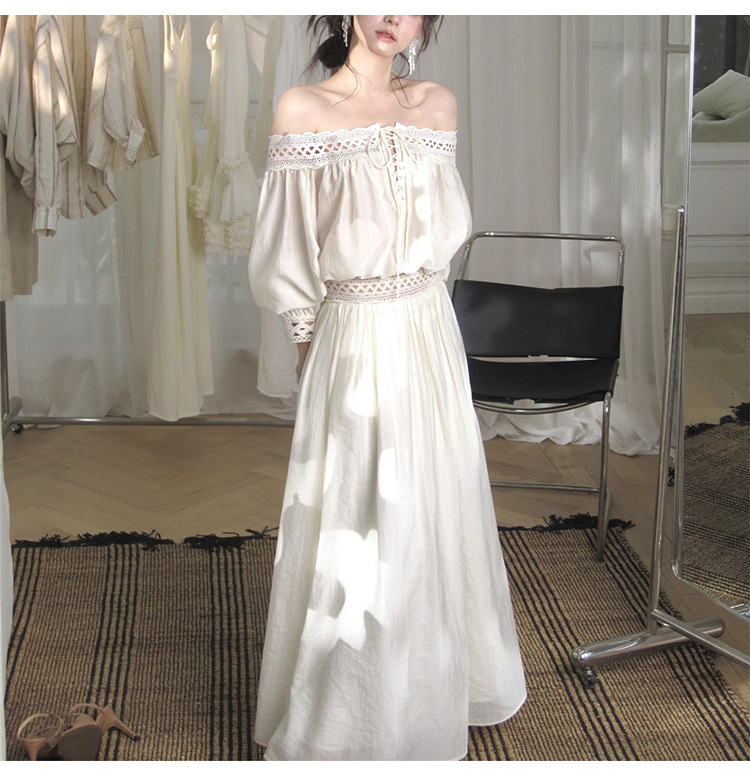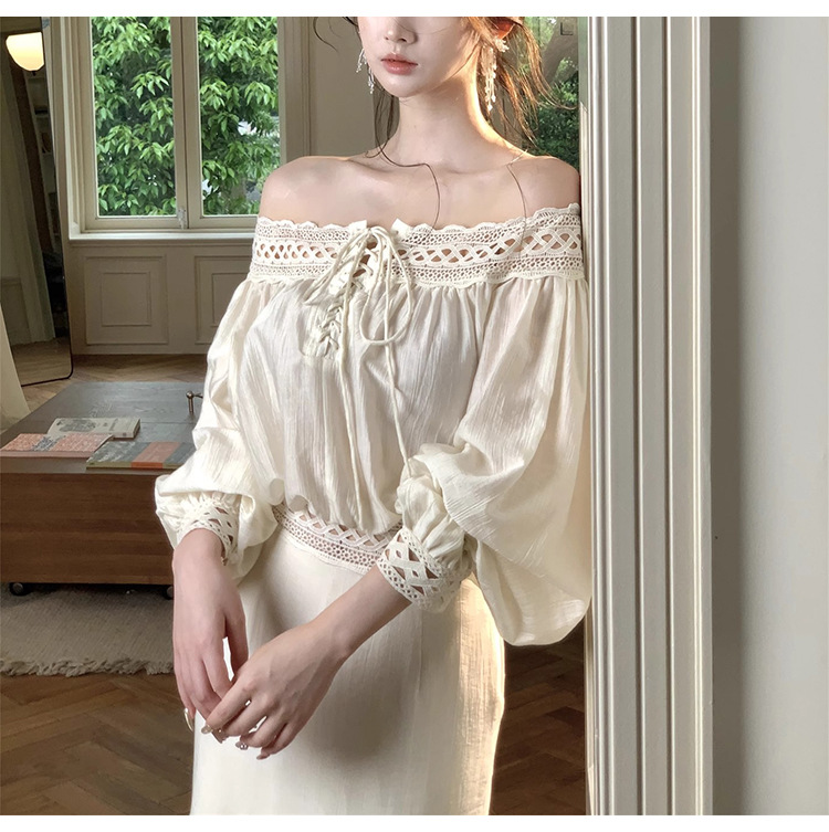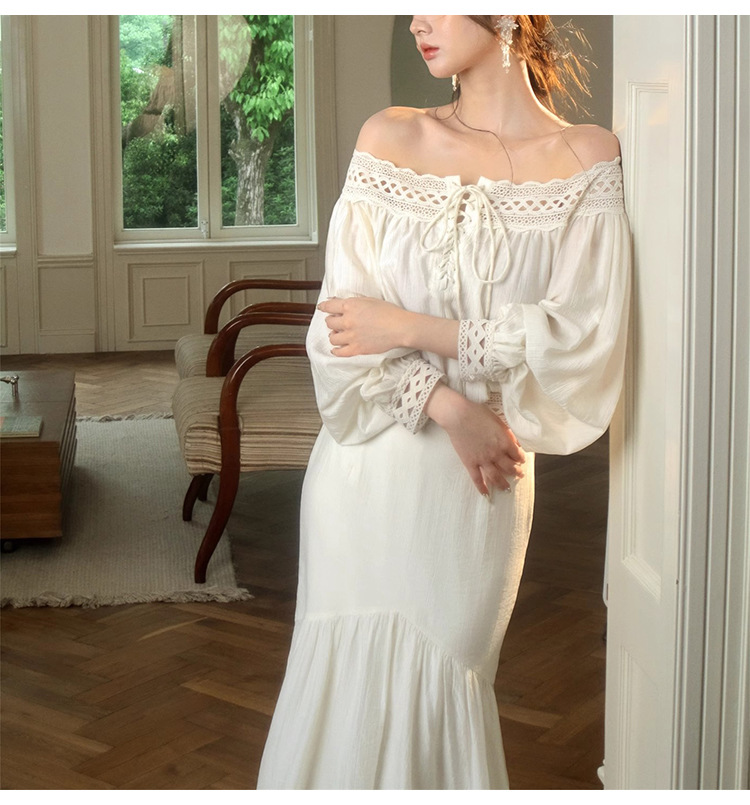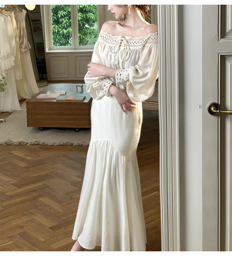 재고 있음【浮生半日】고급 디자인의 레이스 오프숄더 탑과 A라인 머메이드 스커트 세트스토어 가기