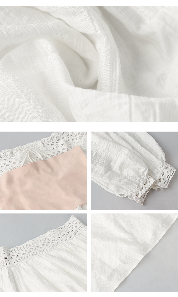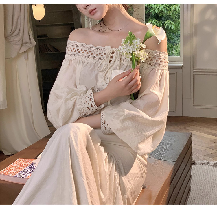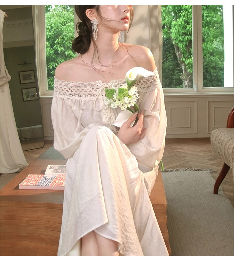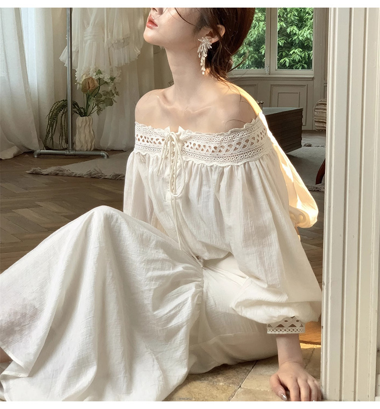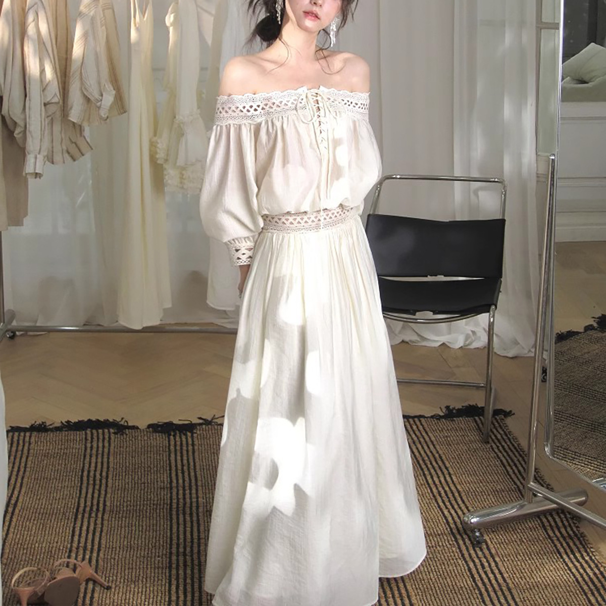 재고 있음【浮生半日】고급 디자인의 레이스 오프숄더 탑과 A라인 머메이드 스커트 세트스토어 가기