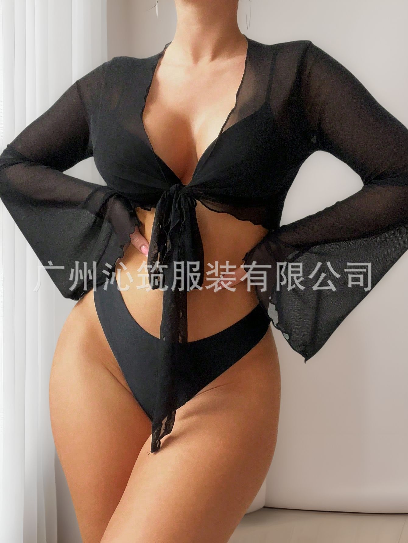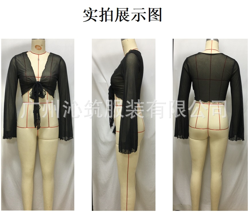 유럽과 미국 스타일의 단색 비키니 수영복 커버업 여성용 분리형 짧은 V넥 끈 긴팔 섹시한 해변 휴가 수영복스토어 가기