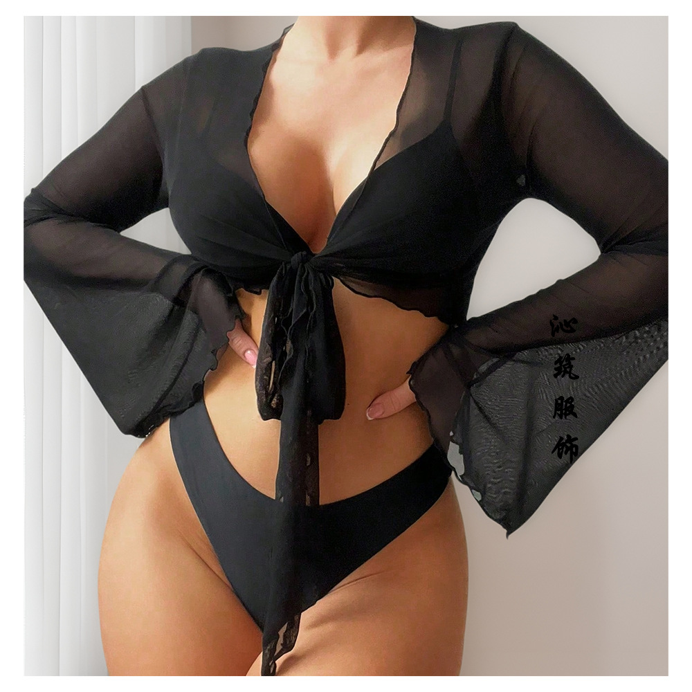 유럽과 미국 스타일의 단색 비키니 수영복 커버업 여성용 분리형 짧은 V넥 끈 긴팔 섹시한 해변 휴가 수영복