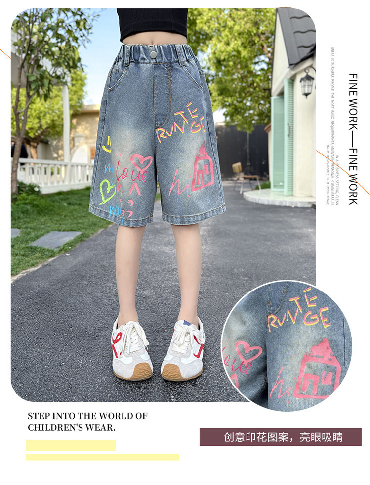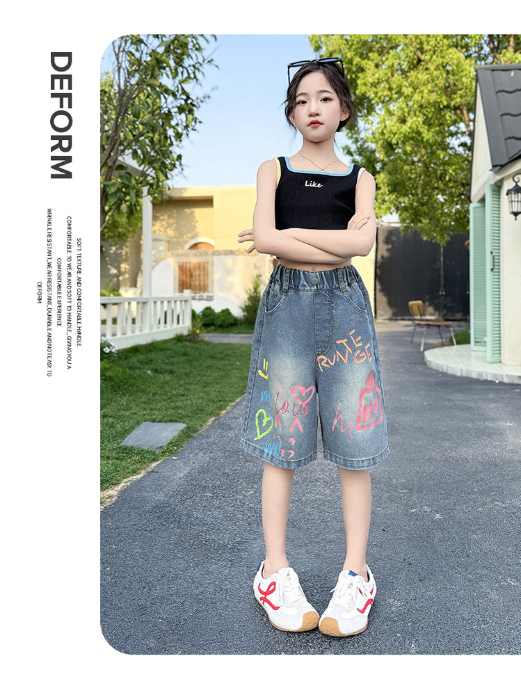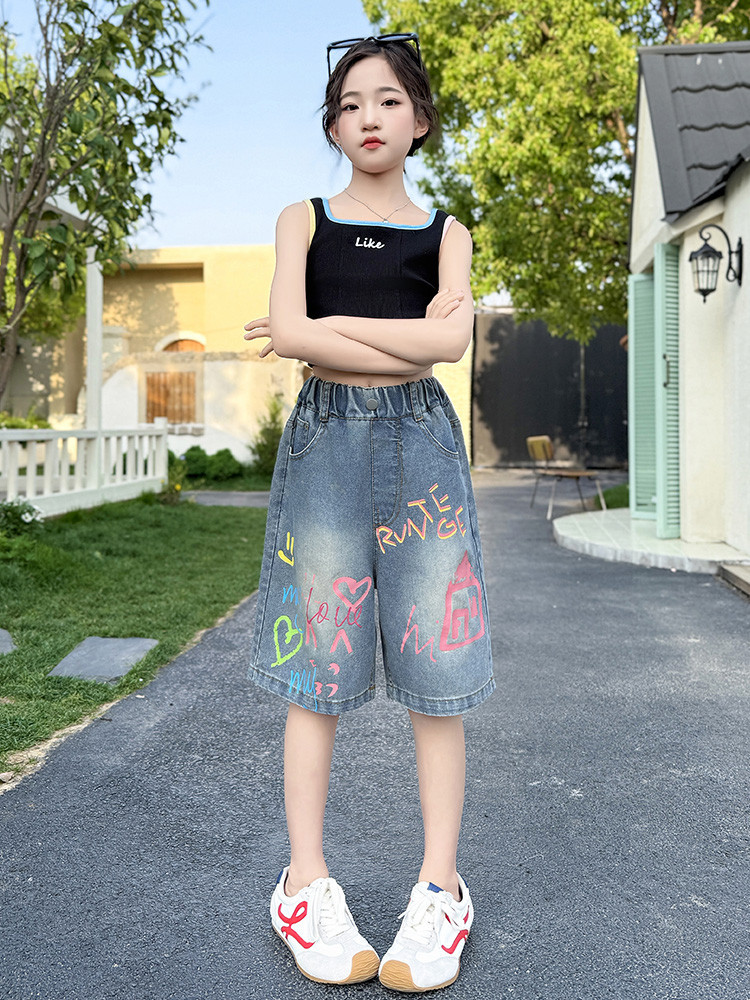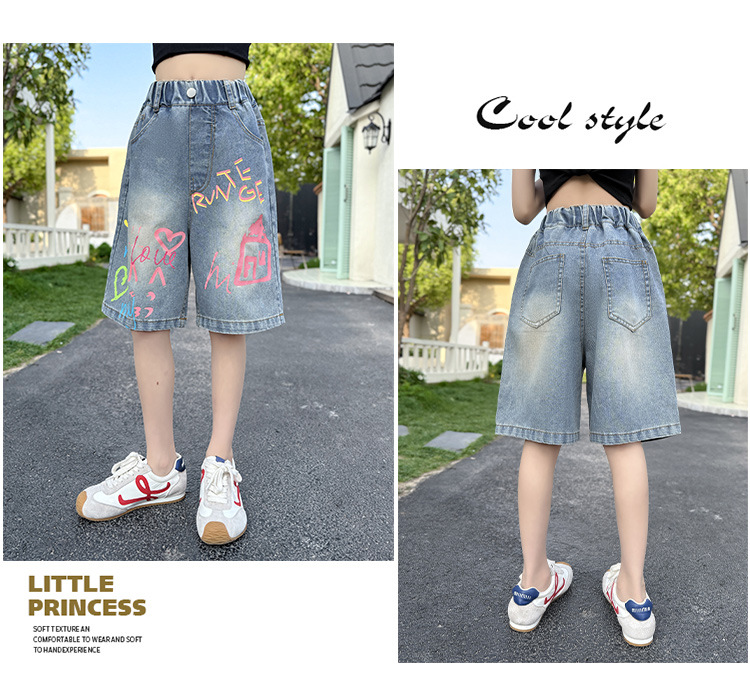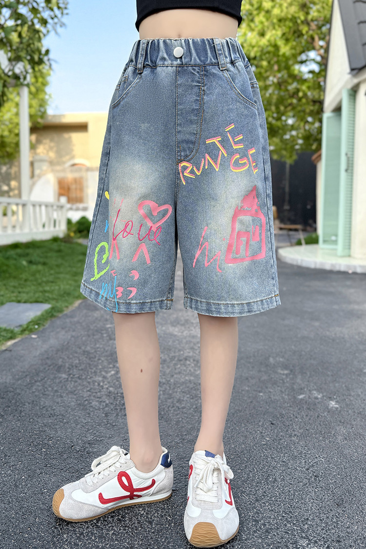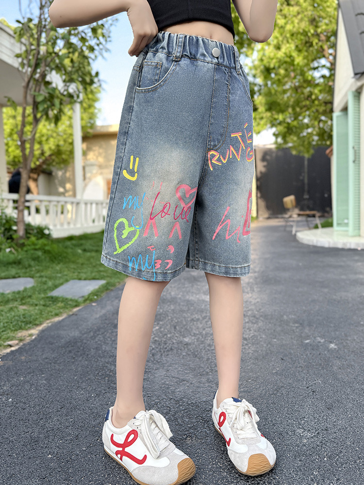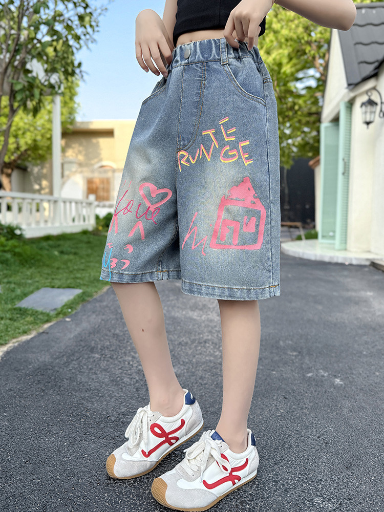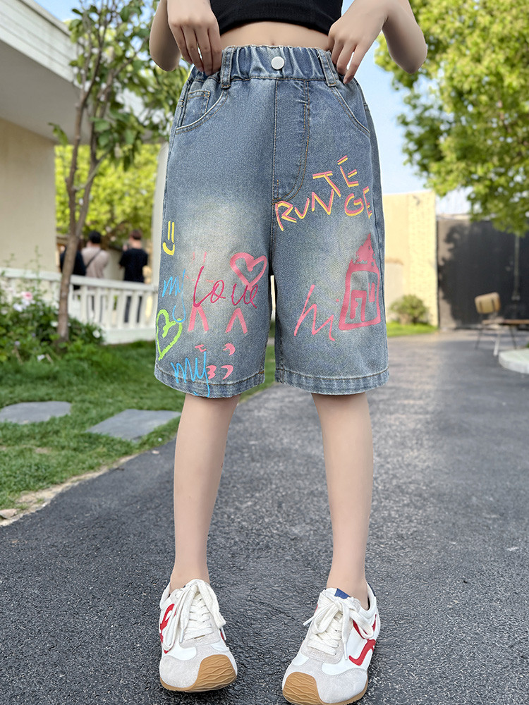소녀 낙서 데님 바지 2025 여름 새로운 어린이 느슨한 캐주얼 바지 아기 소녀 서양식 반바지
