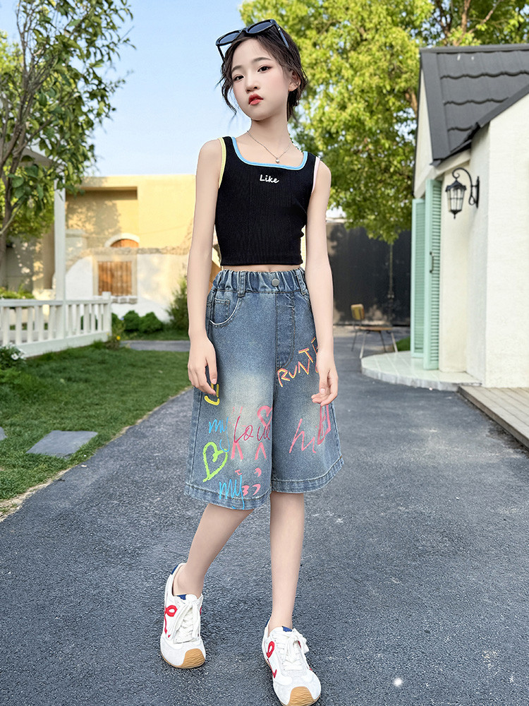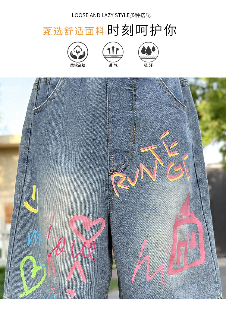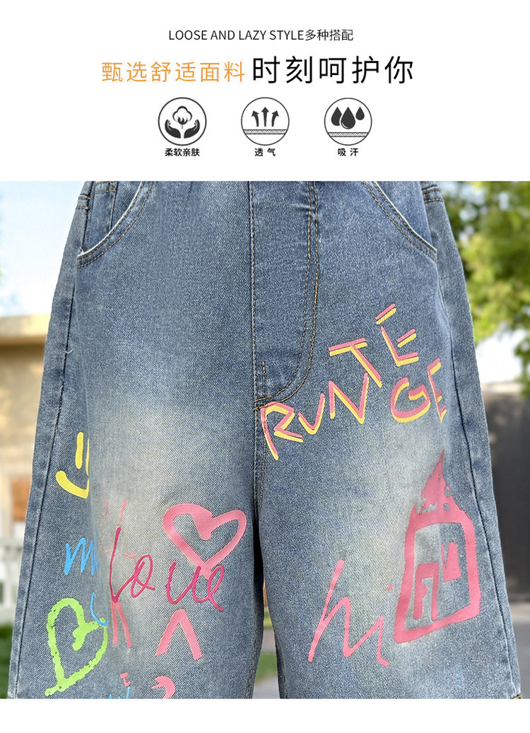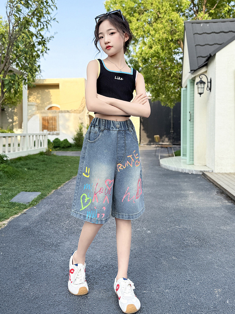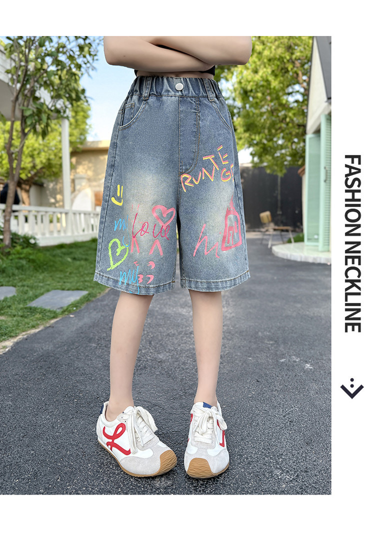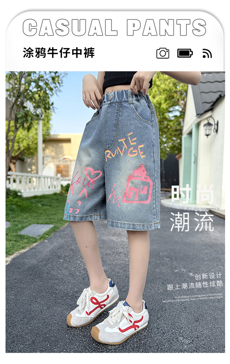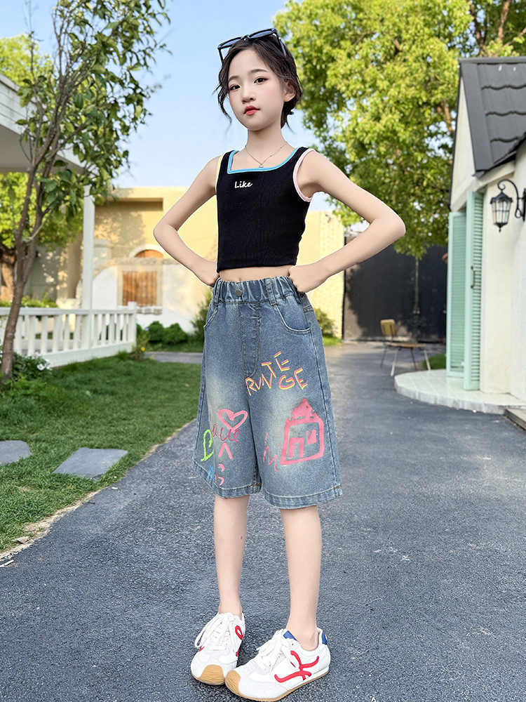 소녀 낙서 데님 바지 2025 여름 새로운 어린이 느슨한 캐주얼 바지 아기 소녀 서양식 반바지