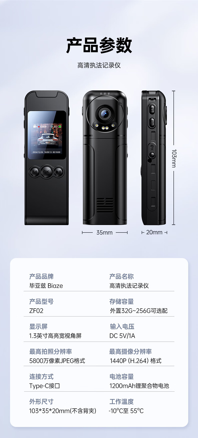 Biaz 법 집행 레코더 소형 비디오 적외선 카메라 장비 HD 1440P 품질 손떨림 방지 야간 투시경