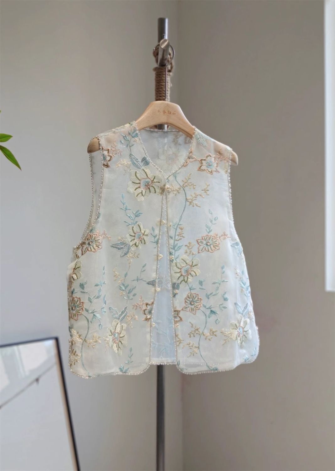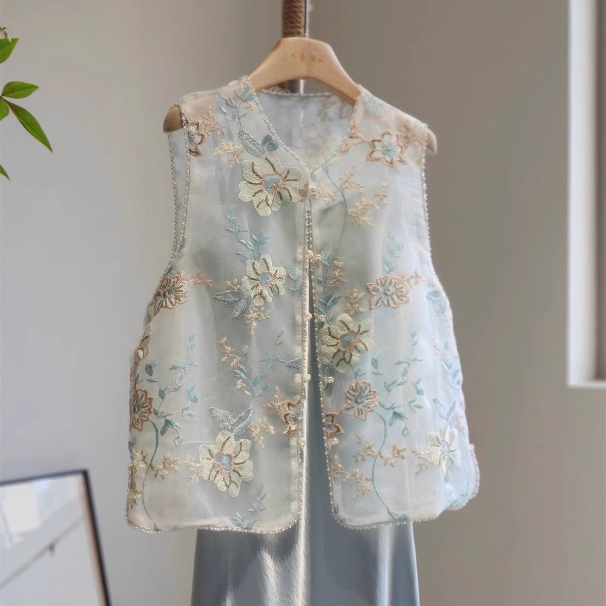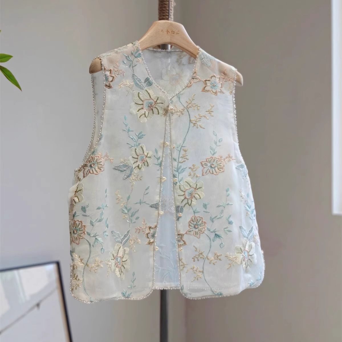 새로운 중국 스타일 아름다운 푸른 조끼 여성의 2025 여름 얇은 오간자 자수 꽃 젊은 Guofeng 조끼 탑스토어 가기