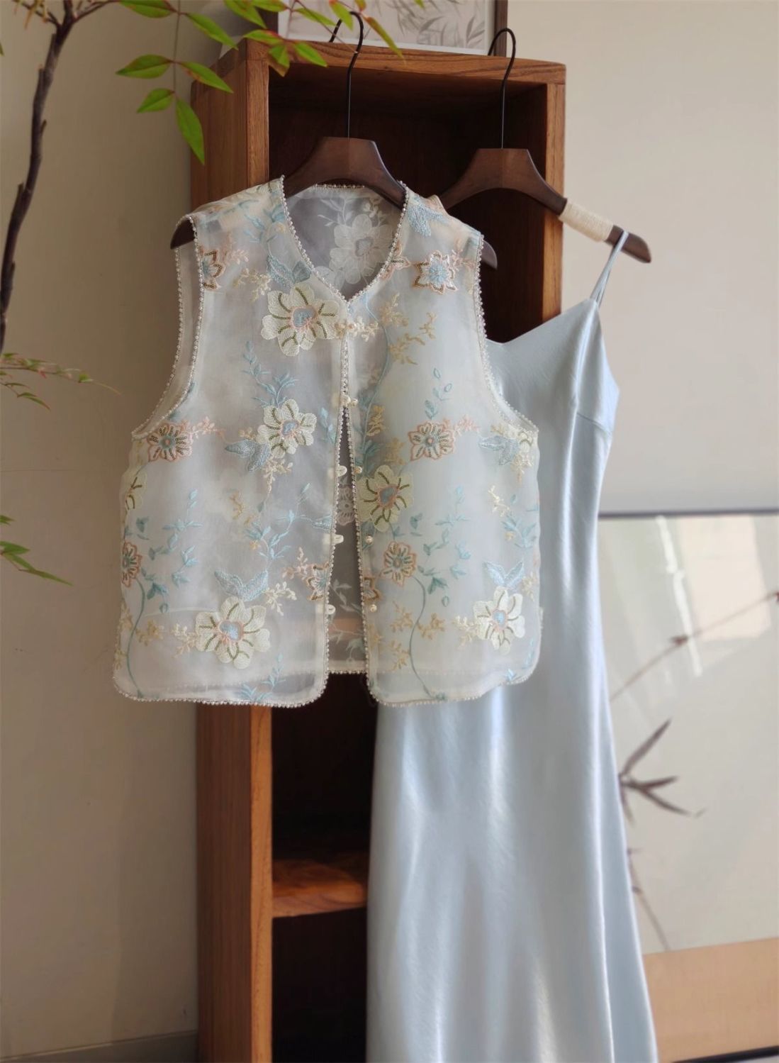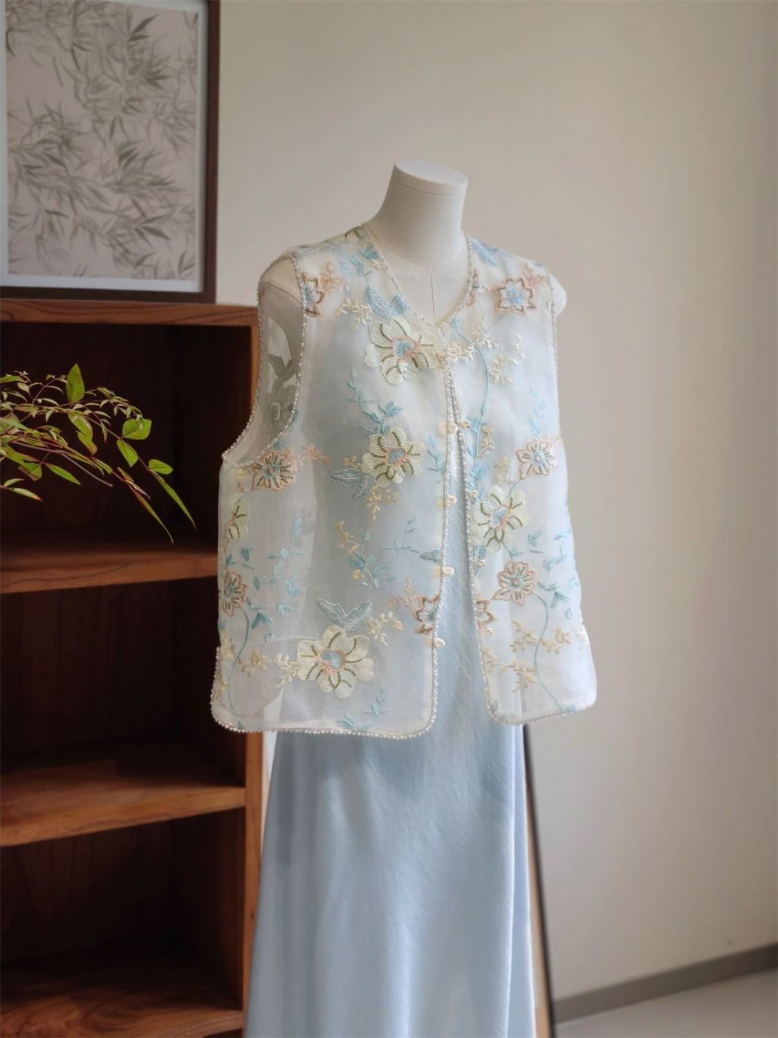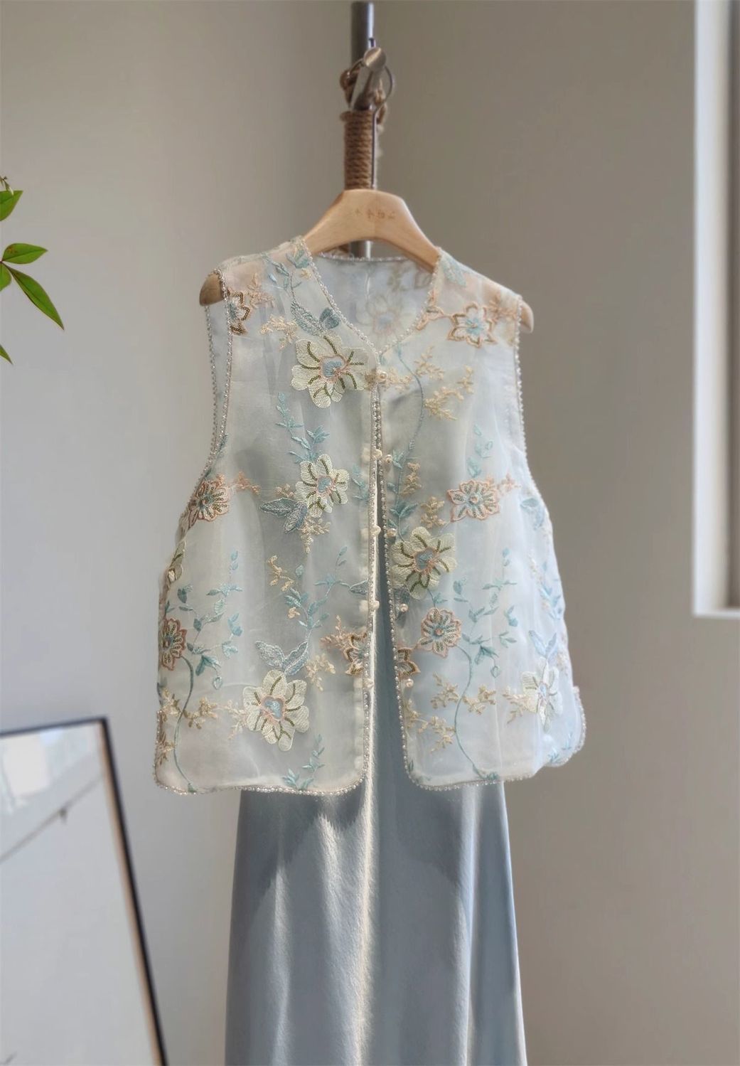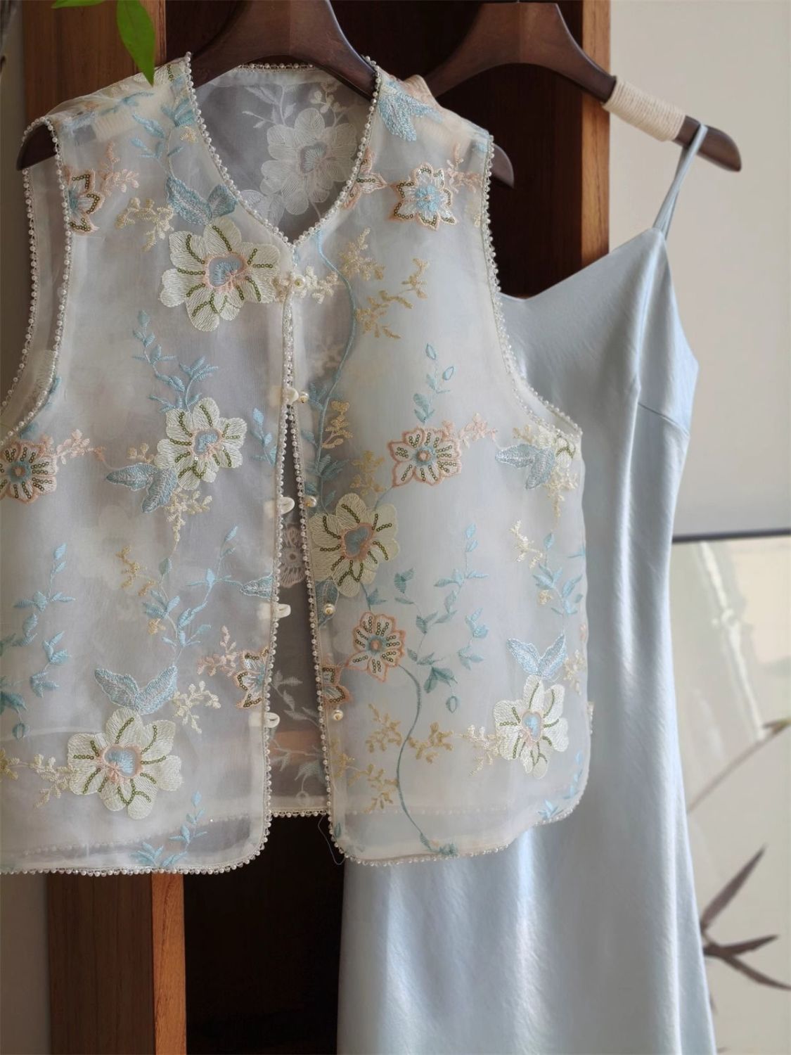 새로운 중국 스타일 아름다운 푸른 조끼 여성의 2025 여름 얇은 오간자 자수 꽃 젊은 Guofeng 조끼 탑스토어 가기