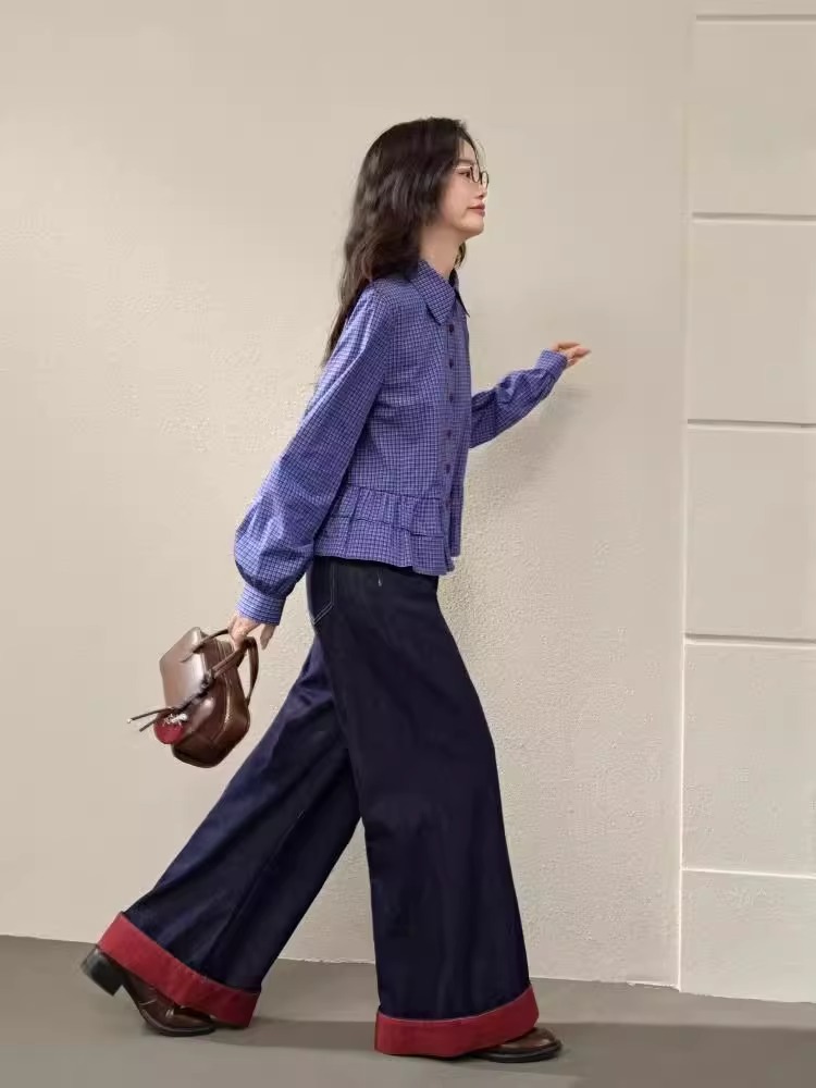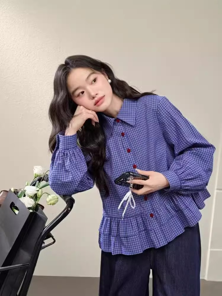 면 함유 miu 블루 체크 무늬 셔츠 여성 2025 봄 신작 러플 긴팔 셔츠 탑 짧은 가을