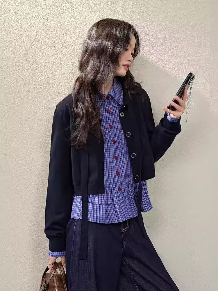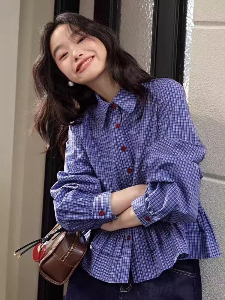 면 함유 miu 블루 체크 무늬 셔츠 여성 2025 봄 신작 러플 긴팔 셔츠 탑 짧은 가을스토어 가기
