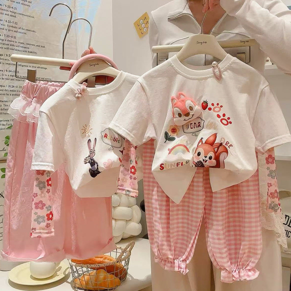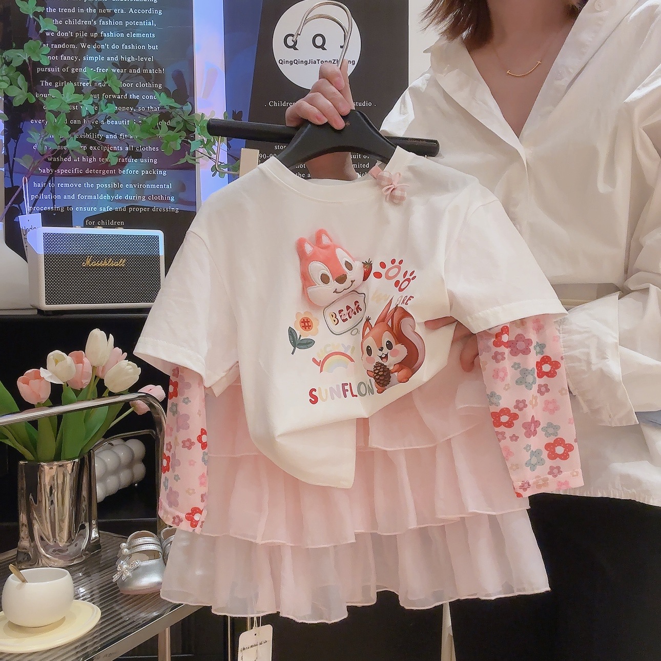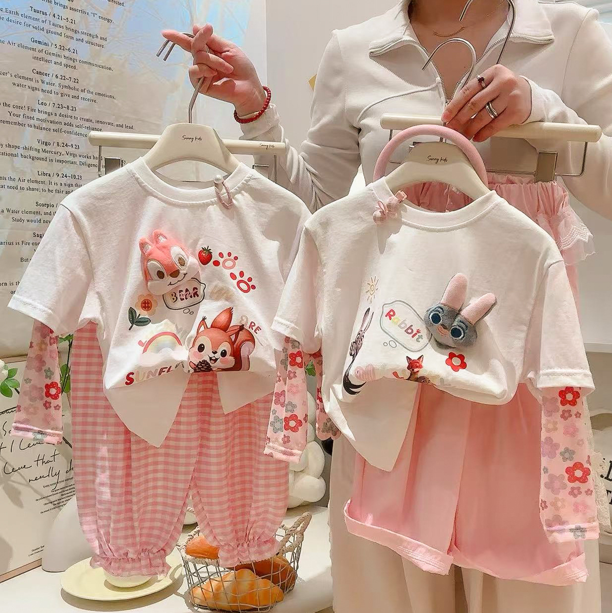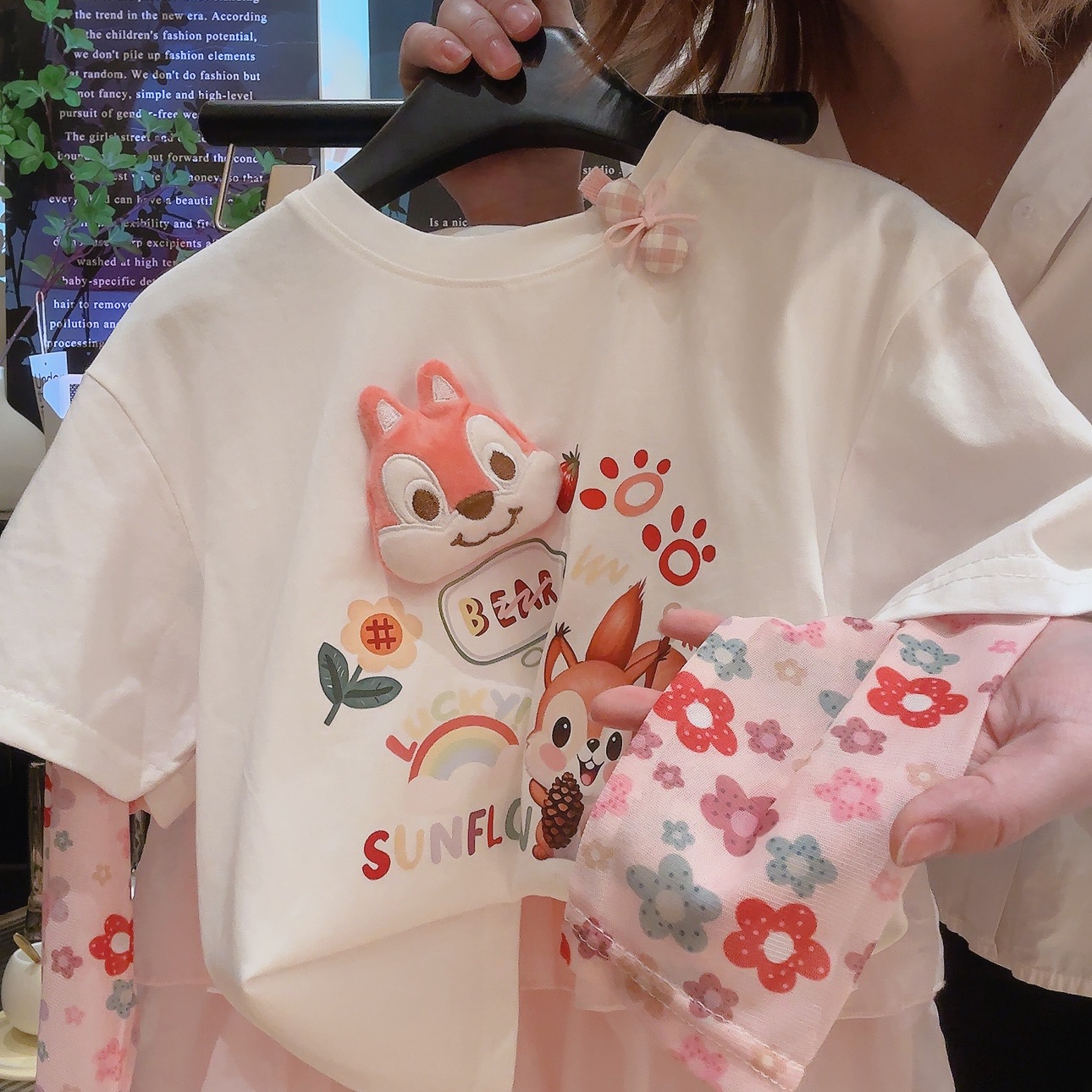 코튼 걸스 만화 인형 가짜 투피스 반소매 티셔츠 여름 2025 새로운 도착 스티칭 메쉬 선 스크린 탑스토어 가기
