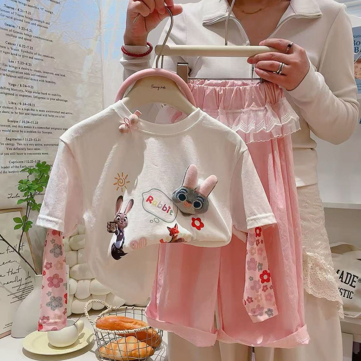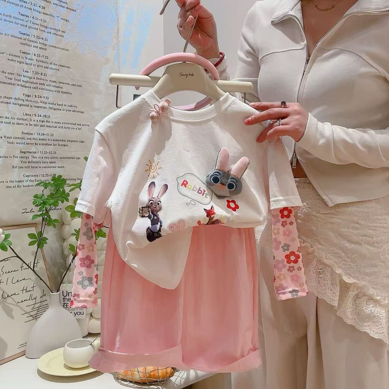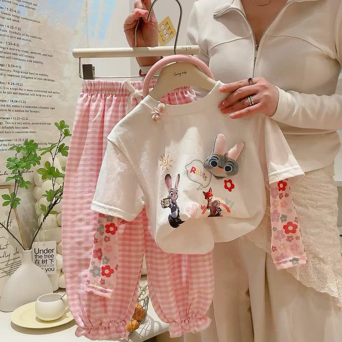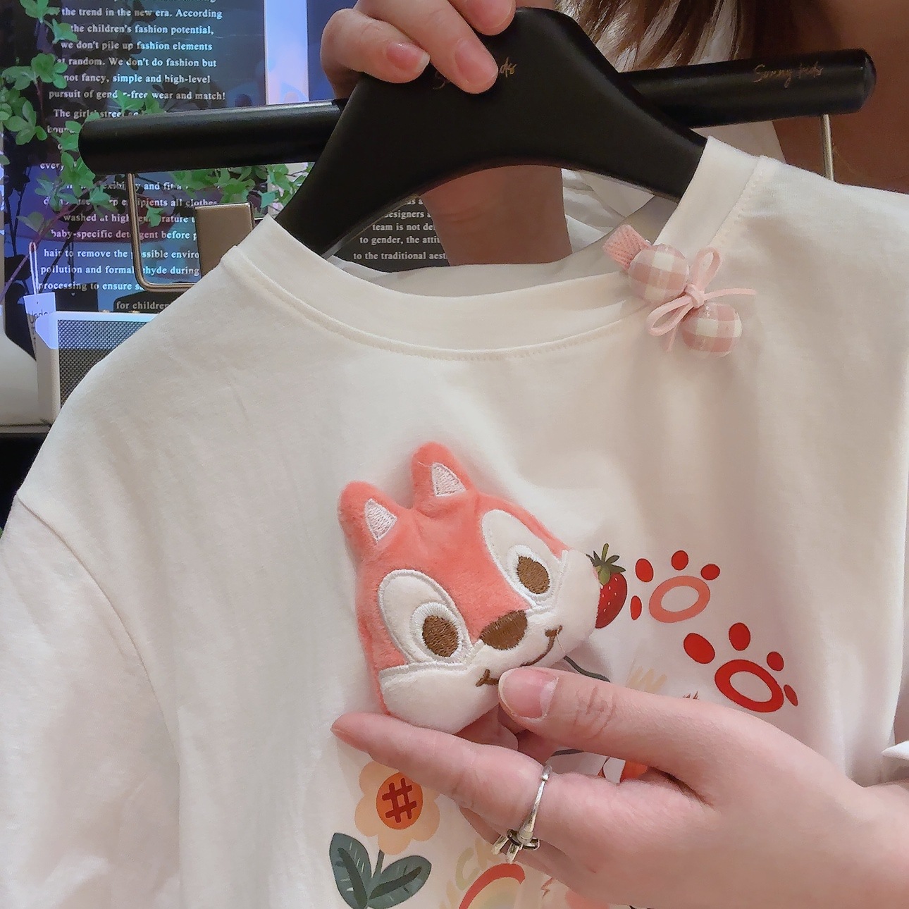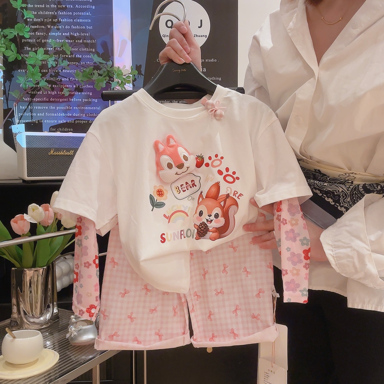 코튼 걸스 만화 인형 가짜 투피스 반소매 티셔츠 여름 2025 새로운 도착 스티칭 메쉬 선 스크린 탑스토어 가기