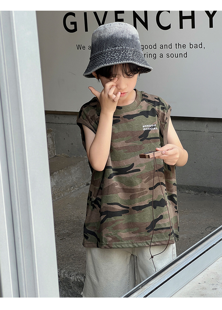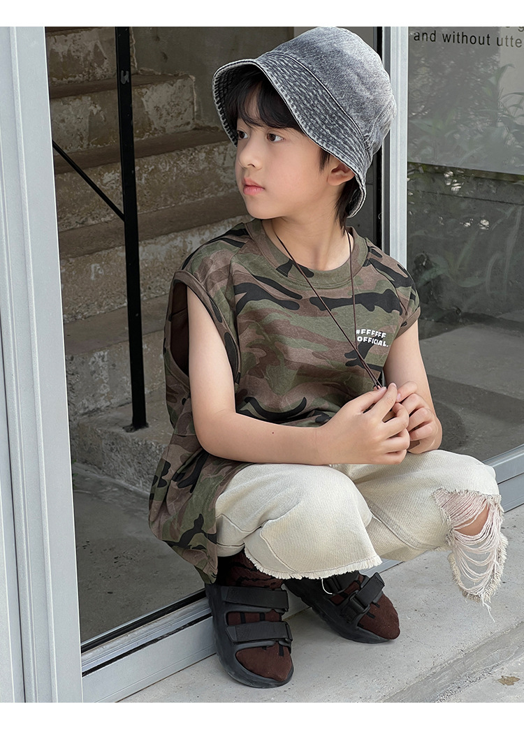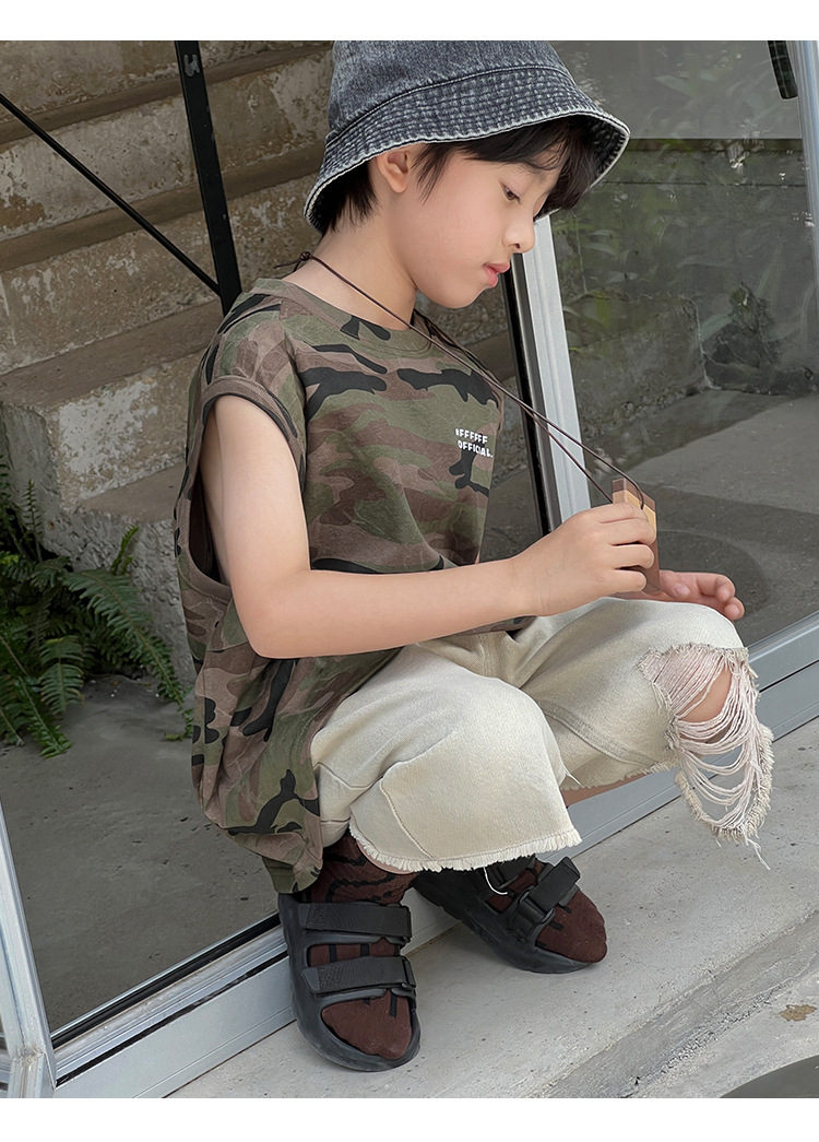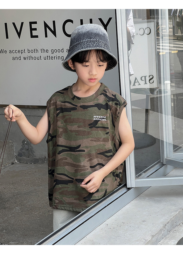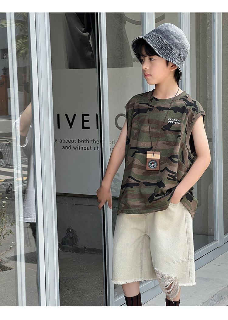 2026년 여름 트렌드 신상품 남아용 한국 스타일 루즈핏 캐주얼 민소매 패션 카모플라주 멋진 풀오버 조끼