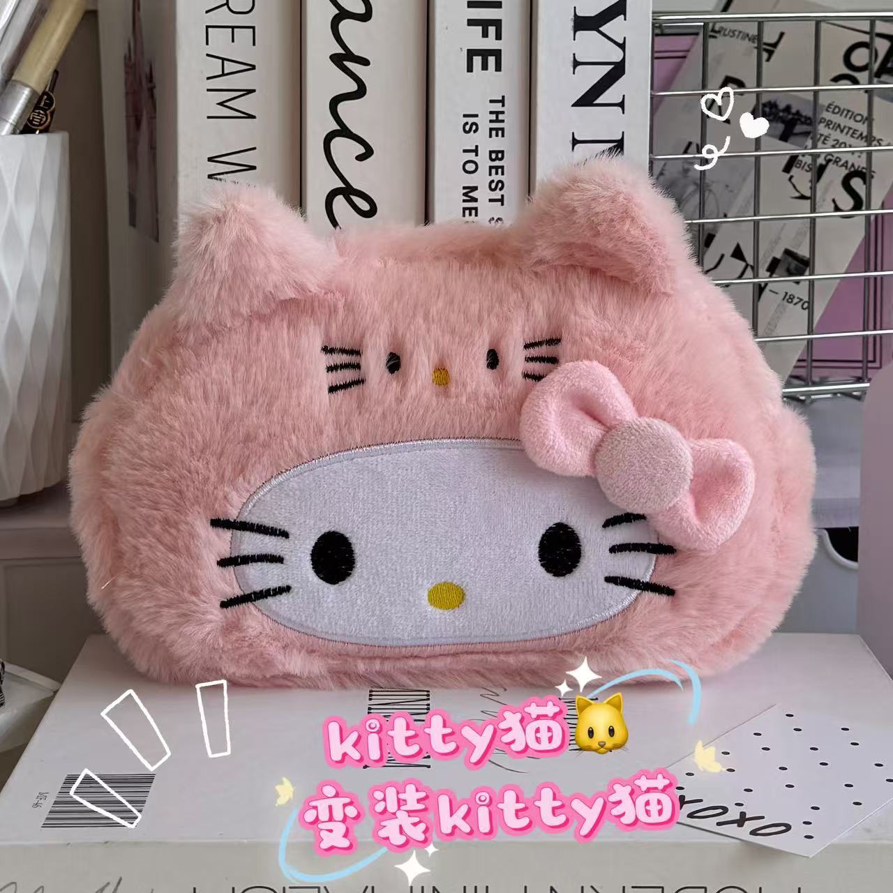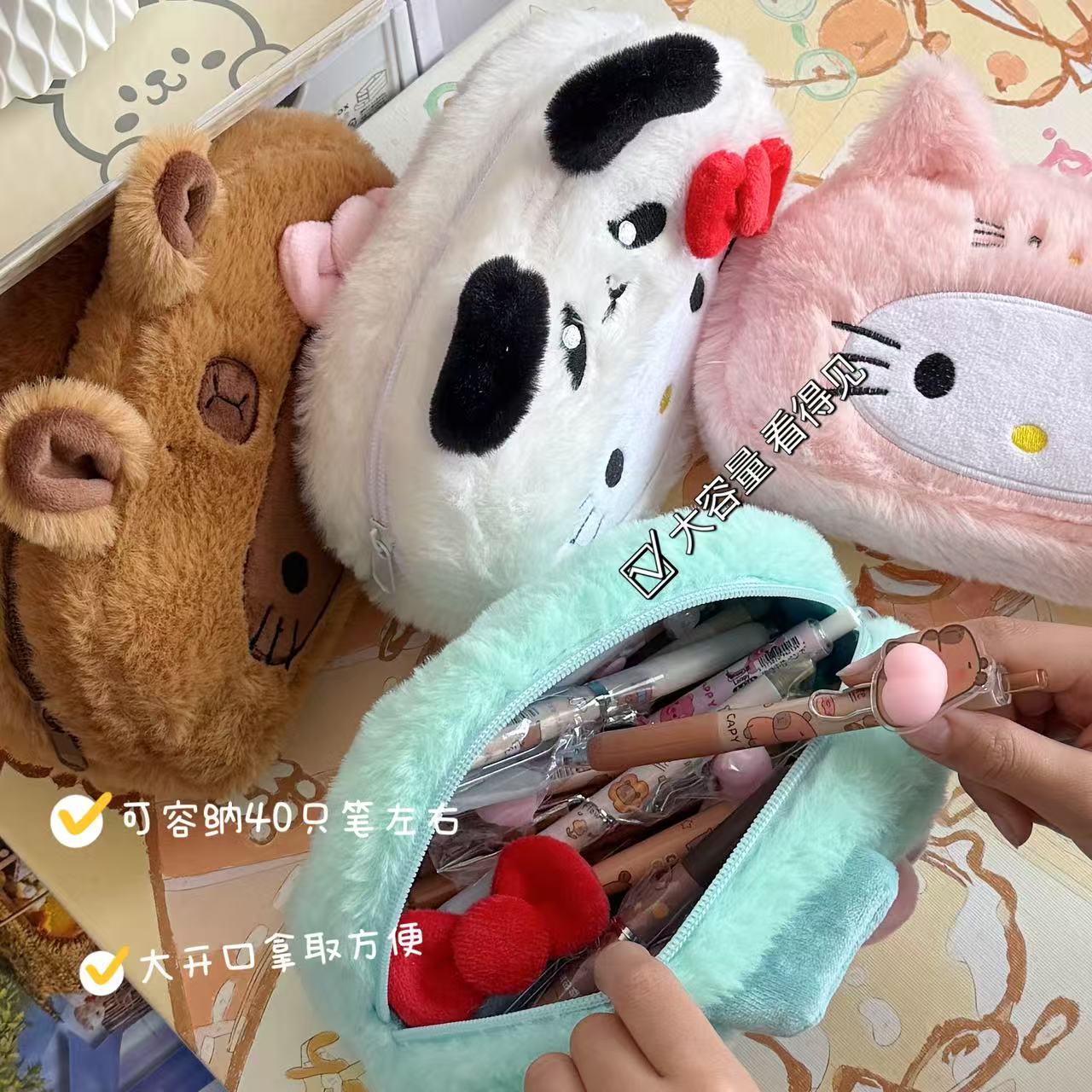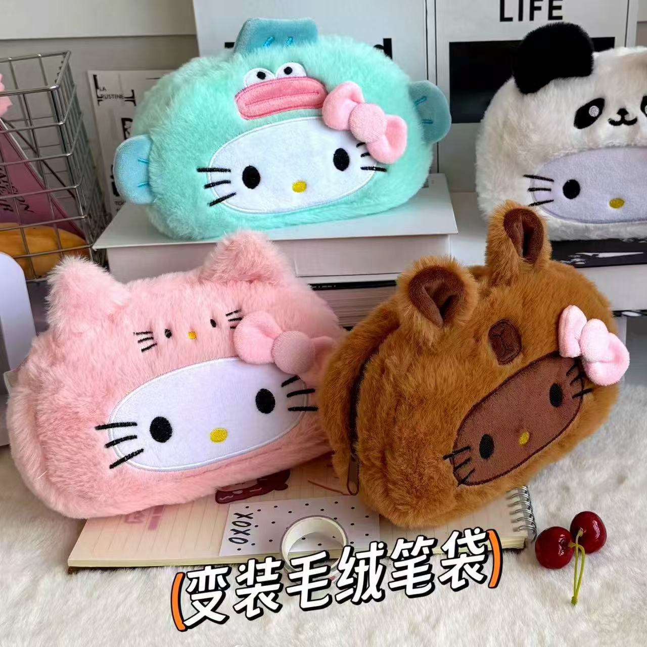 새로운 귀여운 헬로키티 펜 가방 플러시 드레스 업 비버 루비 고급스러운 소녀 대용량 문구 가방