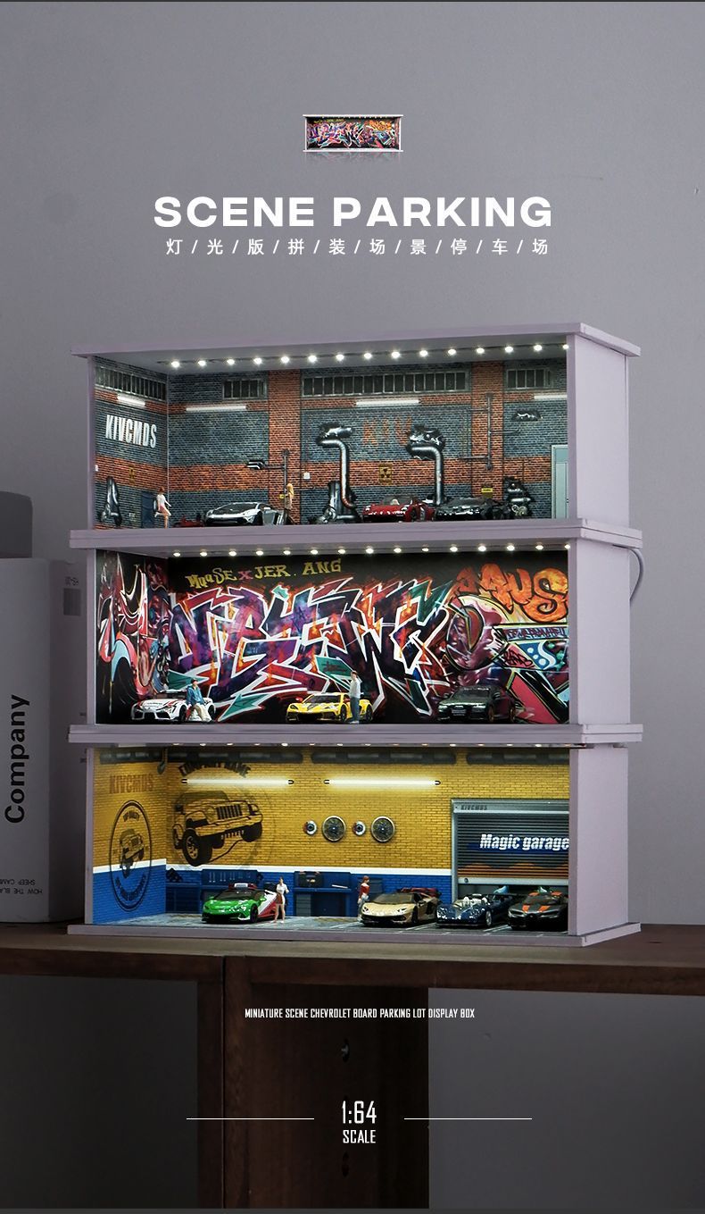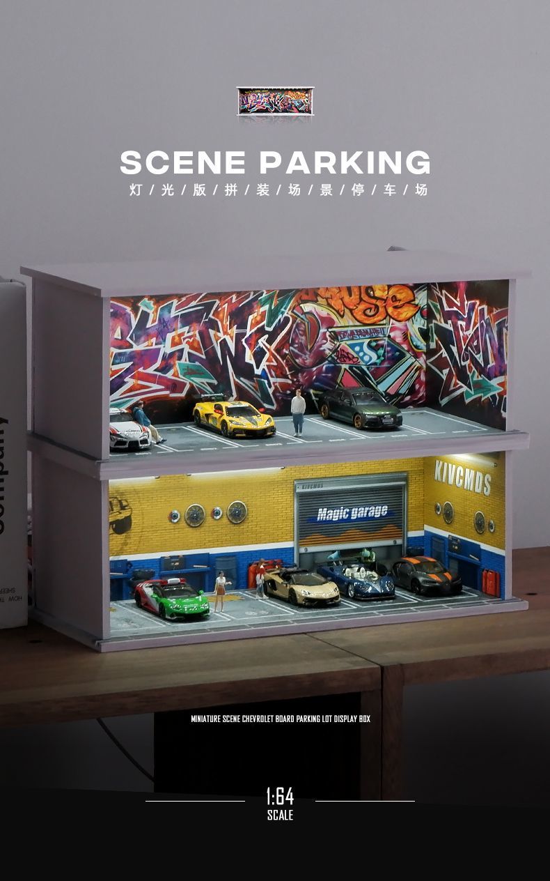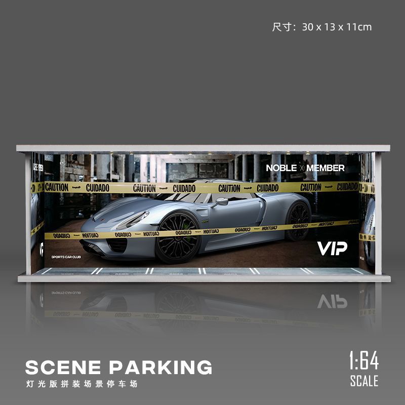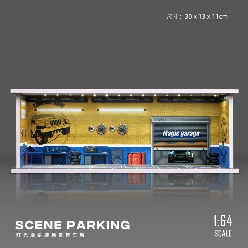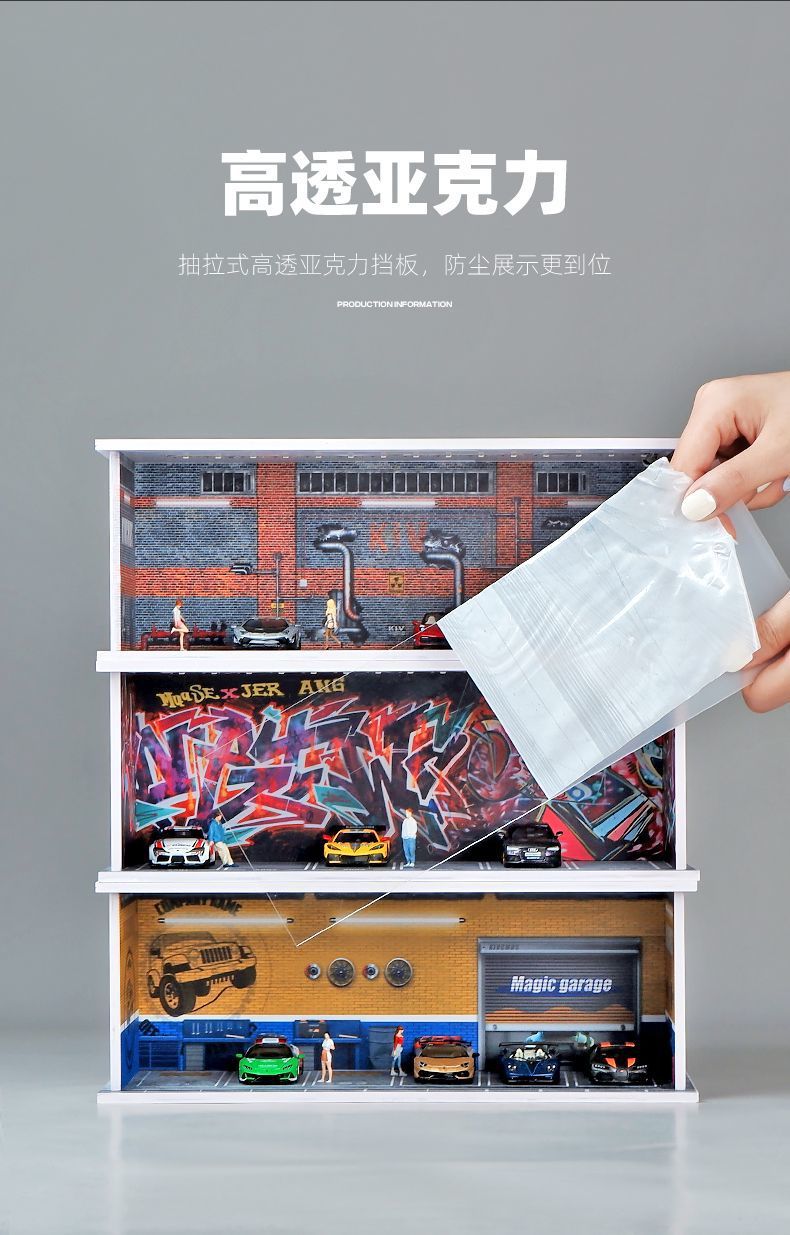 1:64 고투명 아크릴 조명 버전 PVC 조립 차고 장면 시뮬레이션 소형 자동차 모델 디스플레이 스탠드