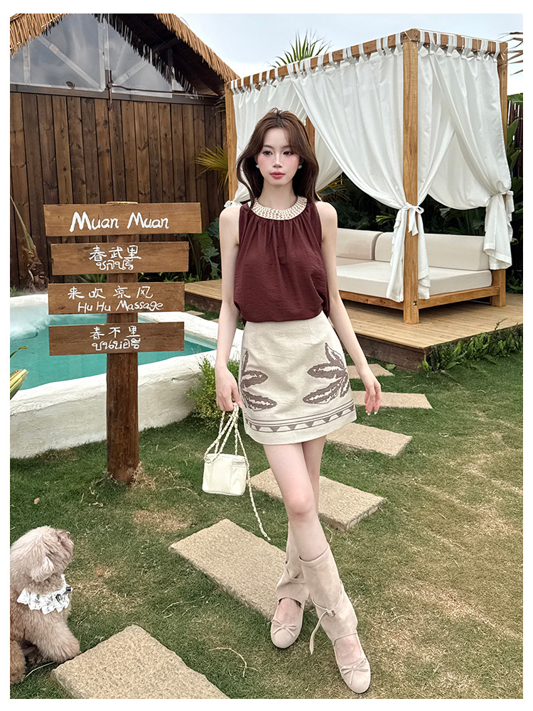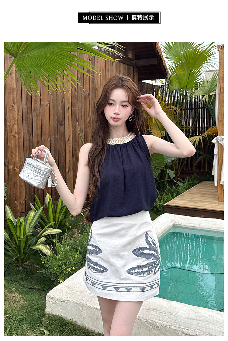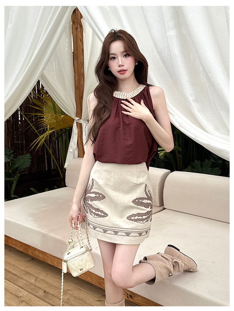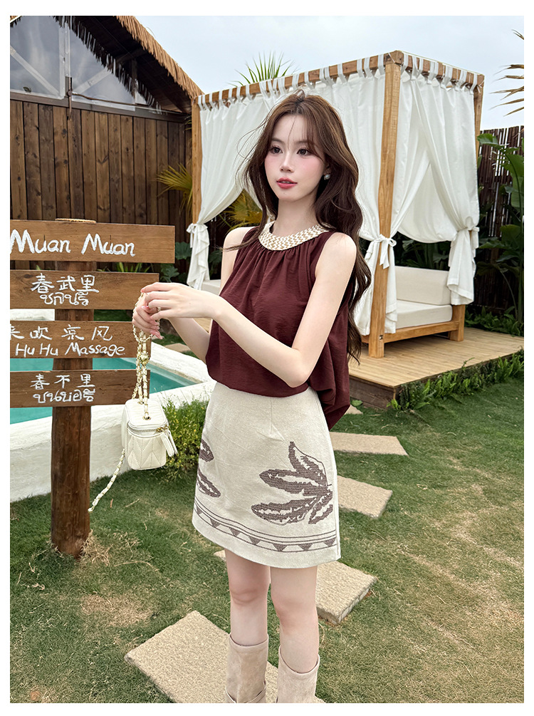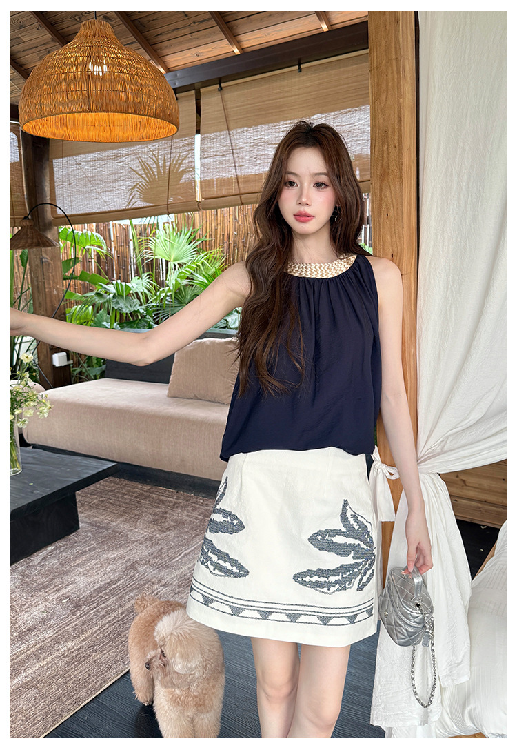 하이 퀄리티 여름 새로운 달콤한 우아한 민소매 쉬폰 셔츠 자수 스커트 투피스 세트 여성 패션 세트스토어 가기