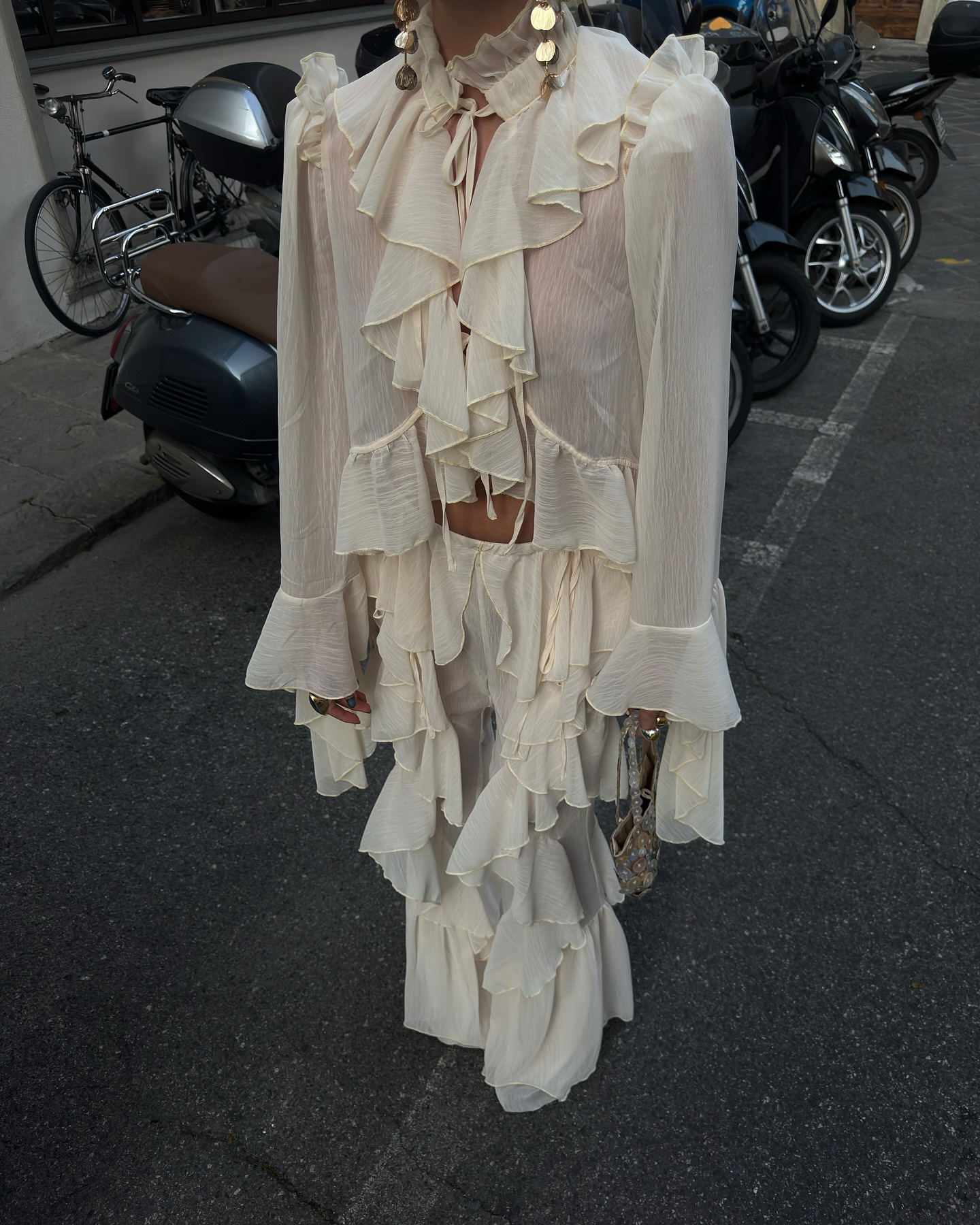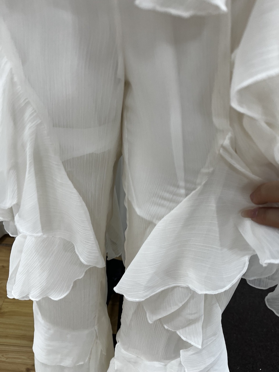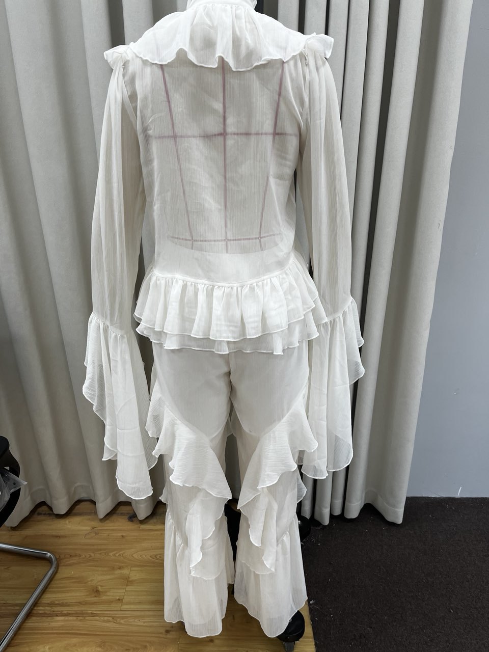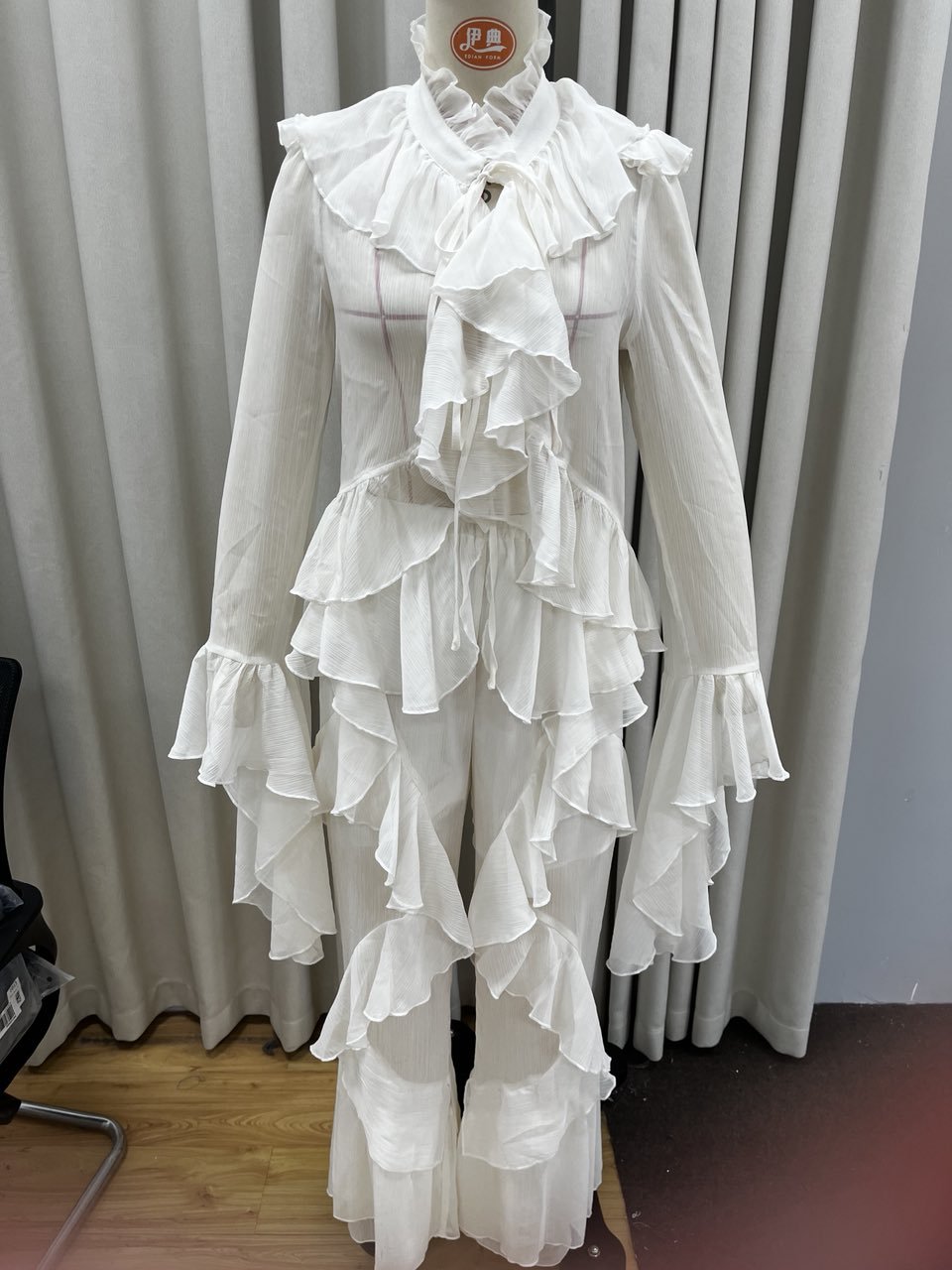 시폰 레이스 스탠드 칼라 레이스 러플 호른 슬리브 탑 2 피스 크로스 보더 유럽과 미국 패션 느슨한 세트스토어 가기