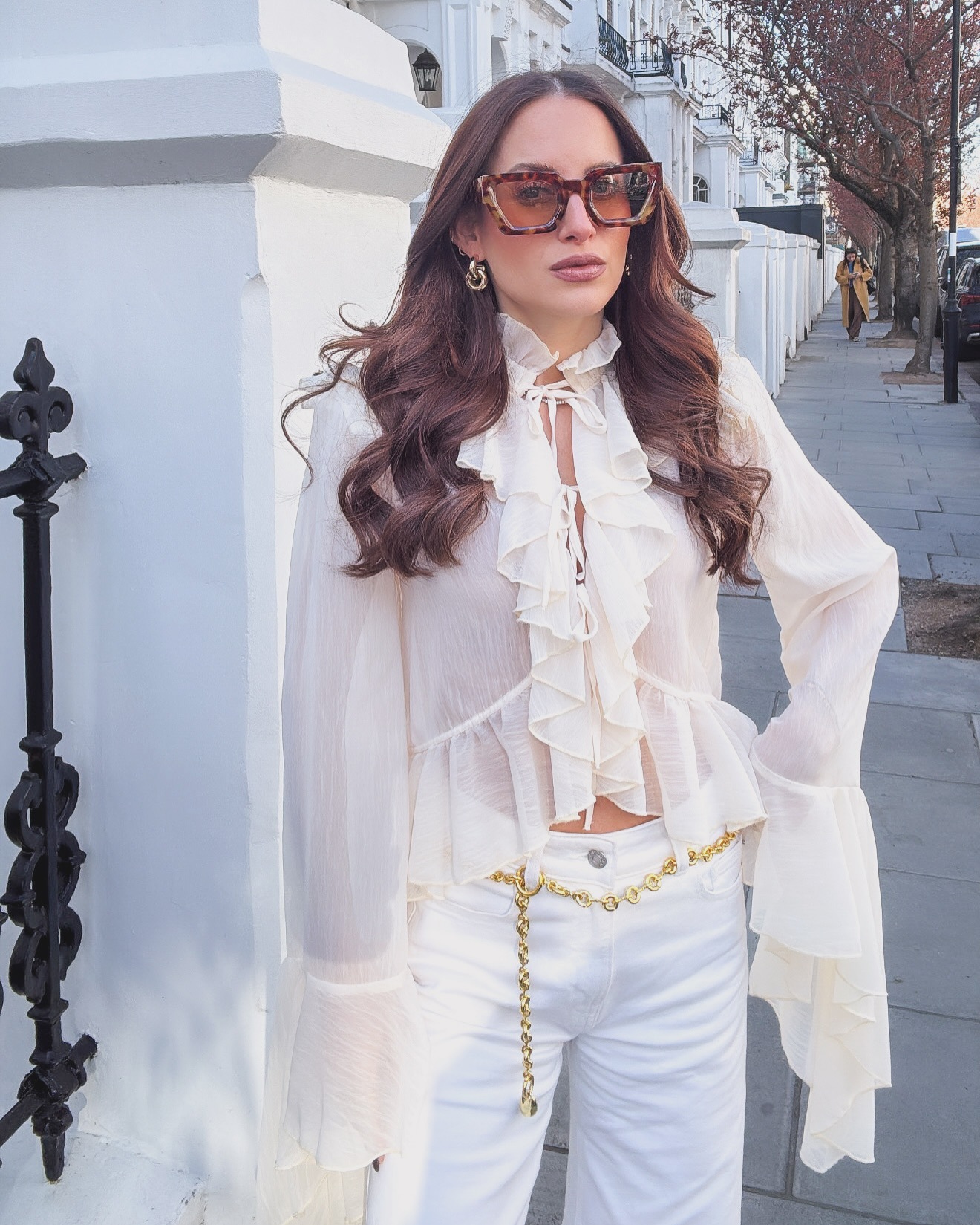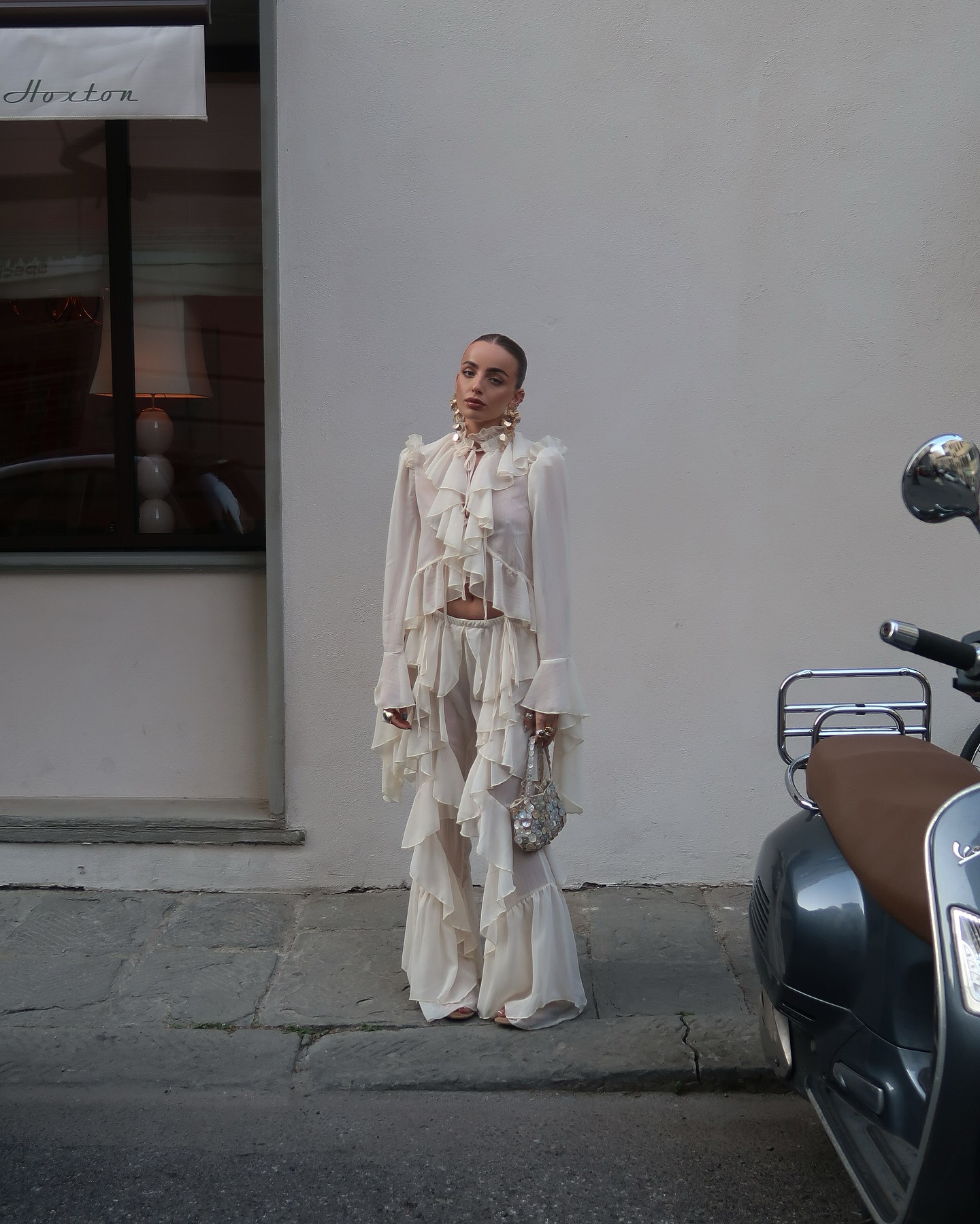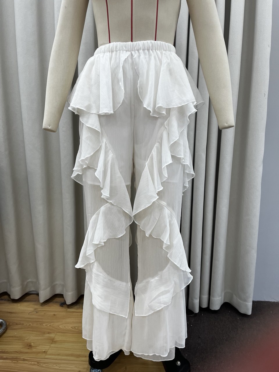 시폰 레이스 스탠드 칼라 레이스 러플 호른 슬리브 탑 2 피스 크로스 보더 유럽과 미국 패션 느슨한 세트스토어 가기