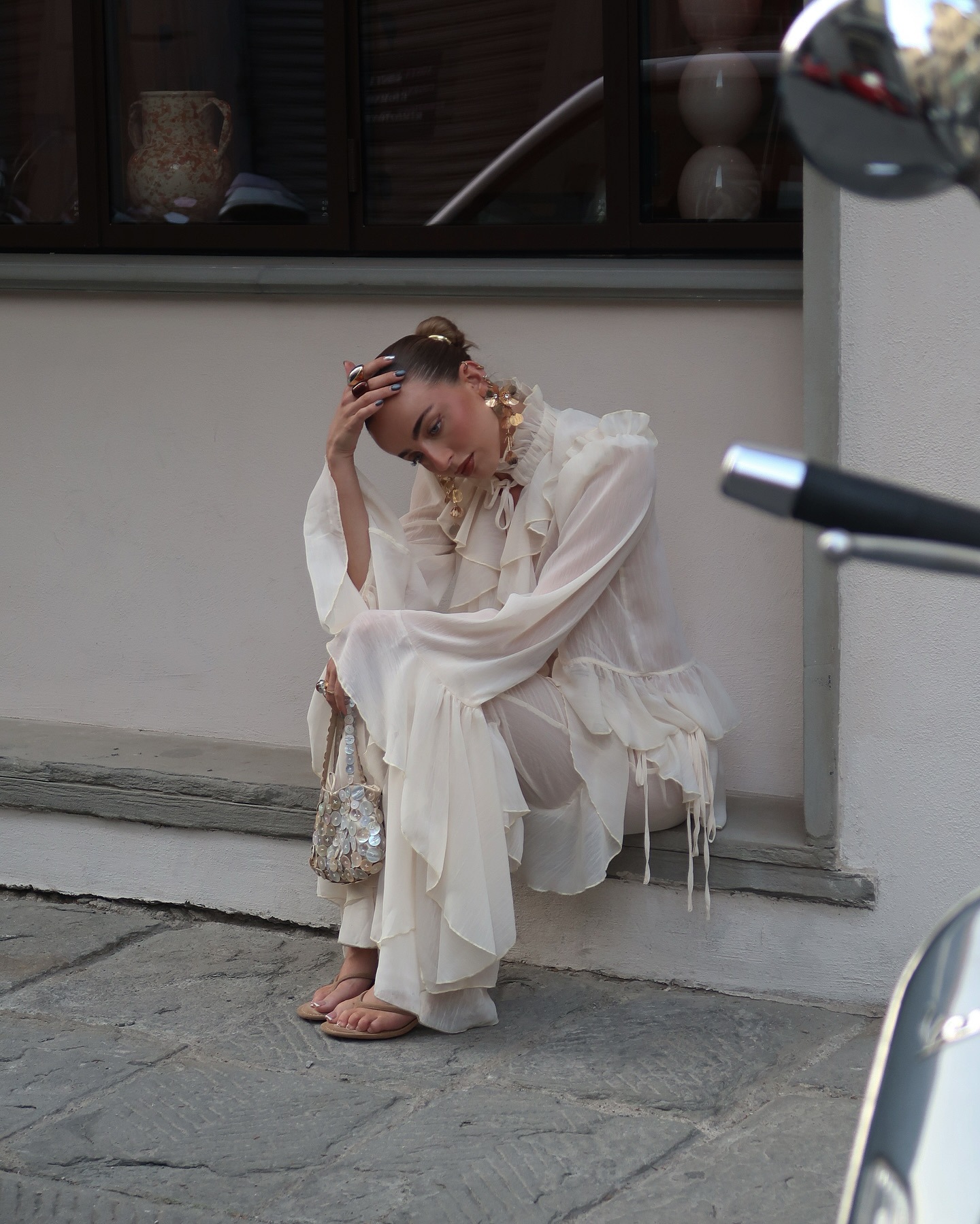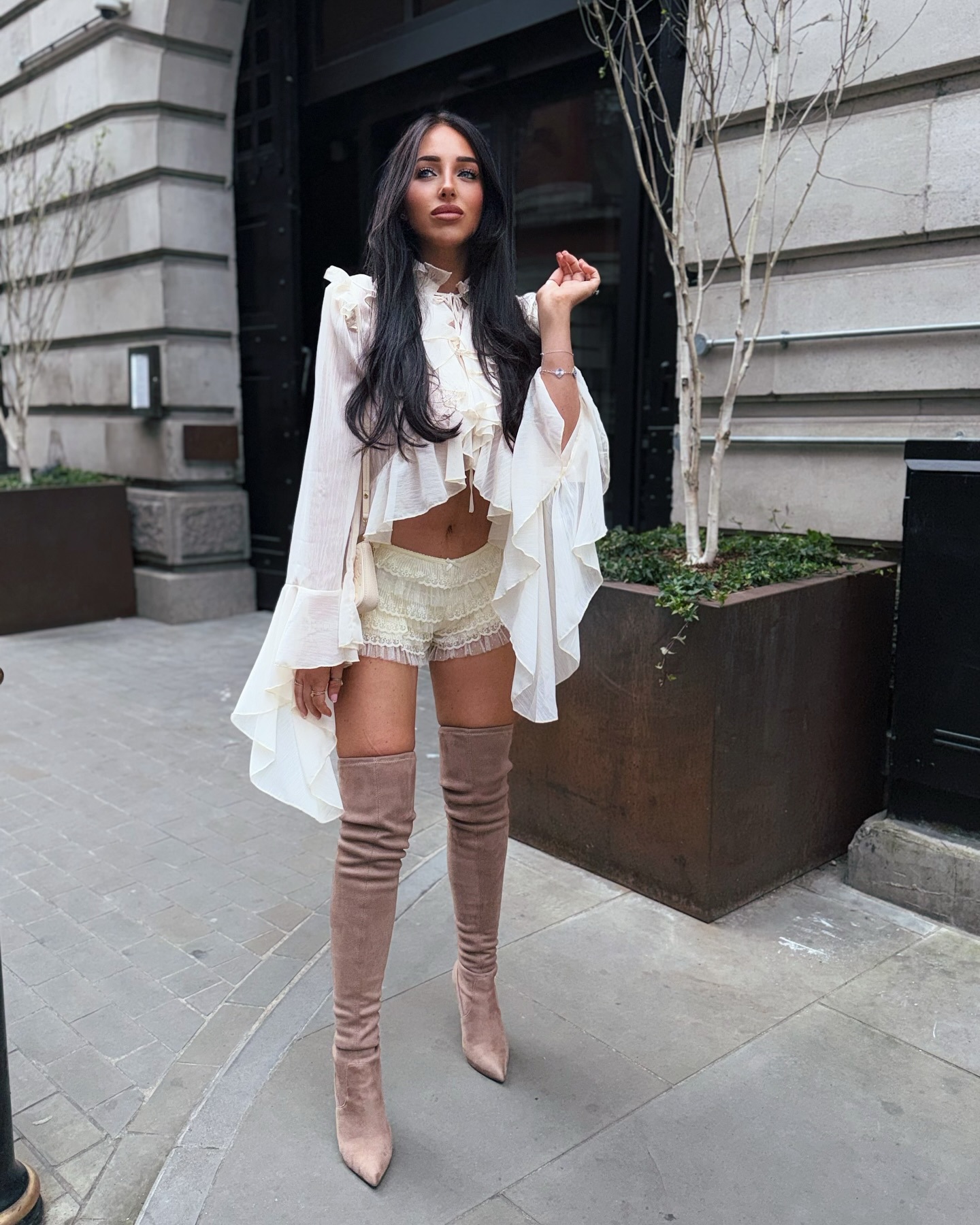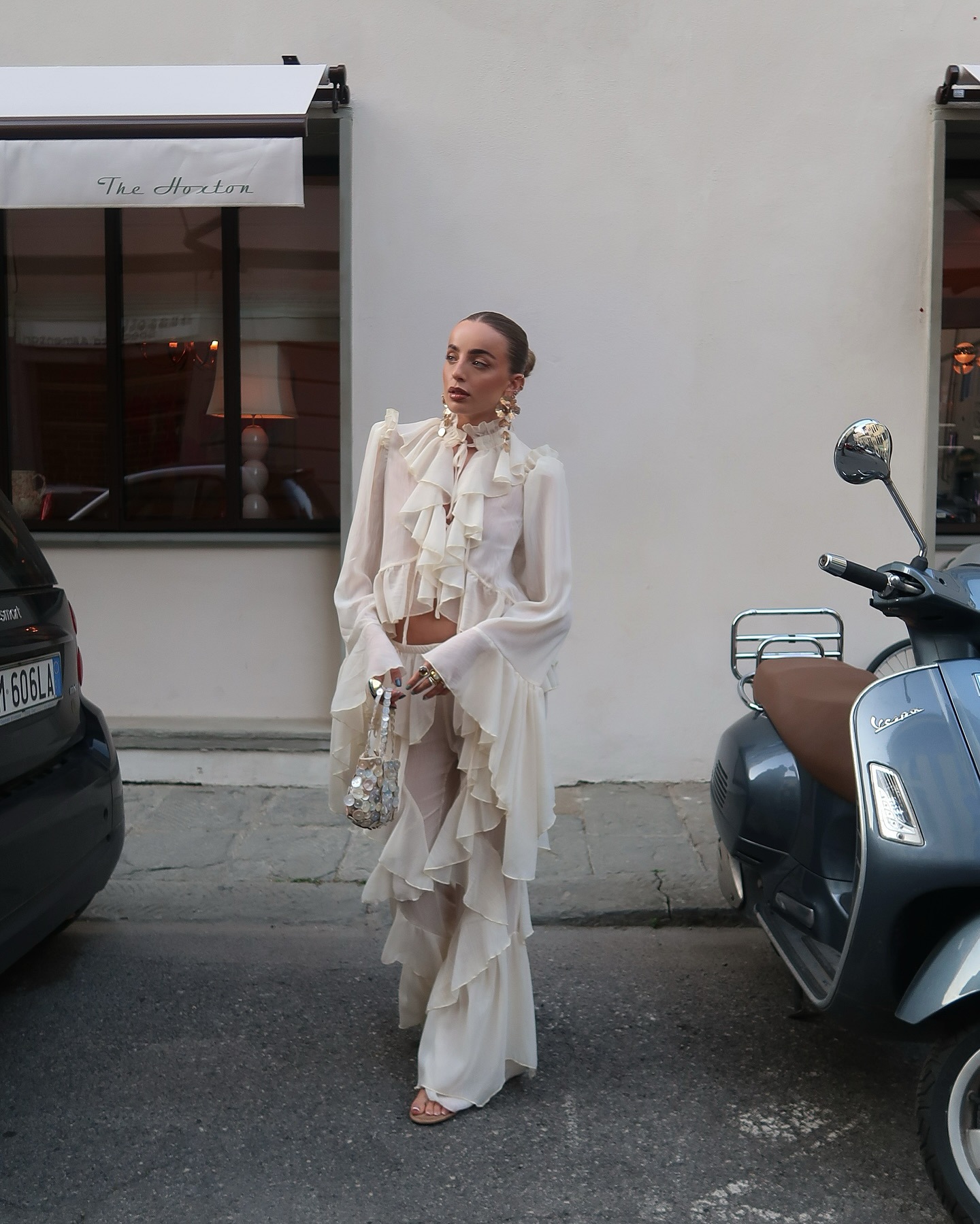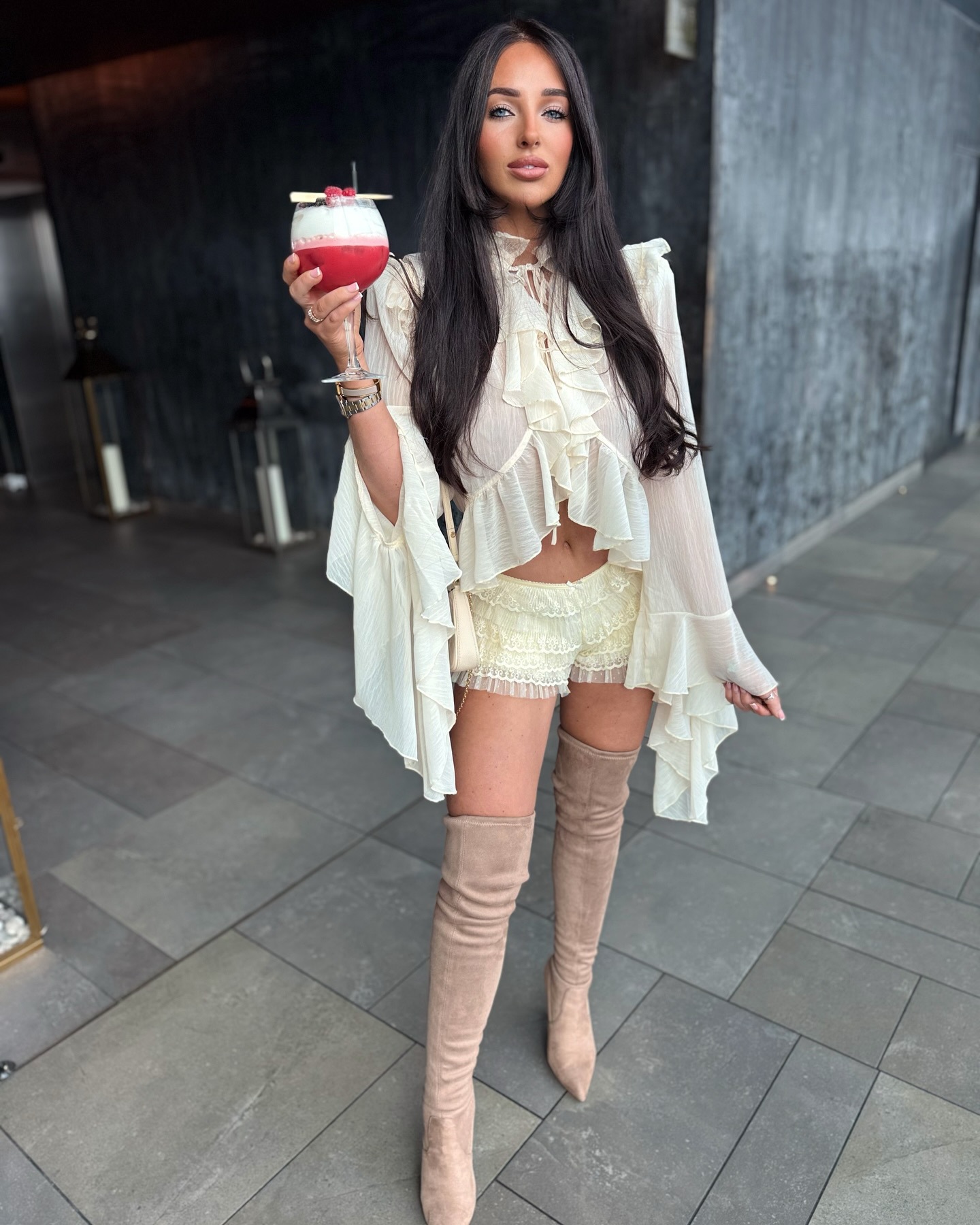 시폰 레이스 스탠드 칼라 레이스 러플 호른 슬리브 탑 2 피스 크로스 보더 유럽과 미국 패션 느슨한 세트스토어 가기