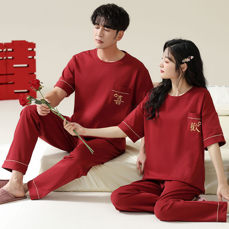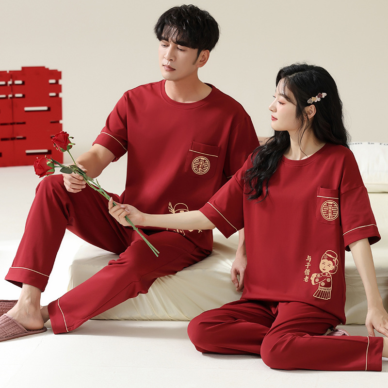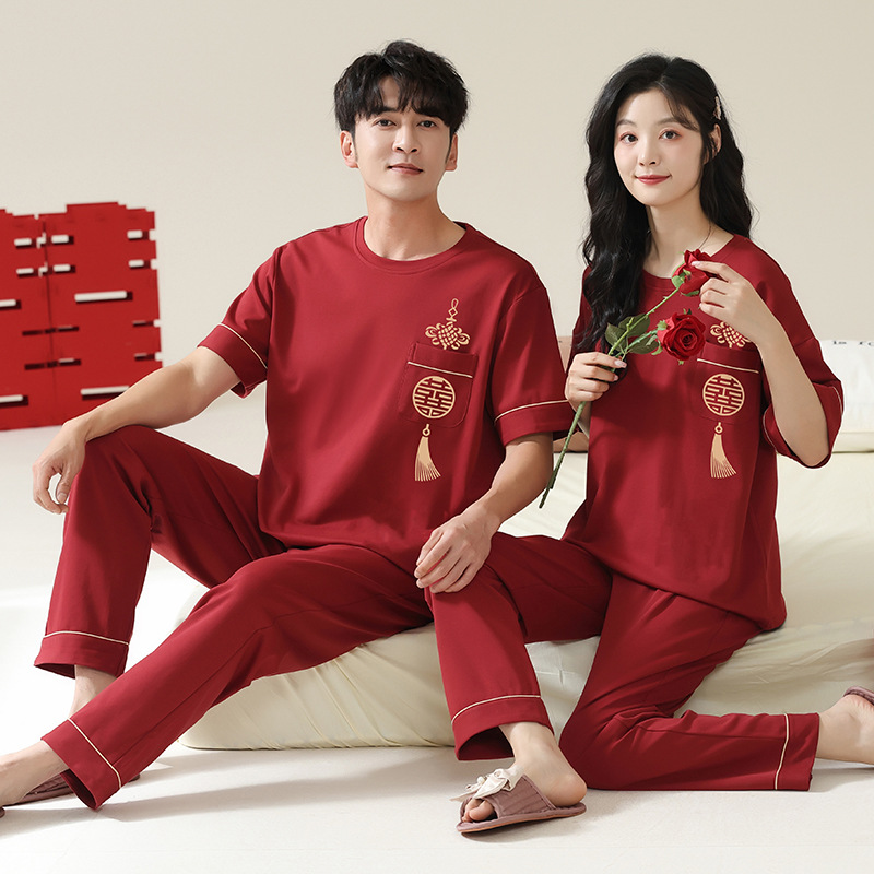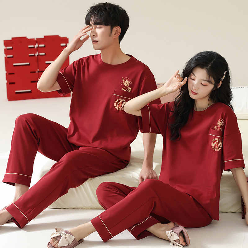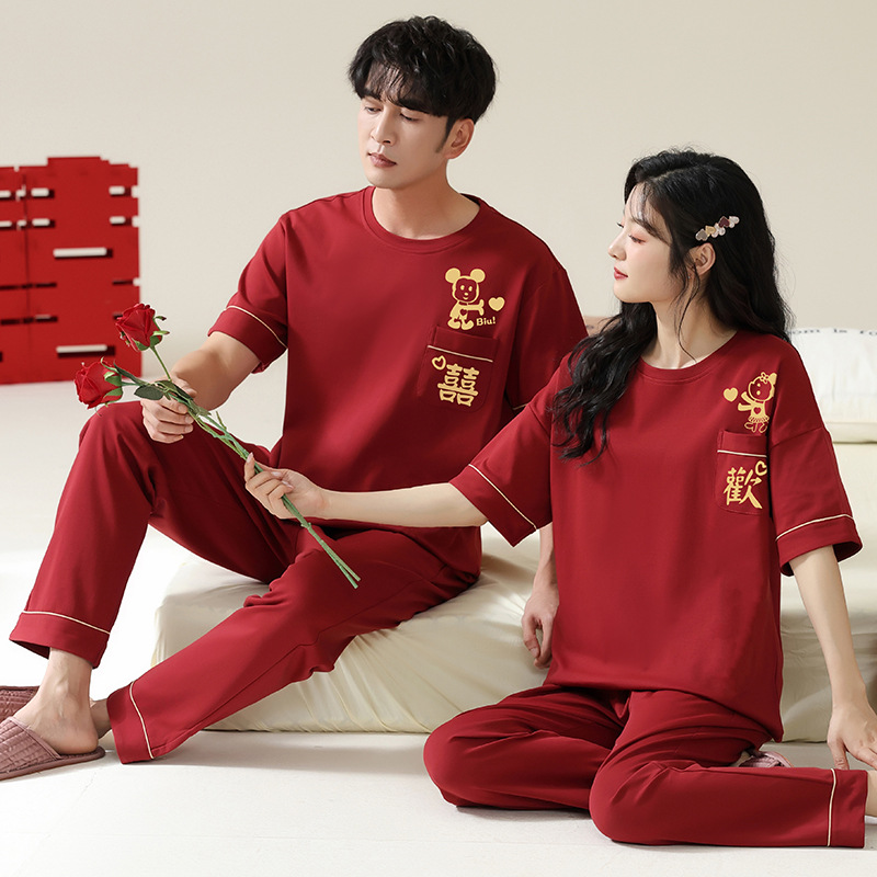 커플을 위한 봄, 가을 라운드 넥 잠옷, 새해를 맞이하는 빨간색, 신혼 부부, 순면 반팔 바지, 축제 빨간색 면 잠옷스토어 가기
