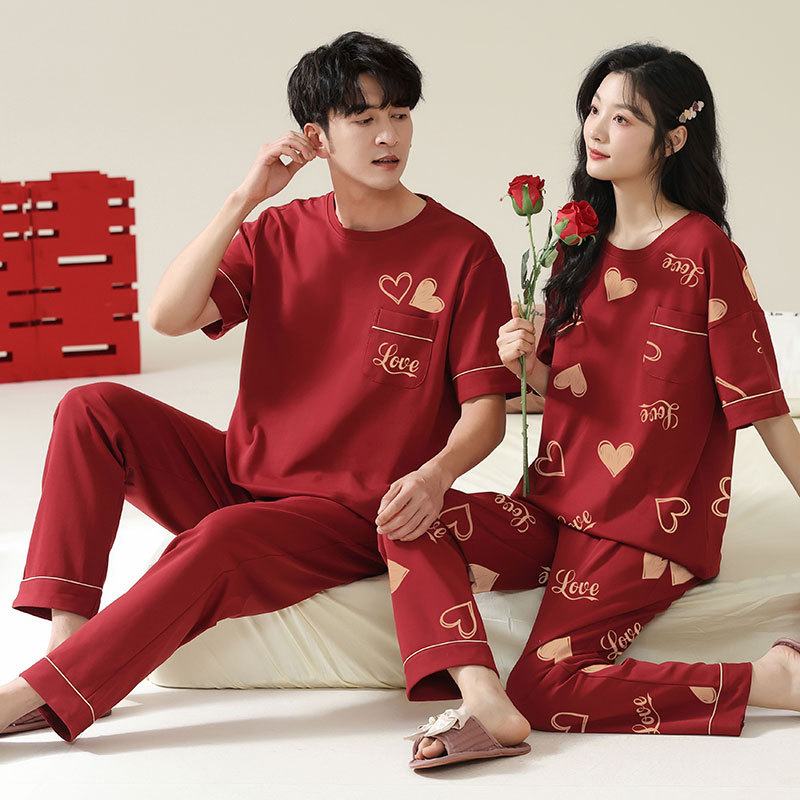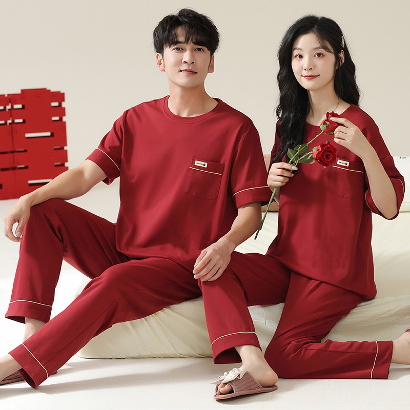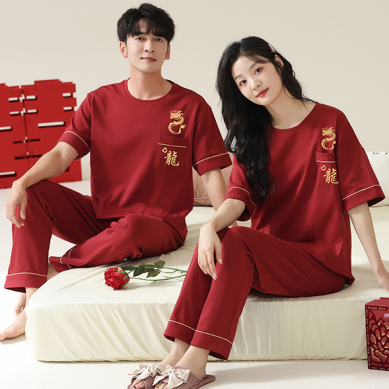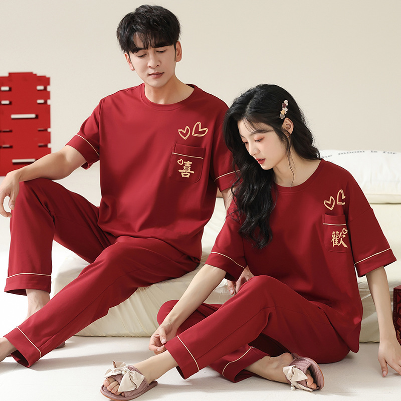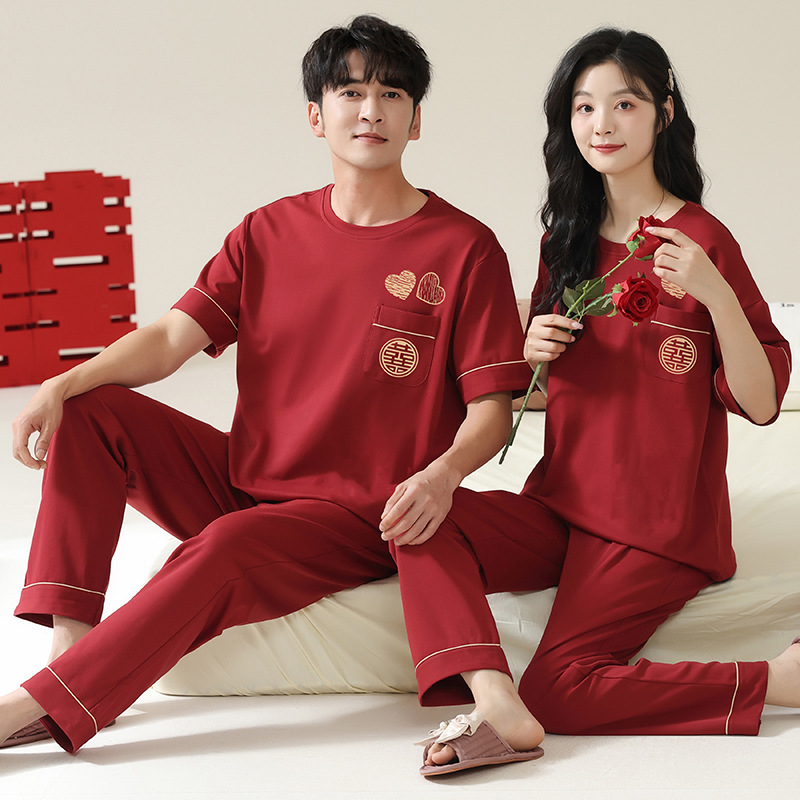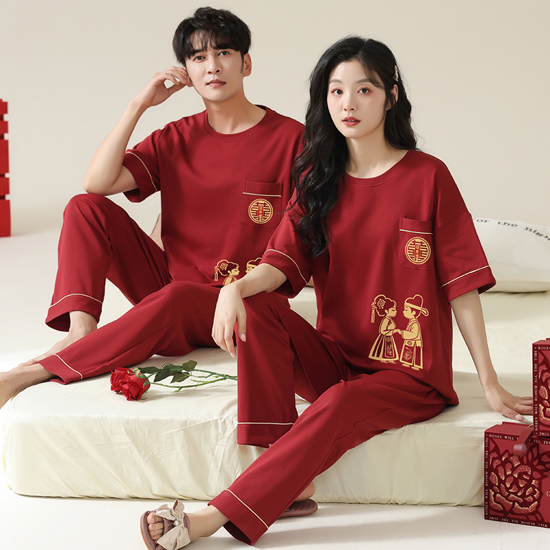커플을 위한 봄, 가을 라운드 넥 잠옷, 새해를 맞이하는 빨간색, 신혼 부부, 순면 반팔 바지, 축제 빨간색 면 잠옷스토어 가기