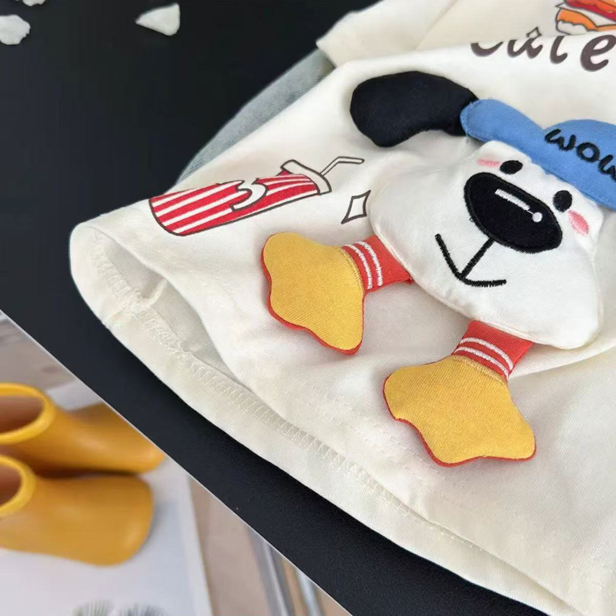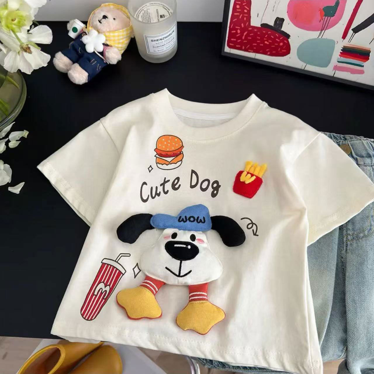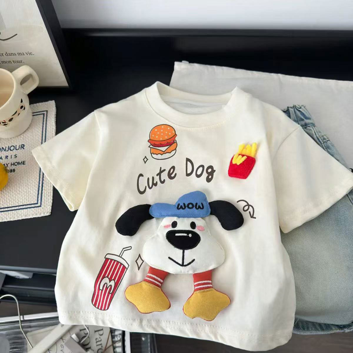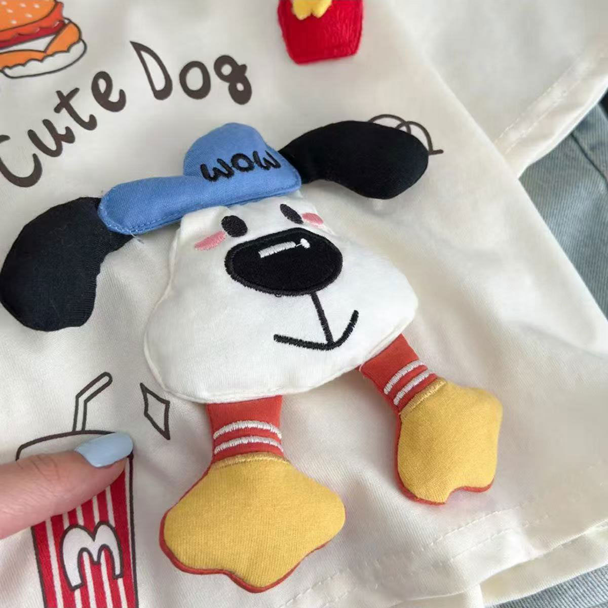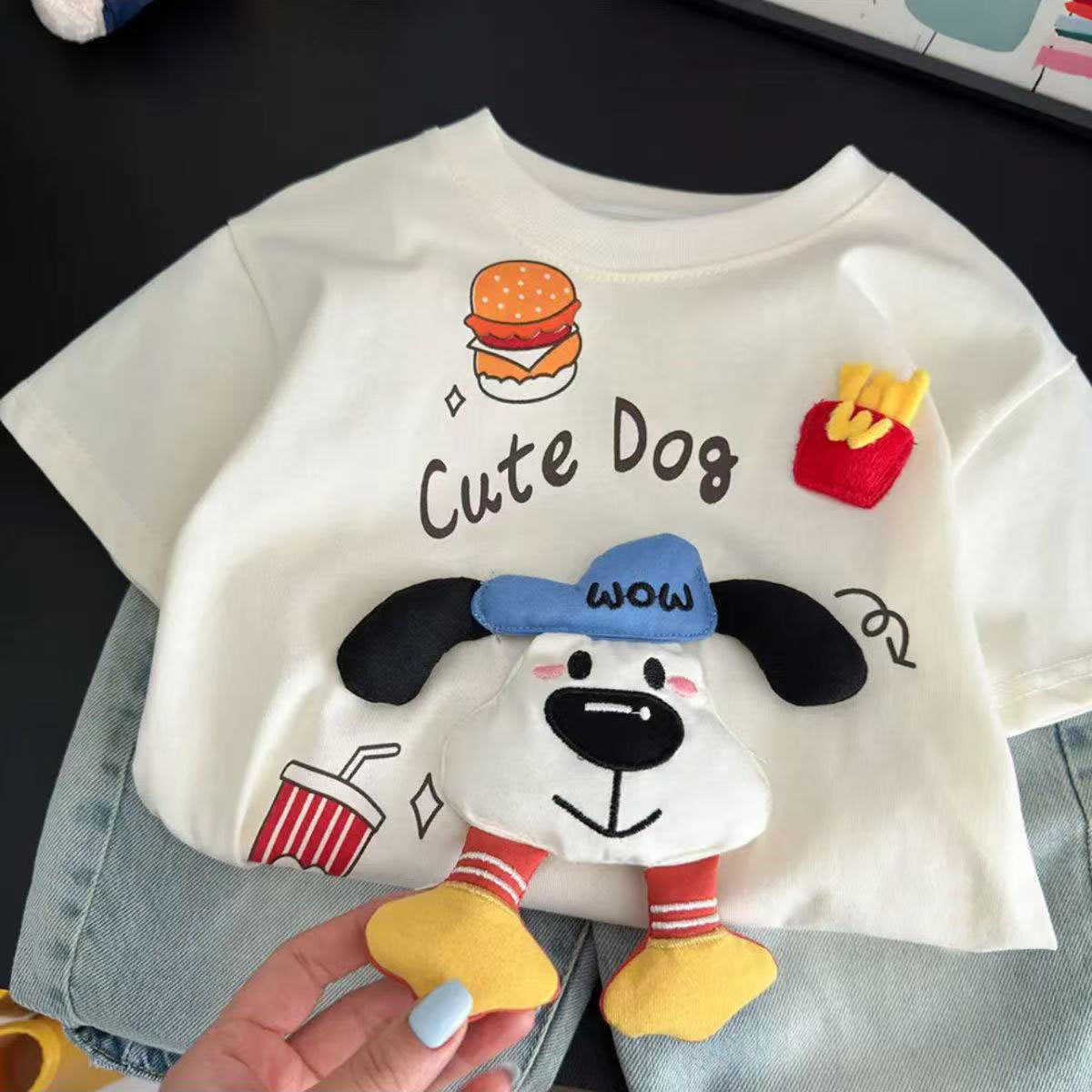 여름 만화 짧은 소매 새로운 남성과 여성의 아동복 귀여운 3 차원 강아지 인형 올 매치 패션 아기 둥근 목 어린이스토어 가기